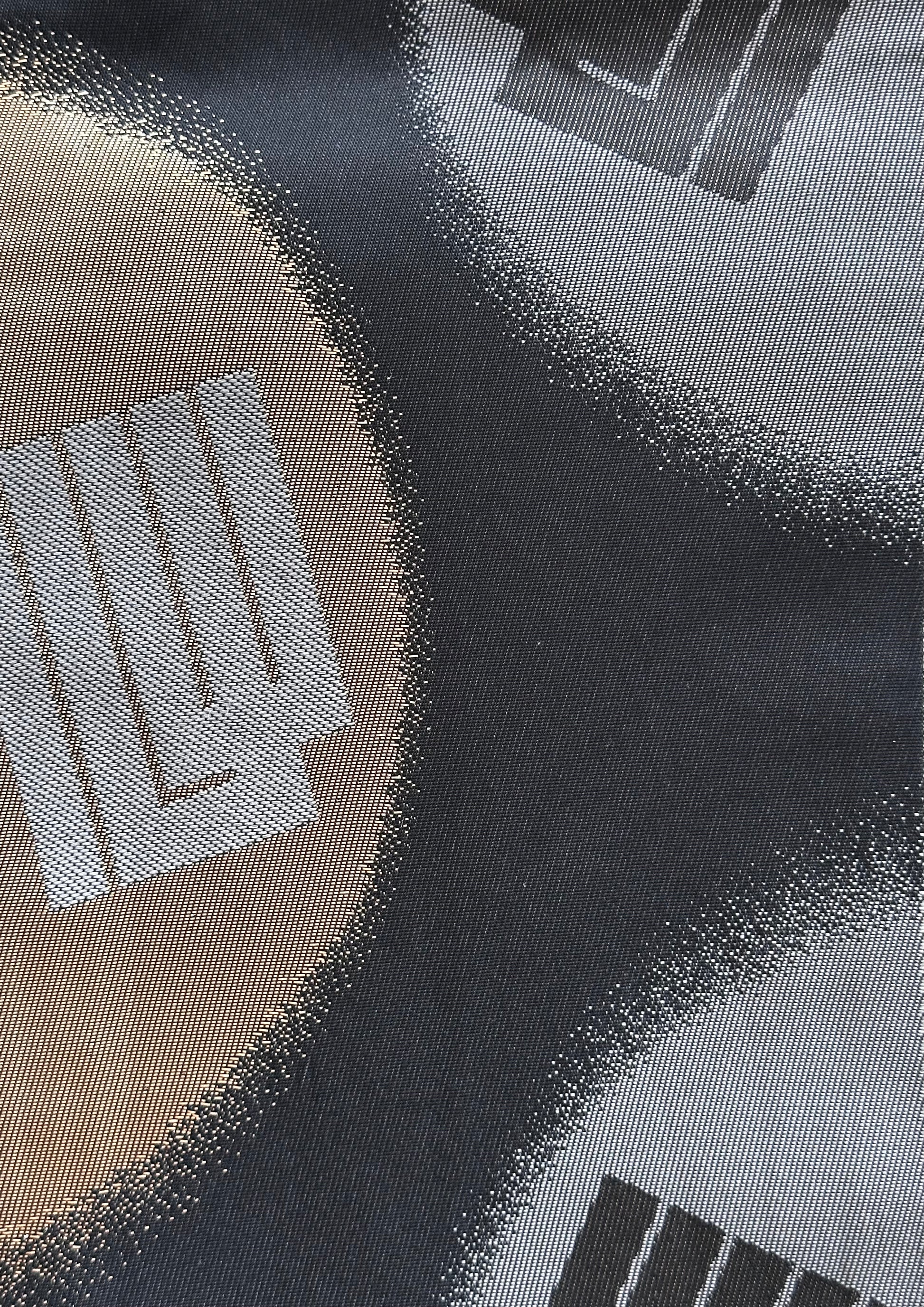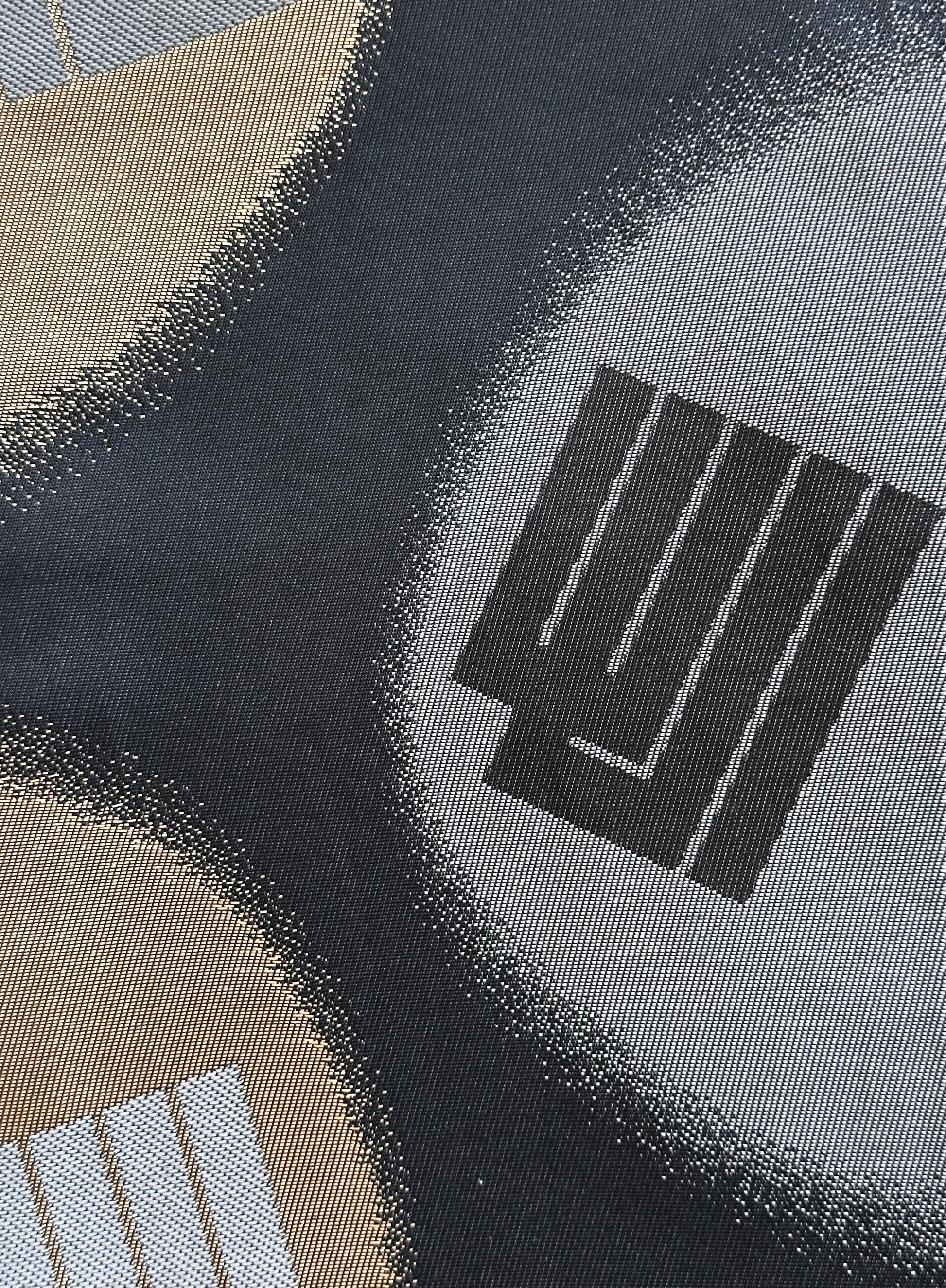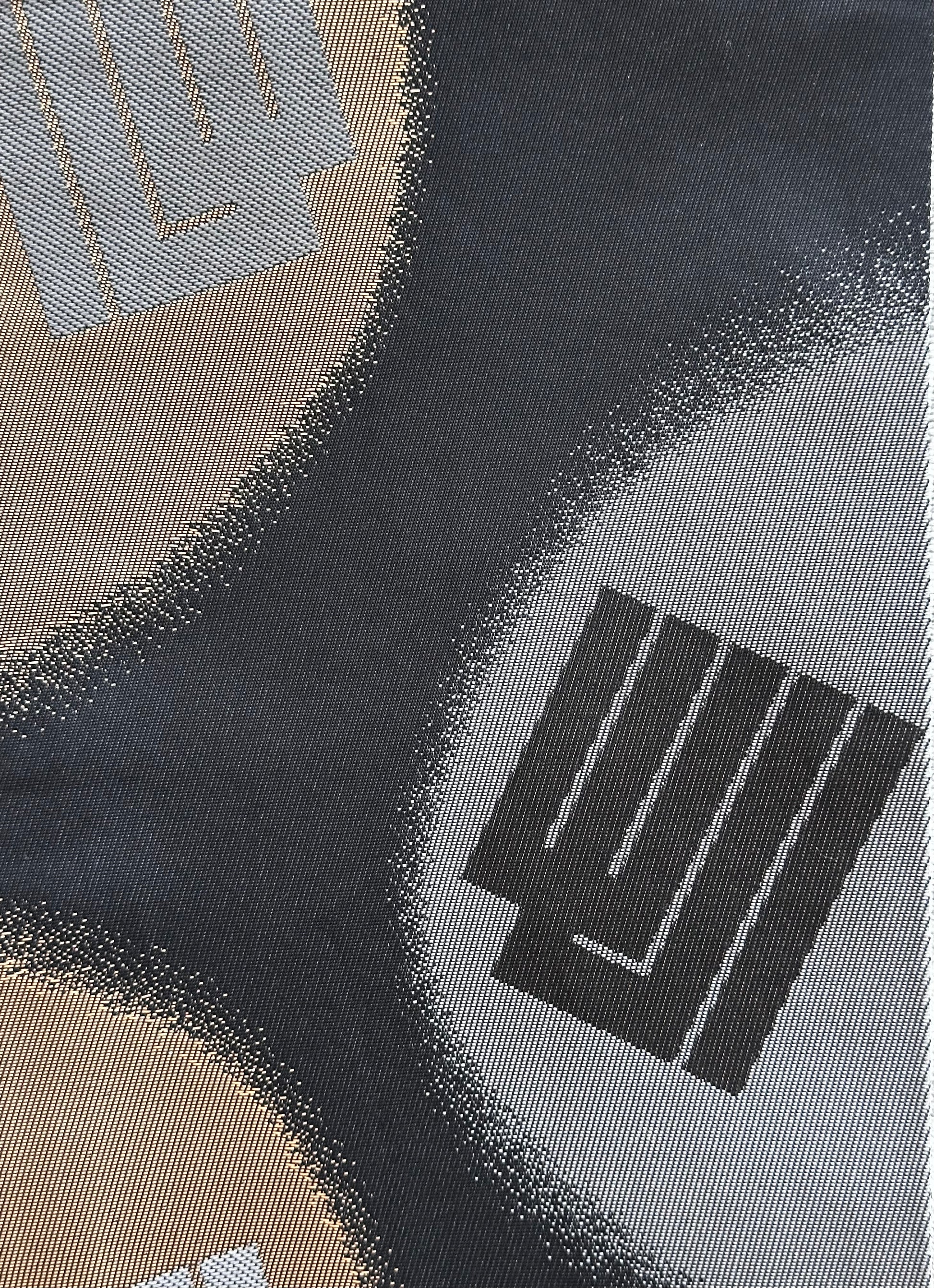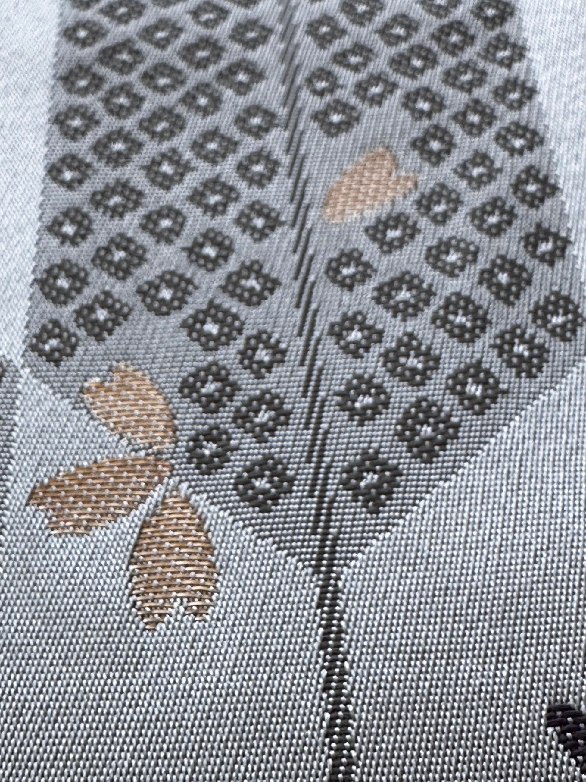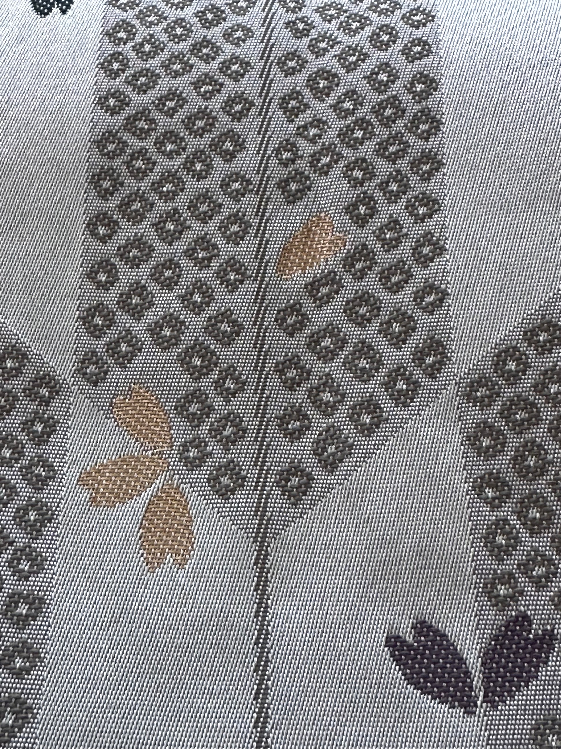 Description: This striking hanhaba obi blends modern design with rich tradition. The reverse side offers a seasonal contrast, featuring delicate sakura blossoms over yagasuri (arrow-feather) motifs, symbolising renewal and strength. Interwoven is the Genjiko pattern, a nod to Heian-era culture, represented by five subtle, fan-like shapes.