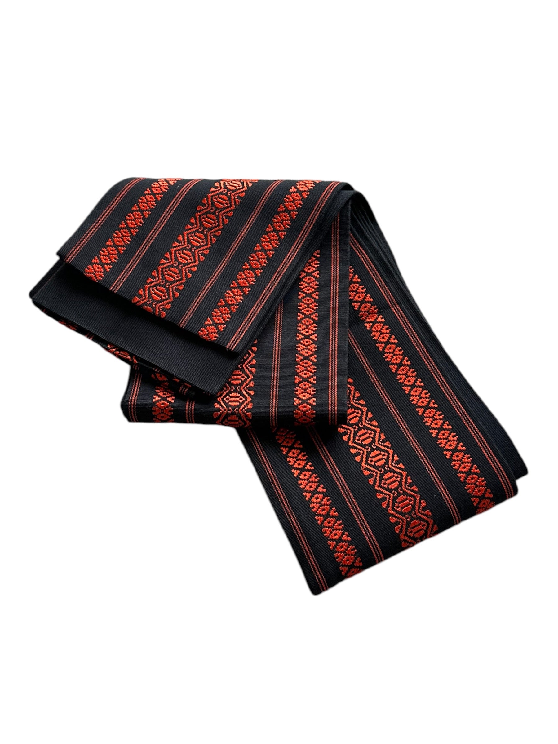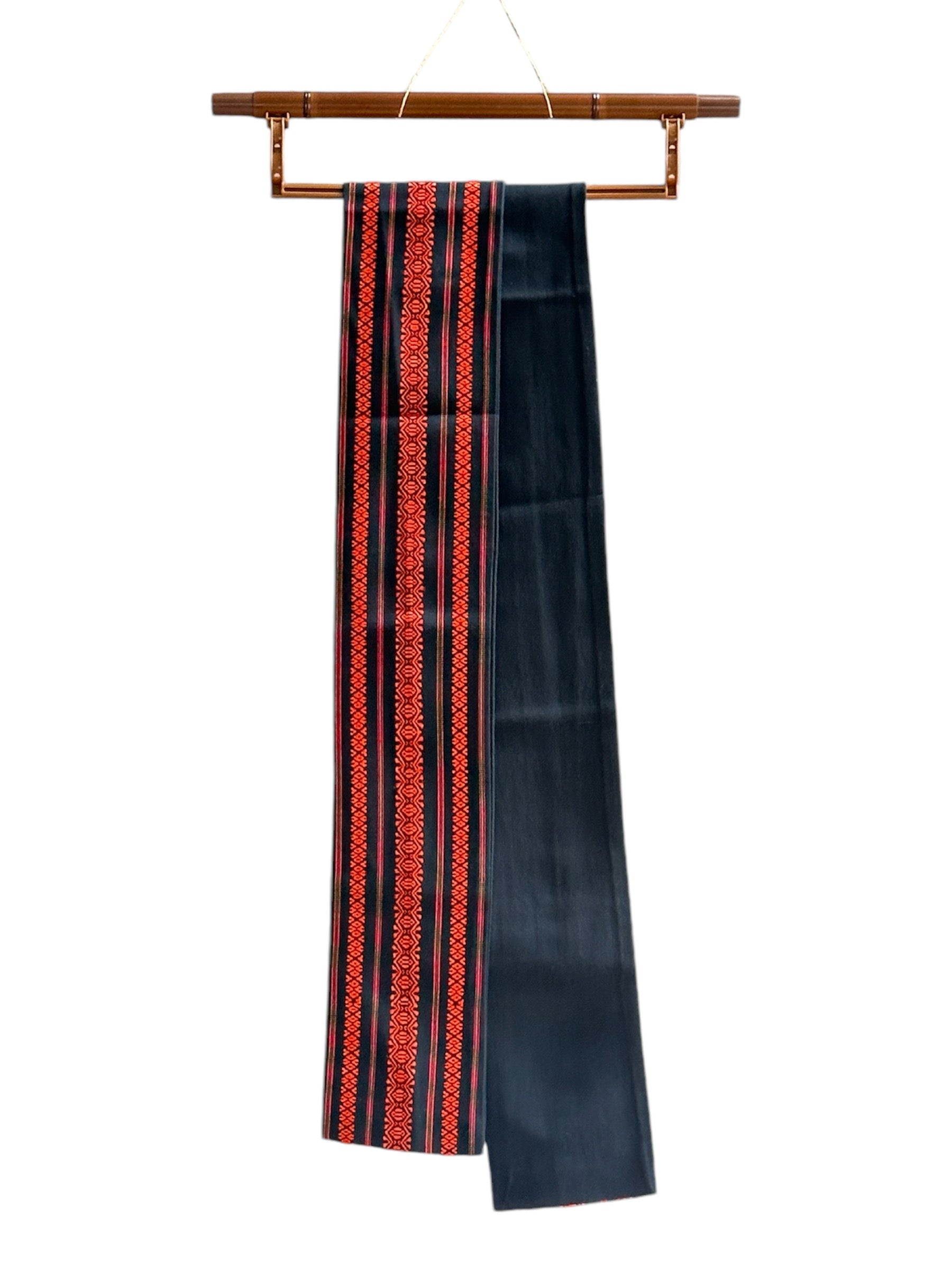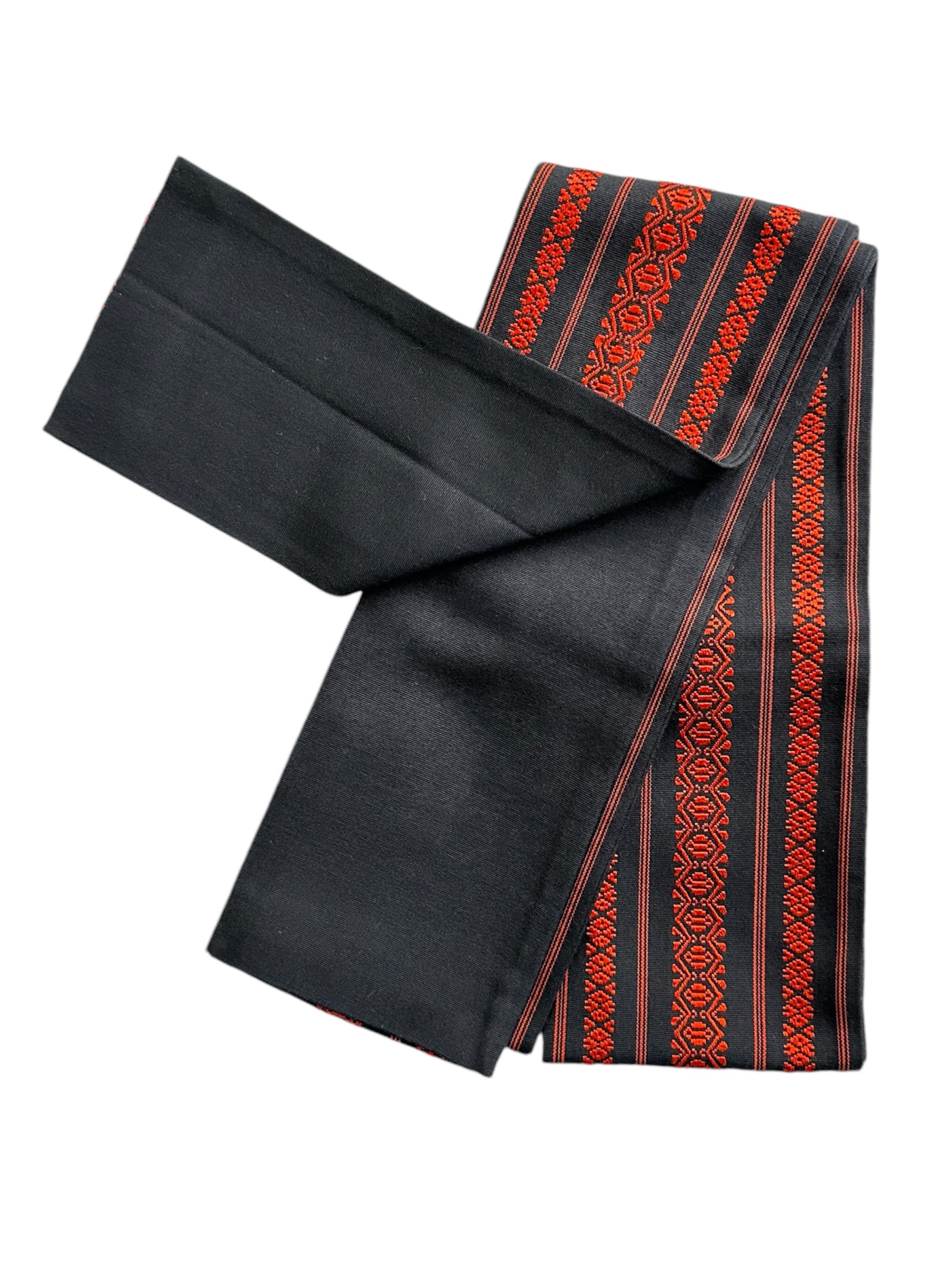 Description: This kaku obi for men features a blend of cotton that has a wonderfully soft texture reminiscent of silk. One side is crafted from smooth, plain black fabric, providing a classic and versatile foundation. The reverse side showcases an eye-catching red geometric pattern that is intricately woven into the fabric, adding a bold and contemporary touch to the traditional design.