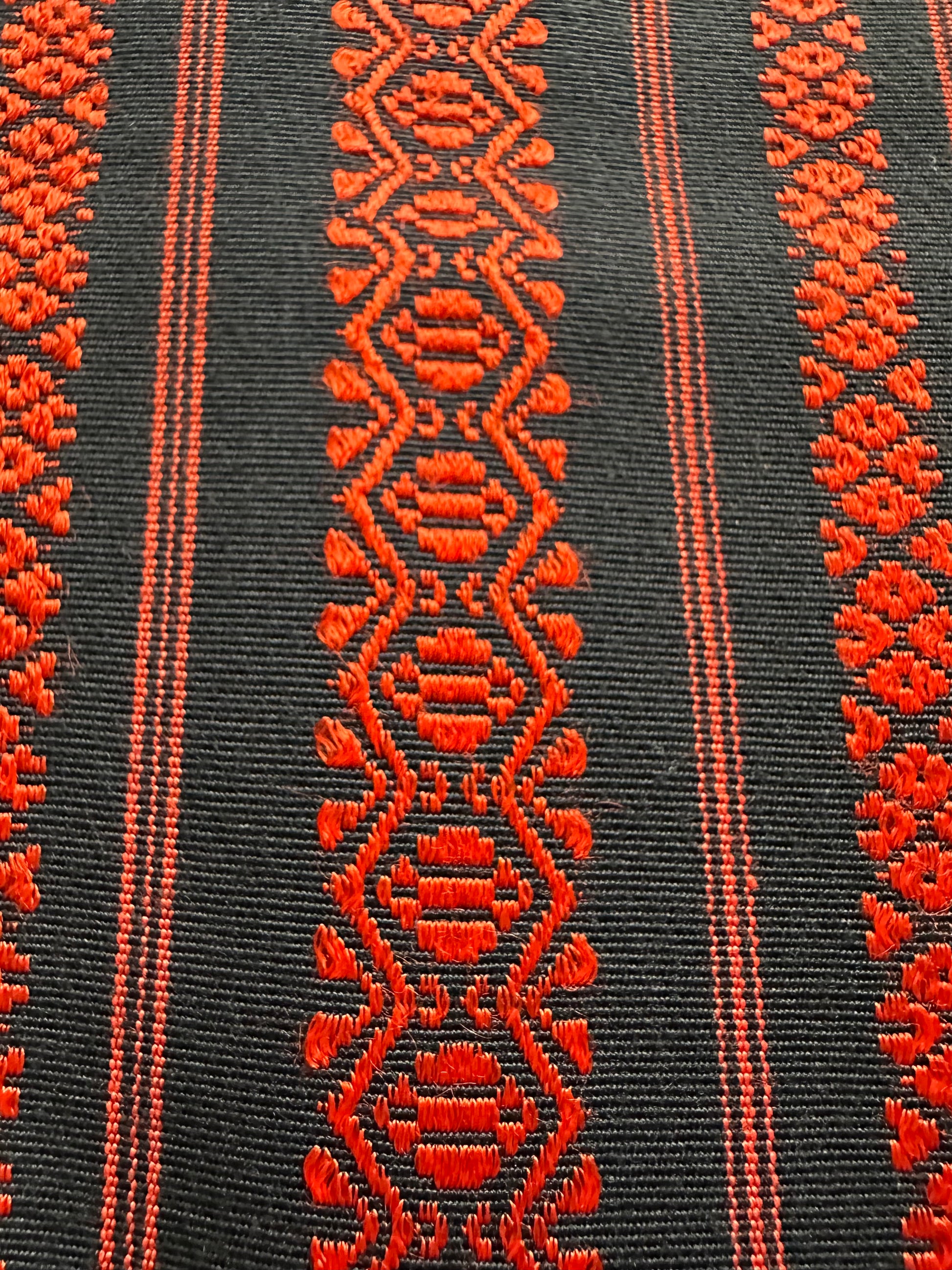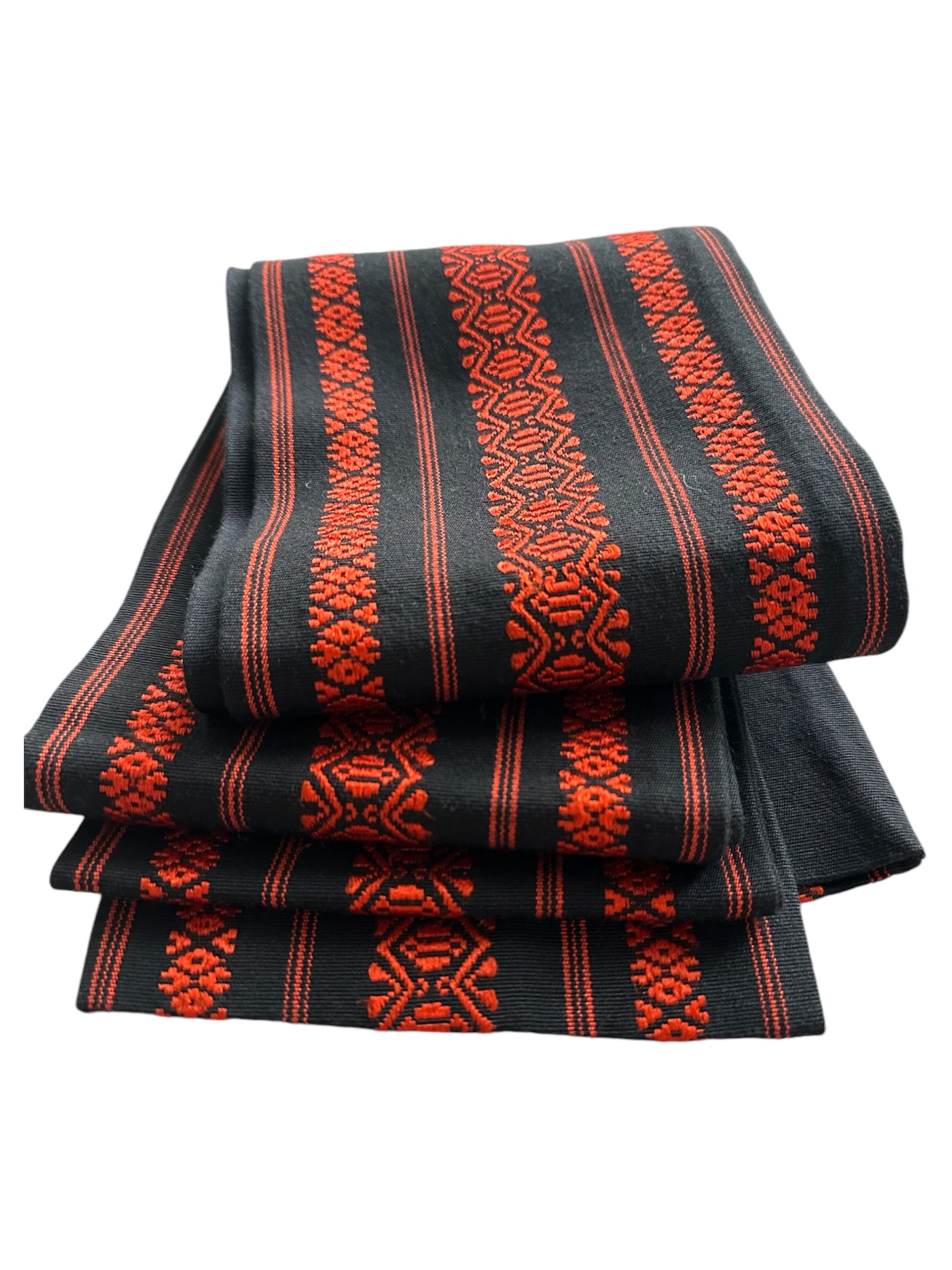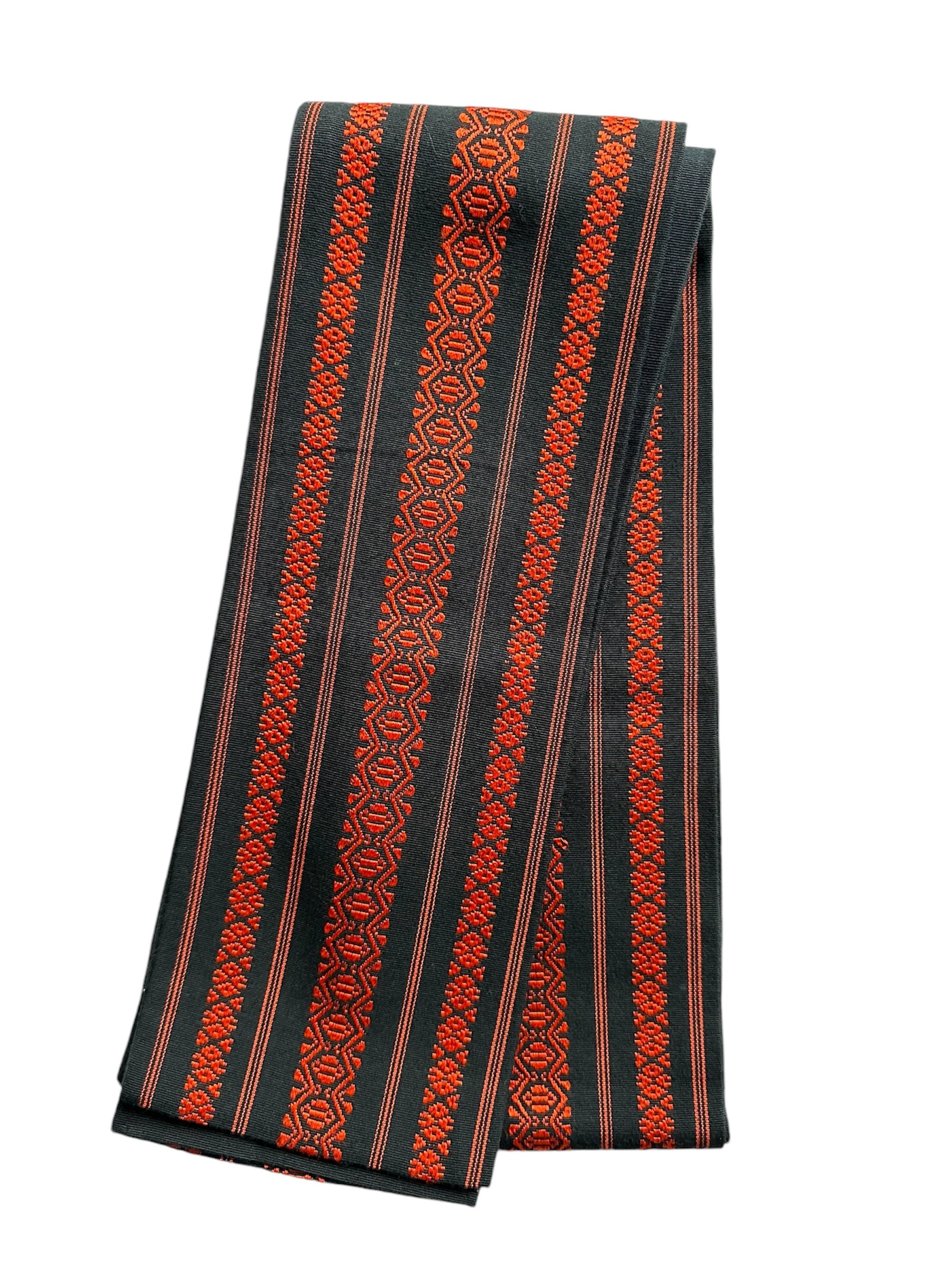 Description: This kaku obi for men features a blend of cotton that has a wonderfully soft texture reminiscent of silk. One side is crafted from smooth, plain black fabric, providing a classic and versatile foundation. The reverse side showcases an eye-catching red geometric pattern that is intricately woven into the fabric, adding a bold and contemporary touch to the traditional design.