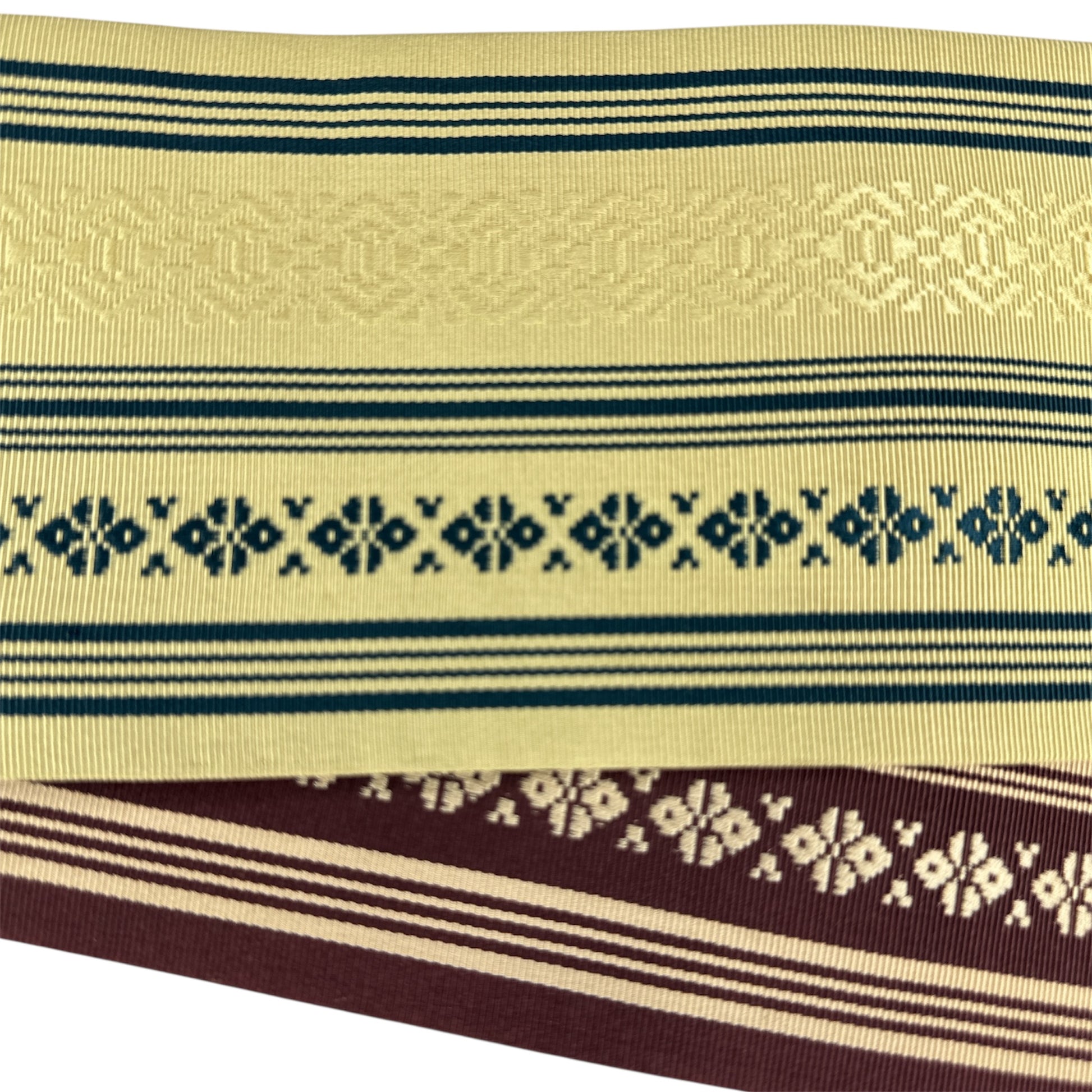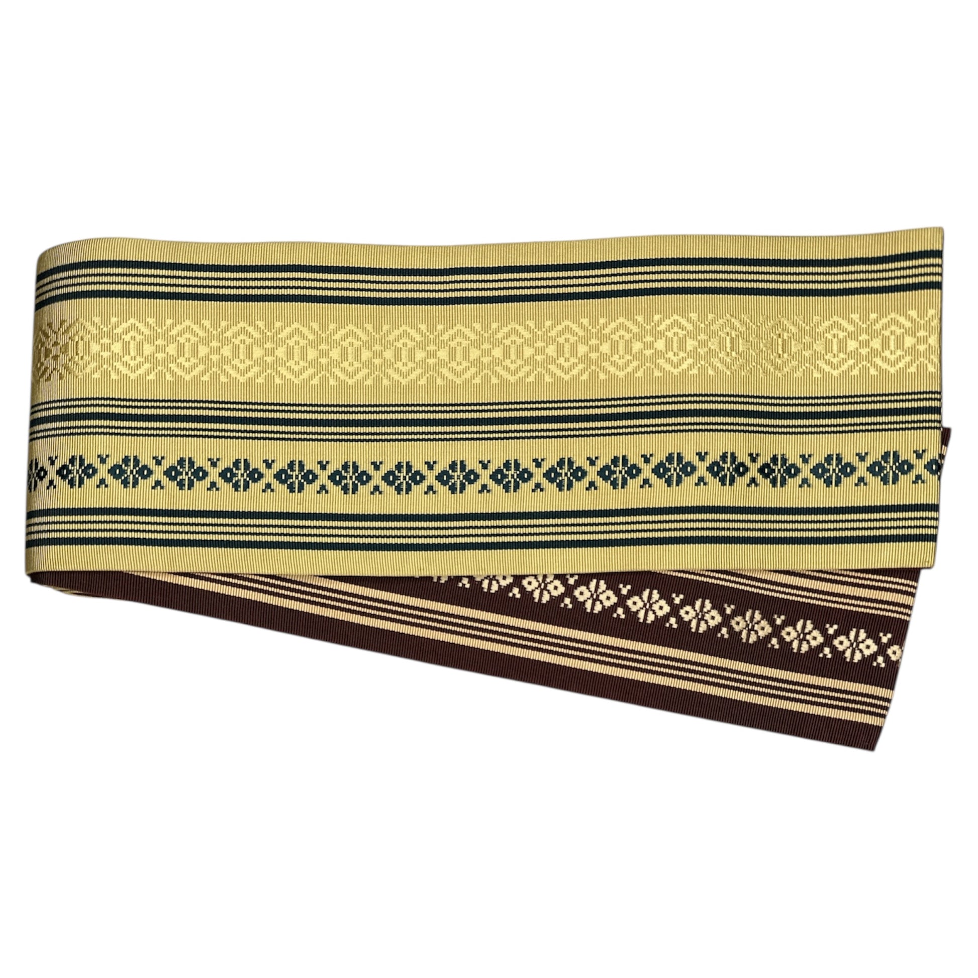 Description: This classic men’s reversible Kaku Haba obi is crafted from high-quality silk, offering a smooth, slightly structured texture that drapes elegantly while maintaining its shape. One side features a rich brown-red background adorned with yellow stripes and delicately woven white floral motifs, creating a refined and traditional appearance. The reverse side presents a vibrant contrast with a yellow base highlighted by navy blue stripes and complementary woven flowers, offering versatility and two distinct styling options in a single piece. Perfect for pairing with kimono, yukata, or hakama, this obi is ideal for formal occasions, ceremonies, and traditional wear.