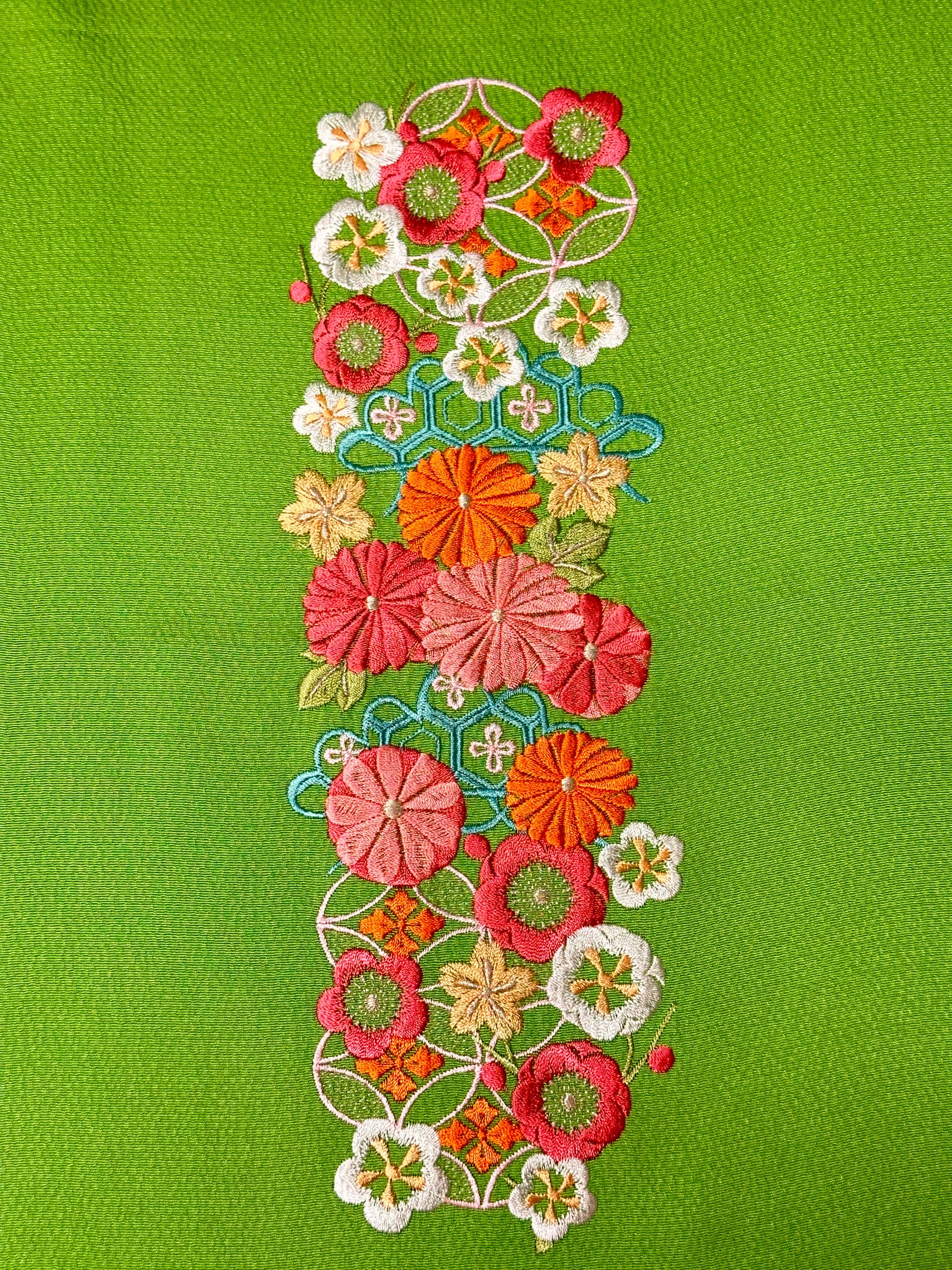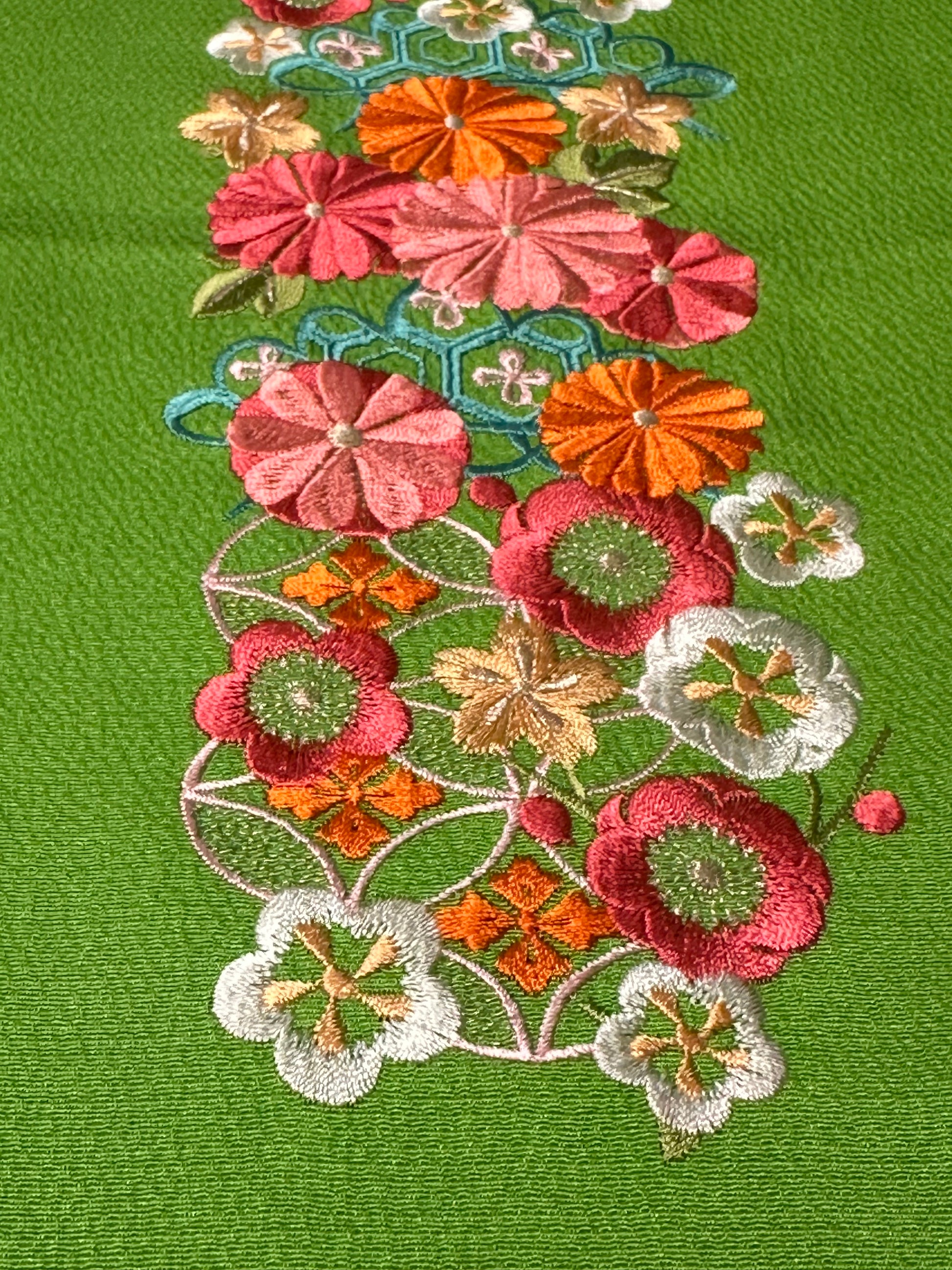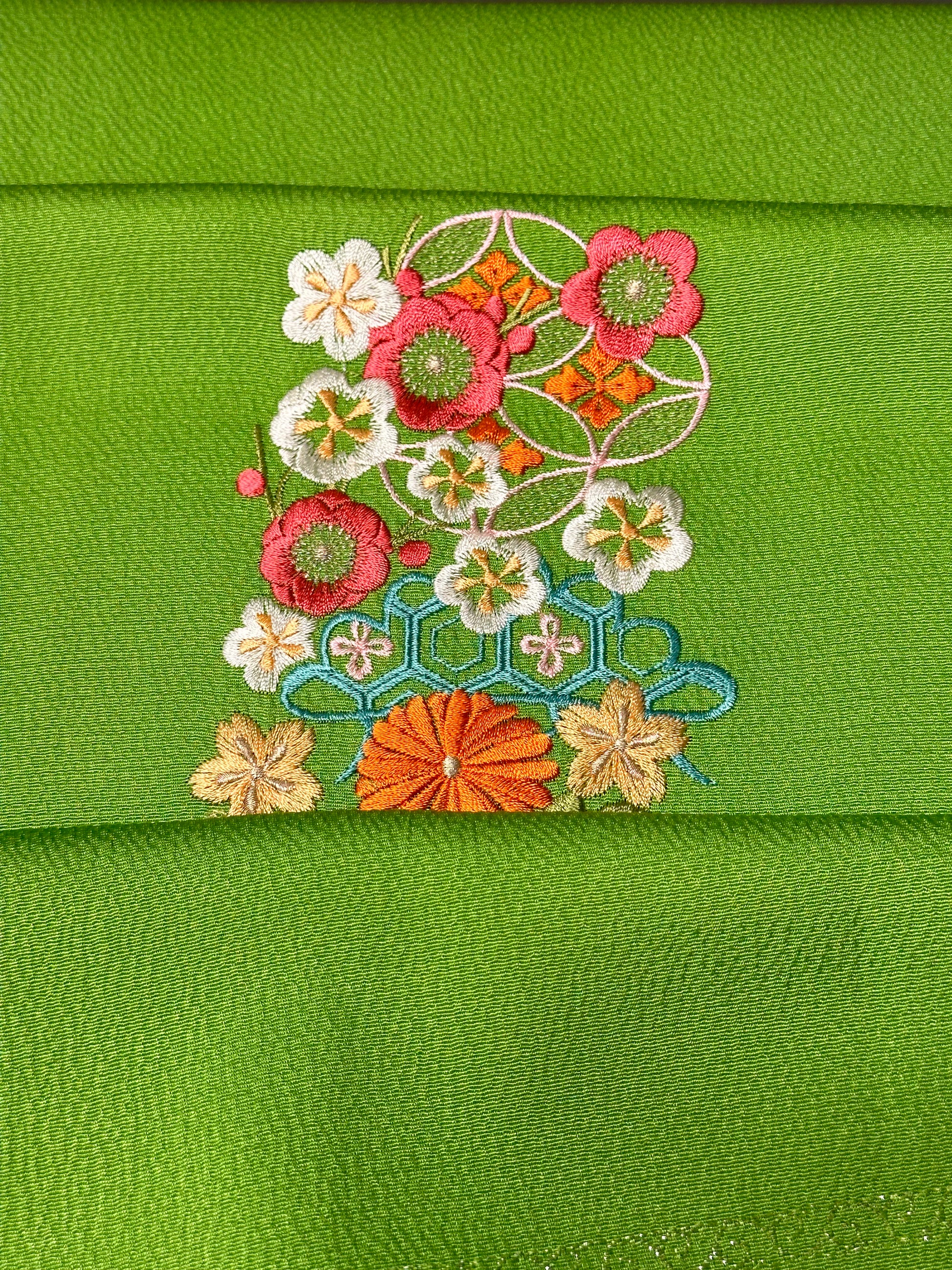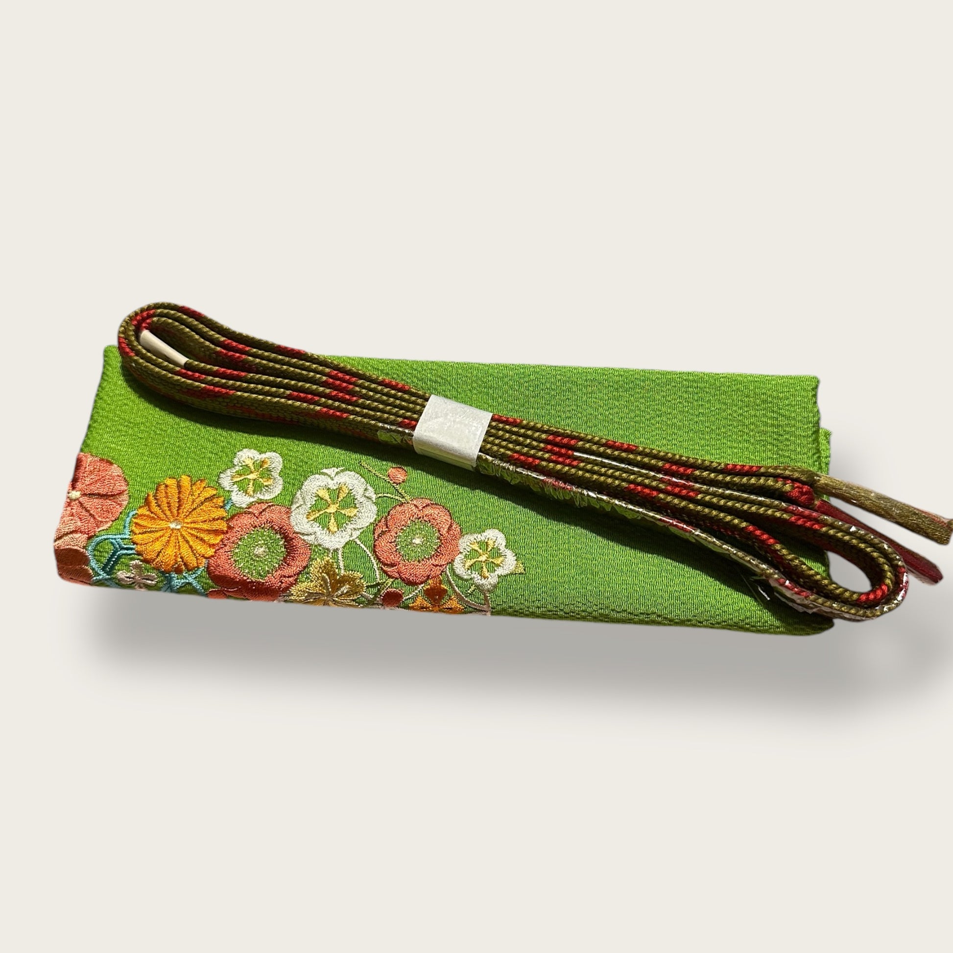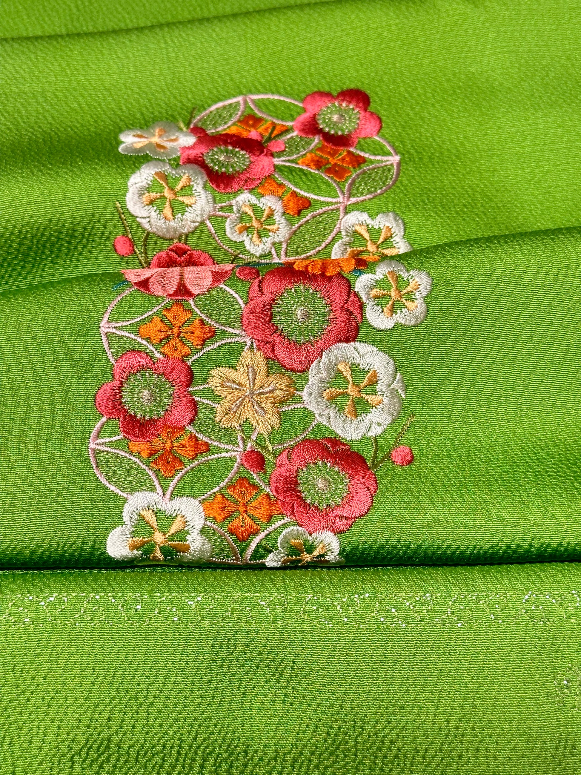 • Obiage Design: A deep matcha green shade with delicate embroidered flowers on one end, adding a graceful, nature-inspired touch to the overall look.