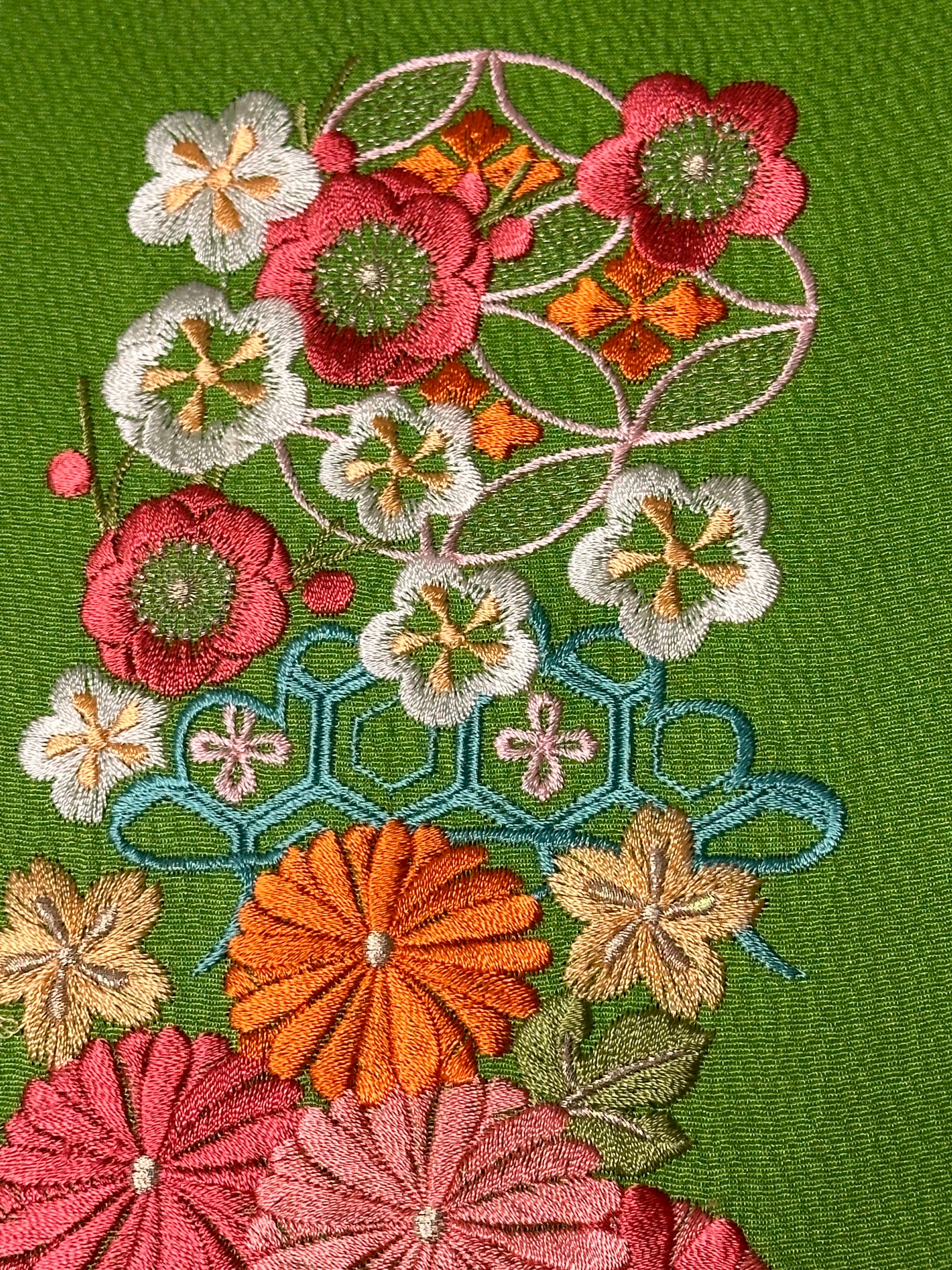 • Obijime: A MIRUCHA-colored (Japanese color name that refers to a soft, muted green shade) cord, offering a sophisticated, understated finishing touch to the obi styling.