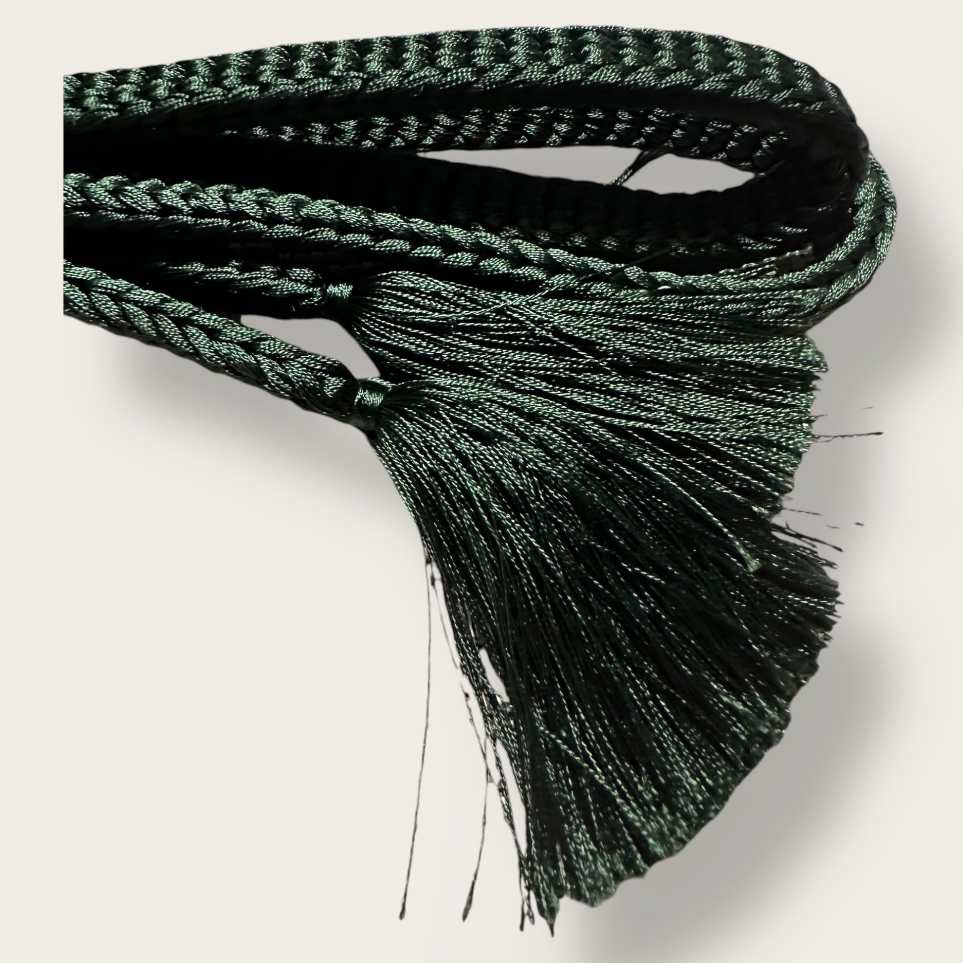 Obijime Use in Kitsuke: The Obijime is a decorative and functional cord used to secure the obi in place, tying it firmly to prevent slipping. It is tied around the waist, helping to keep the obi structure secure and in position. While it provides stability, the Obijime also adds an elegant, refined finishing touch to the obi, enhancing the overall appearance of the kimono. An essential part of kitsuke, it combines both practical function and aesthetic beauty to complete the kimono dressing process.