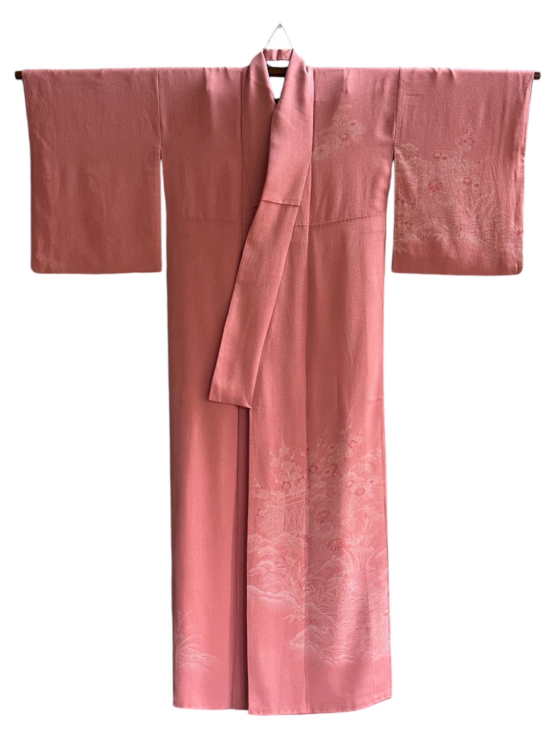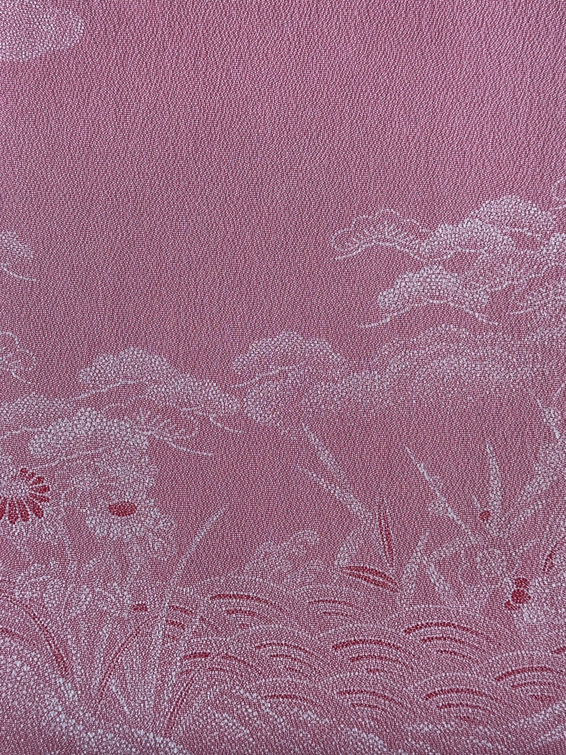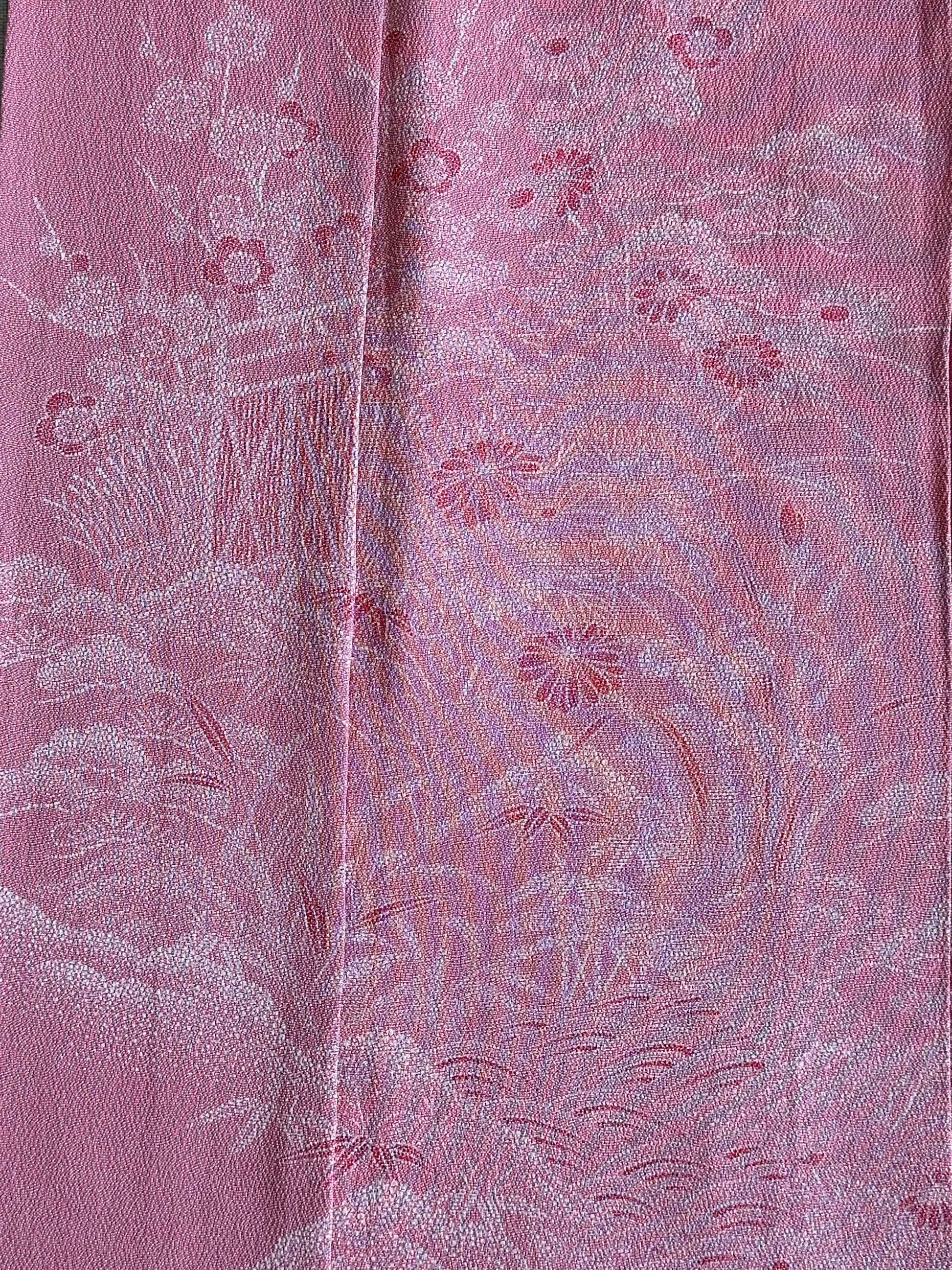Description: This exquisite pink Tsukesage kimono showcases a stunning Same Komon pattern featuring a beautifully detailed garden landscape, rich with intricate floral motifs and serene elements that reflect the beauty of nature. The soft pink color creates a romantic and delicate ambiance, making it a timeless piece.