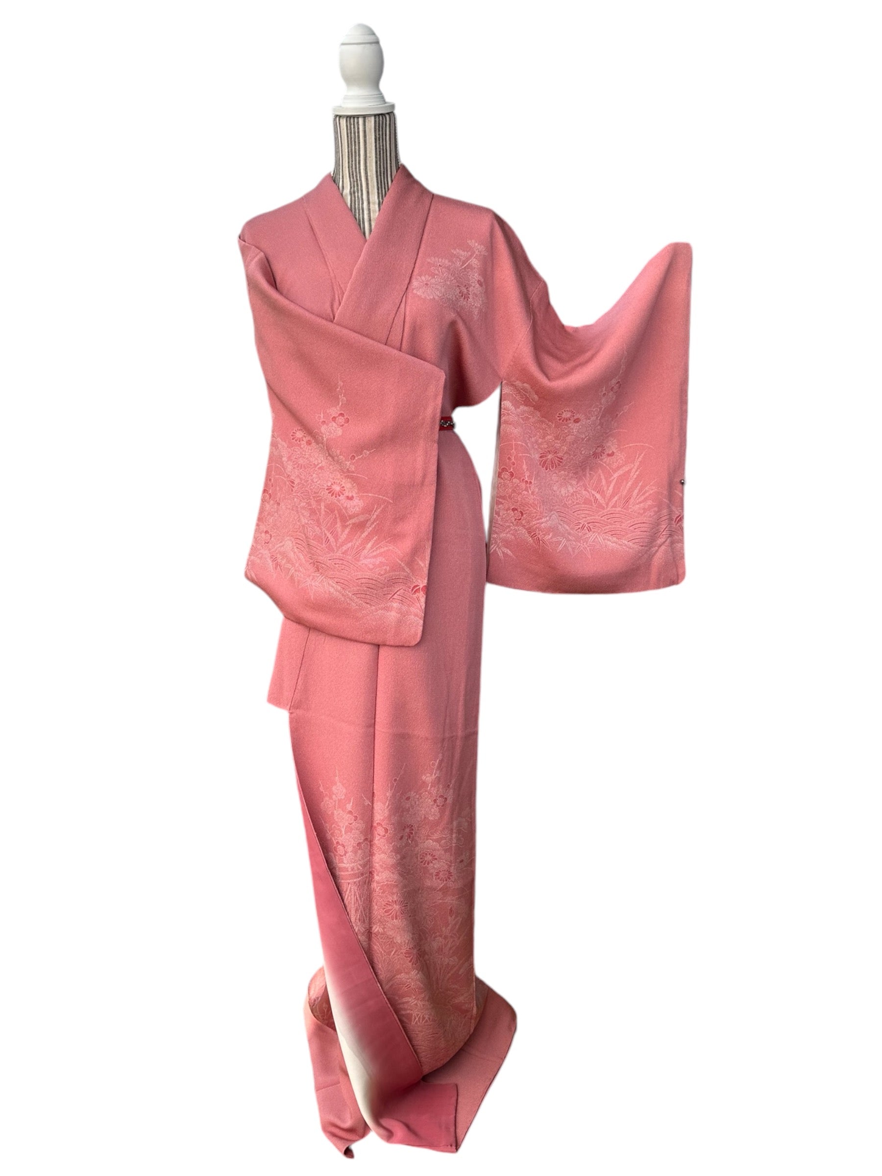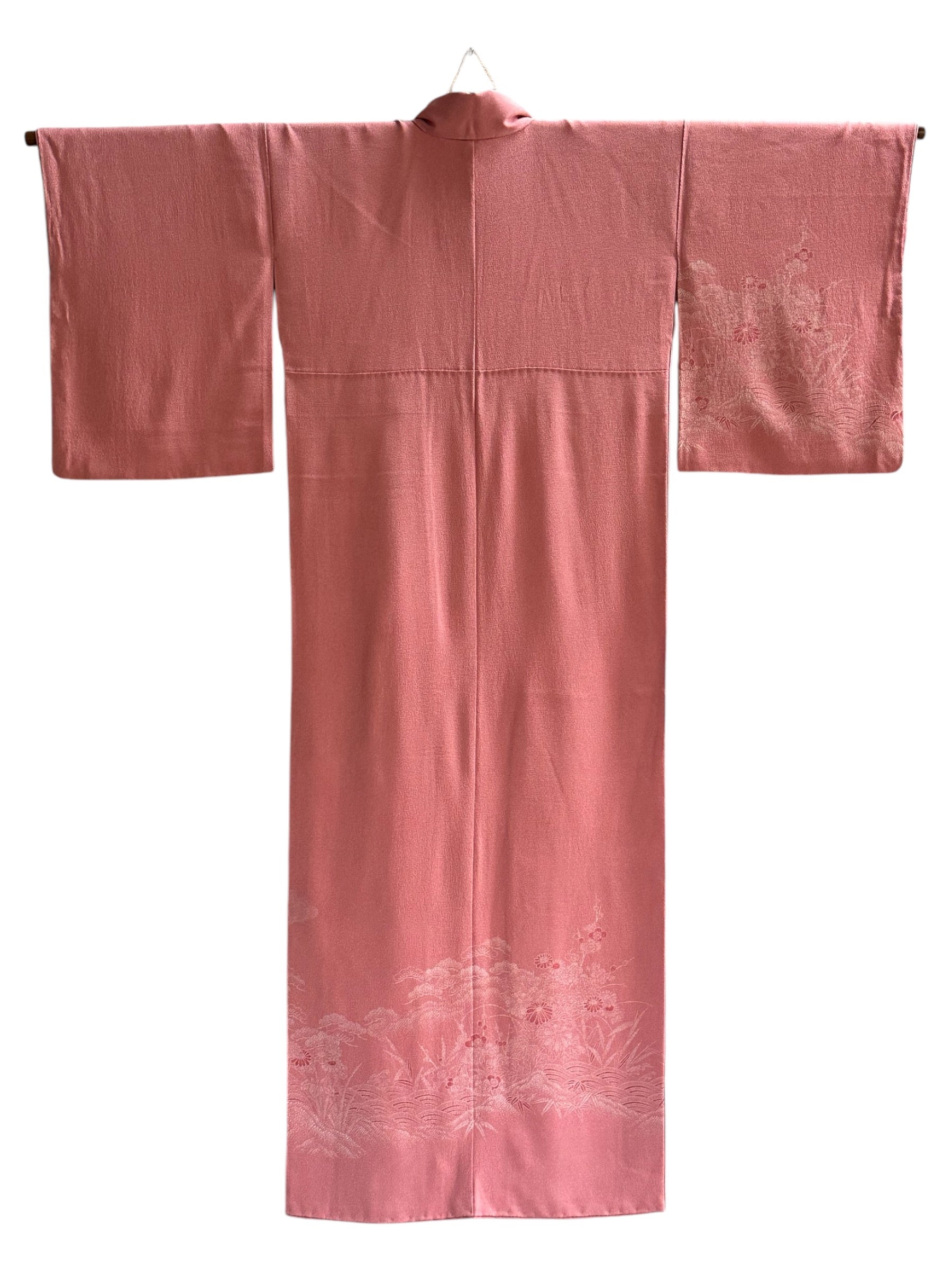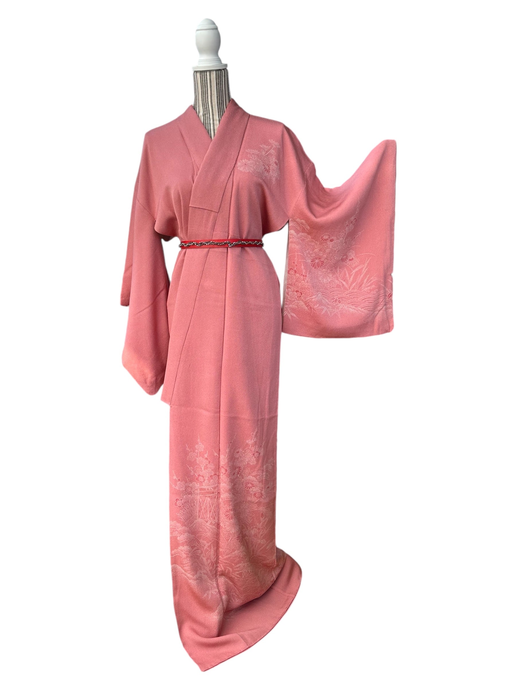 Description: This exquisite pink Tsukesage kimono showcases a stunning Same Komon pattern featuring a beautifully detailed garden landscape, rich with intricate floral motifs and serene elements that reflect the beauty of nature. The soft pink color creates a romantic and delicate ambiance, making it a timeless piece.