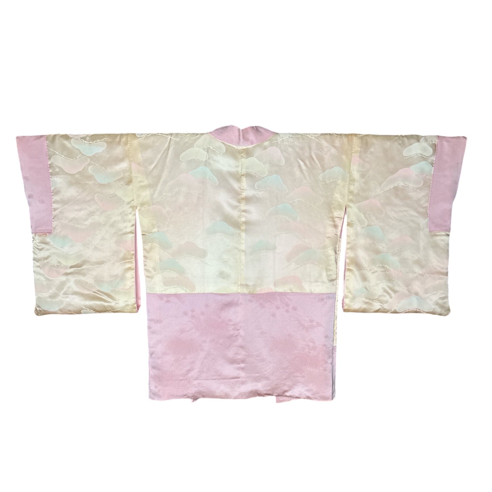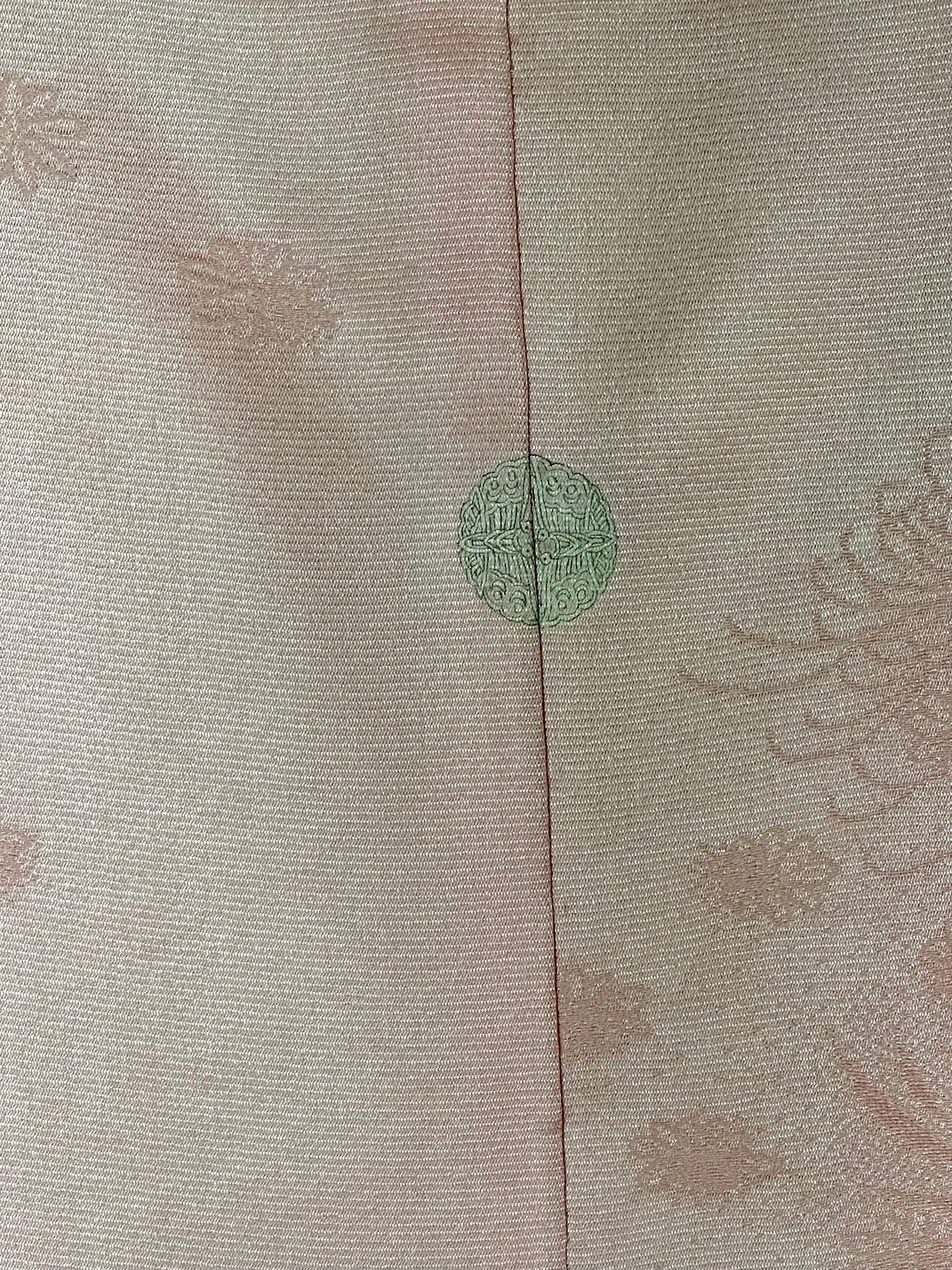 Fabric: Soft pink rinzu silk exterior with small and spider chrysanthemum motifs; embroidered kamon on the back; beige silk lining with painted clouds and matsu pattern.
