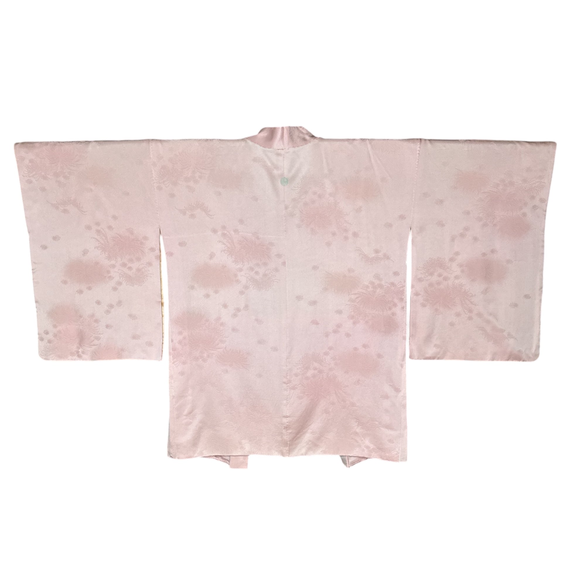 Description: This women’s vintage haori is crafted from soft pink rinzu silk, featuring an all-over pattern of small chrysanthemums interspersed with large stylized spider chrysanthemums (kiku) for a striking, elegant effect. The back showcases one embroidered kamon (family crest), adding traditional significance and formality to the piece.