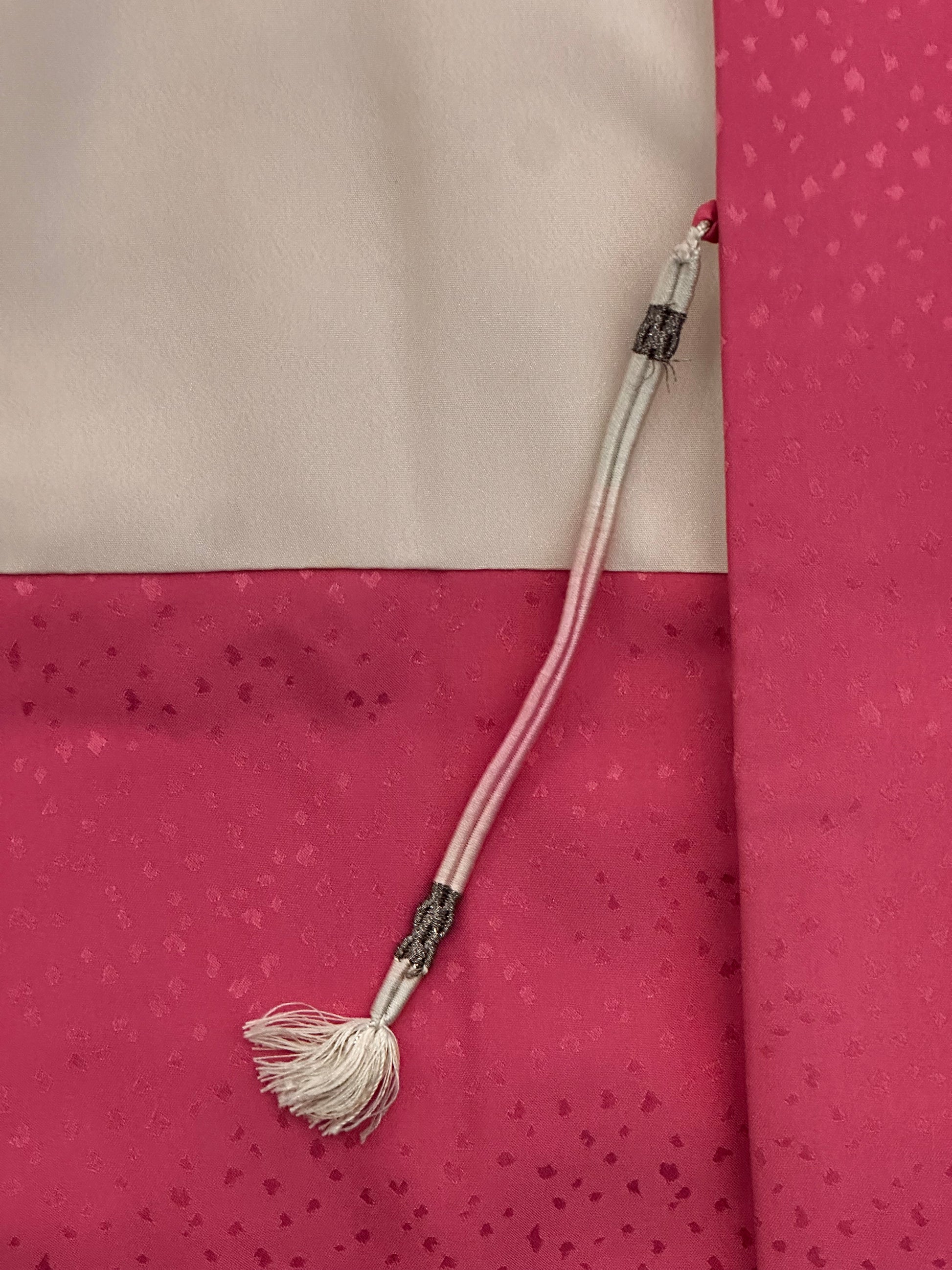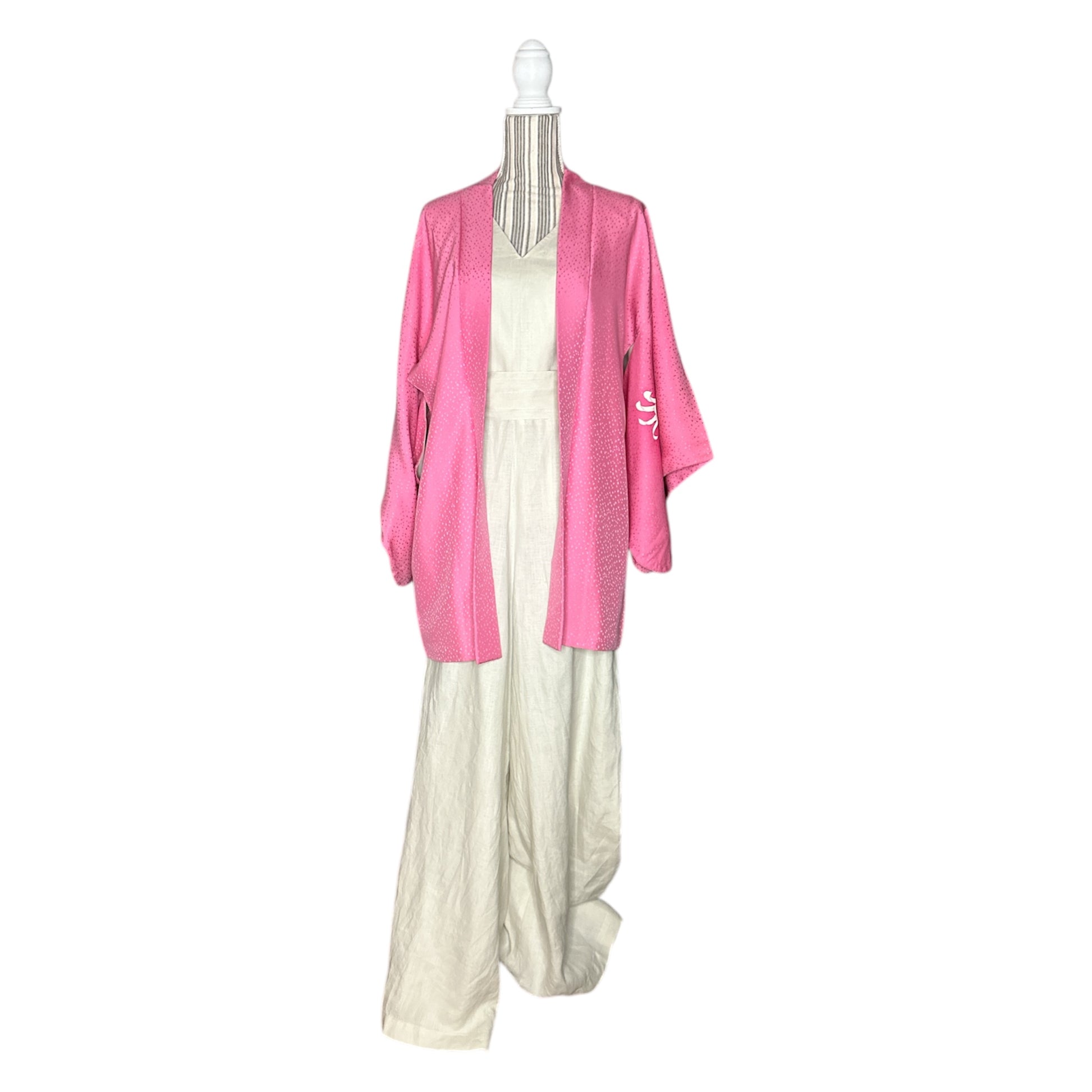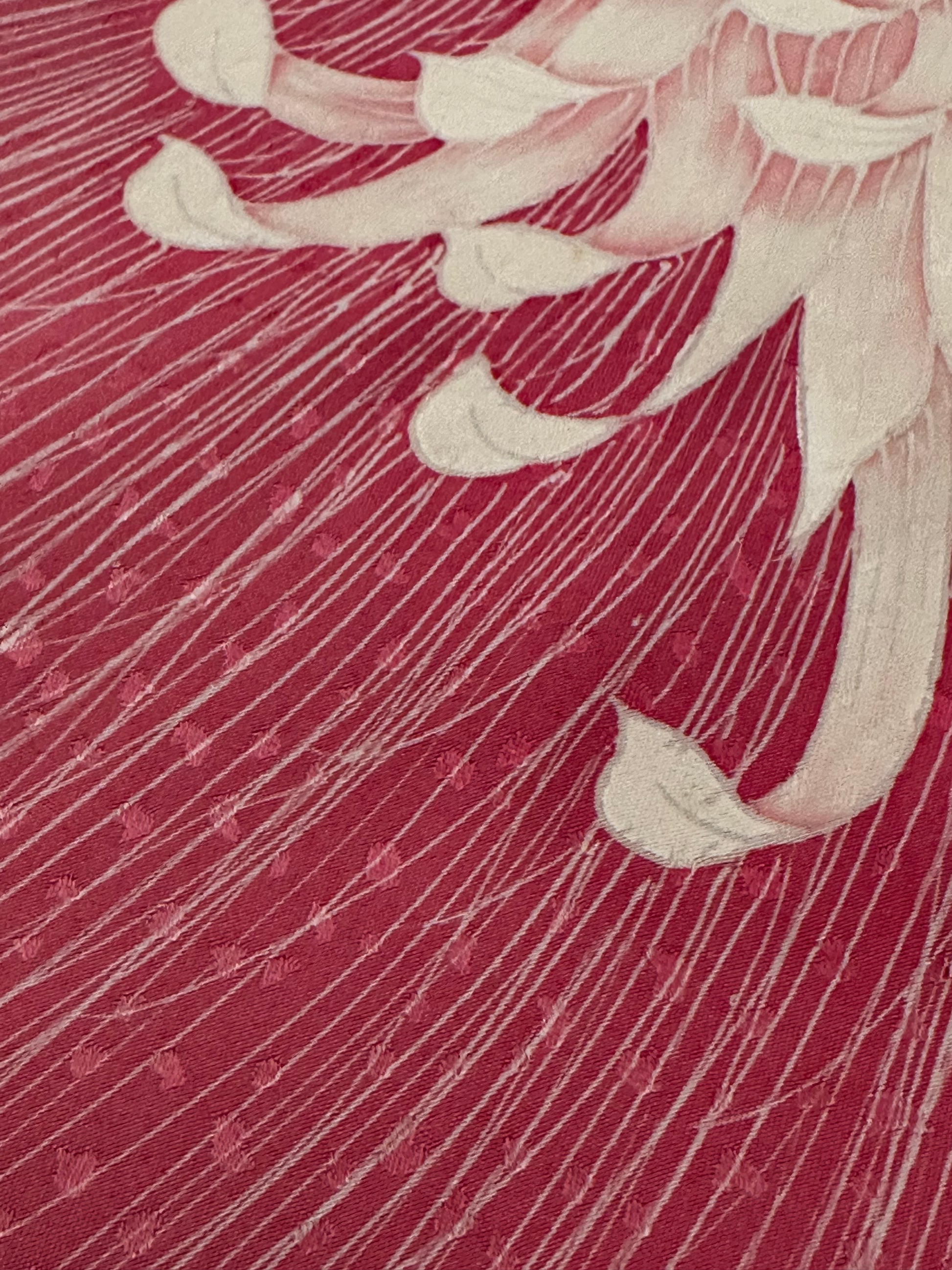 Description: This striking women’s haori is a beautiful vintage piece crafted from vivid pink rinzu silk, showcasing a refined balance between bold color and elegant artistry. The exterior is adorned with large white chrysanthemum motifs, hand-painted on the sleeves and back, creating a powerful yet graceful presence. In Japanese culture, chrysanthemums symbolize longevity, nobility, and renewal, adding depth and meaning to the design.