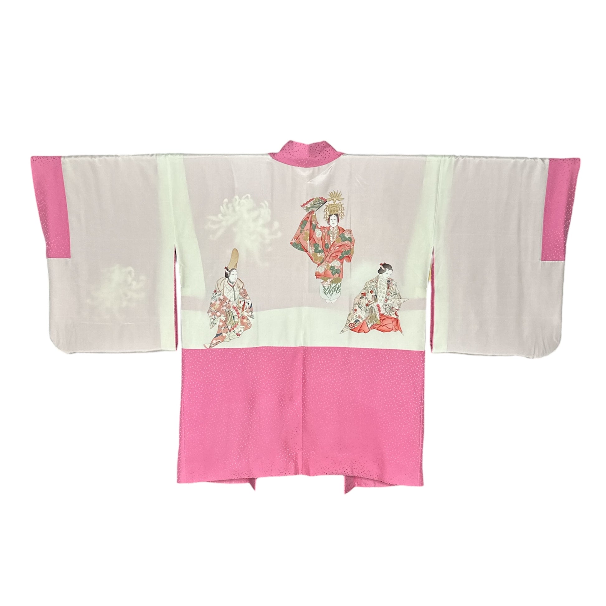 Inside, the haori reveals an exceptional surprise: an inner lining of the finest silk, exquisitely hand-painted with detailed Noh theatre actors. The expressive faces, costumes, and movement of the figures reflect the artistry and cultural significance of traditional Noh plays, making this piece both visually captivating and culturally rich. The haori is complete with haori himo (decorative haori ties), enhancing its authenticity and elegance.