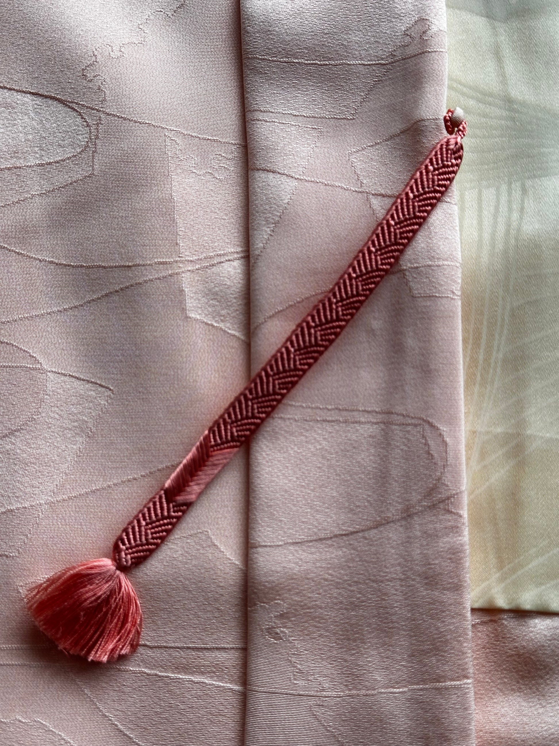 The fan designs are woven directly into the rinzu silk, creating a subtle, refined texture that reveals itself gently in the light. Within each fan, delicate motifs of flowing water and clouds are incorporated, symbols of continuity, movement, and harmony. The overall effect is understated yet deeply symbolic.
