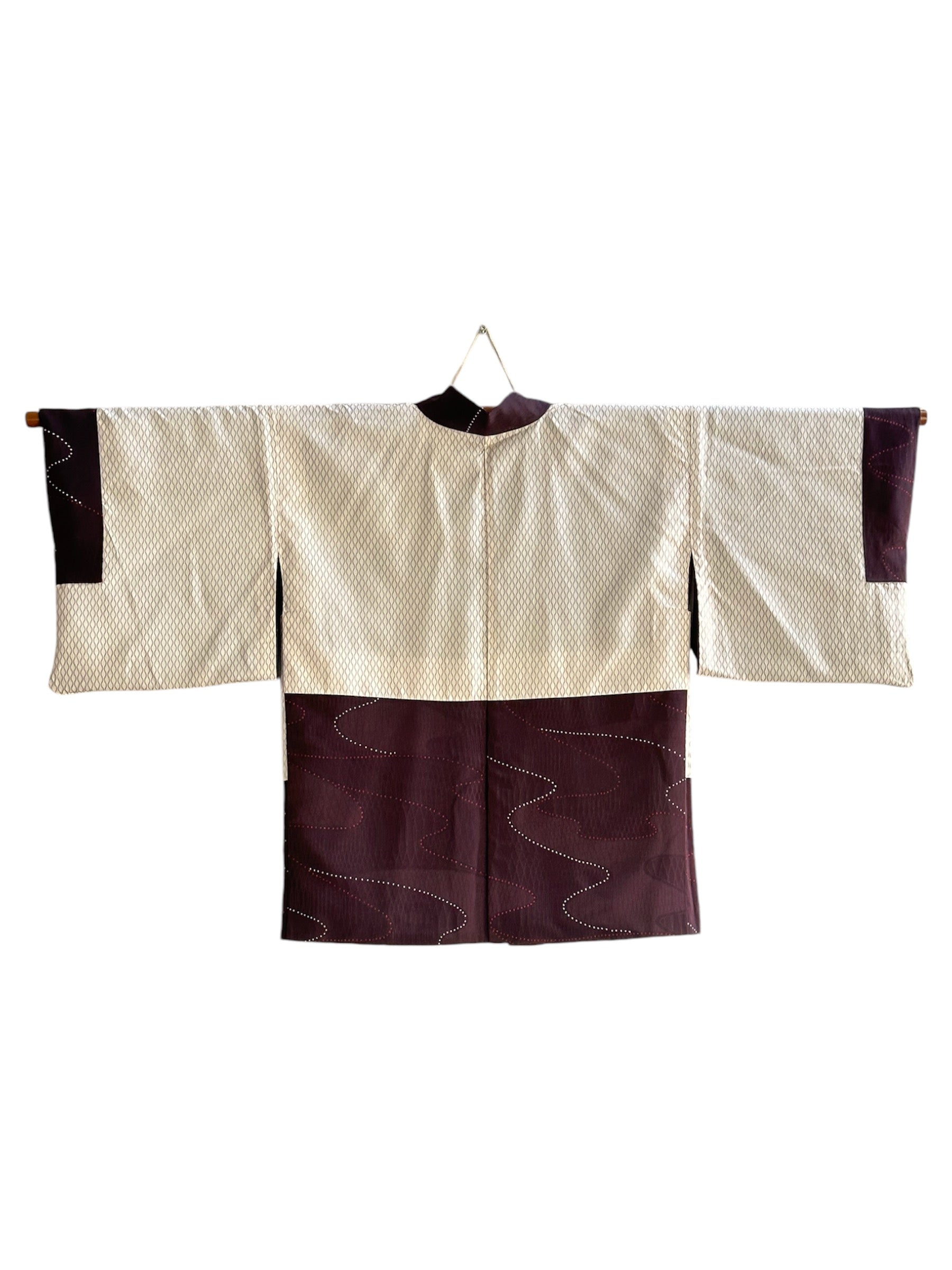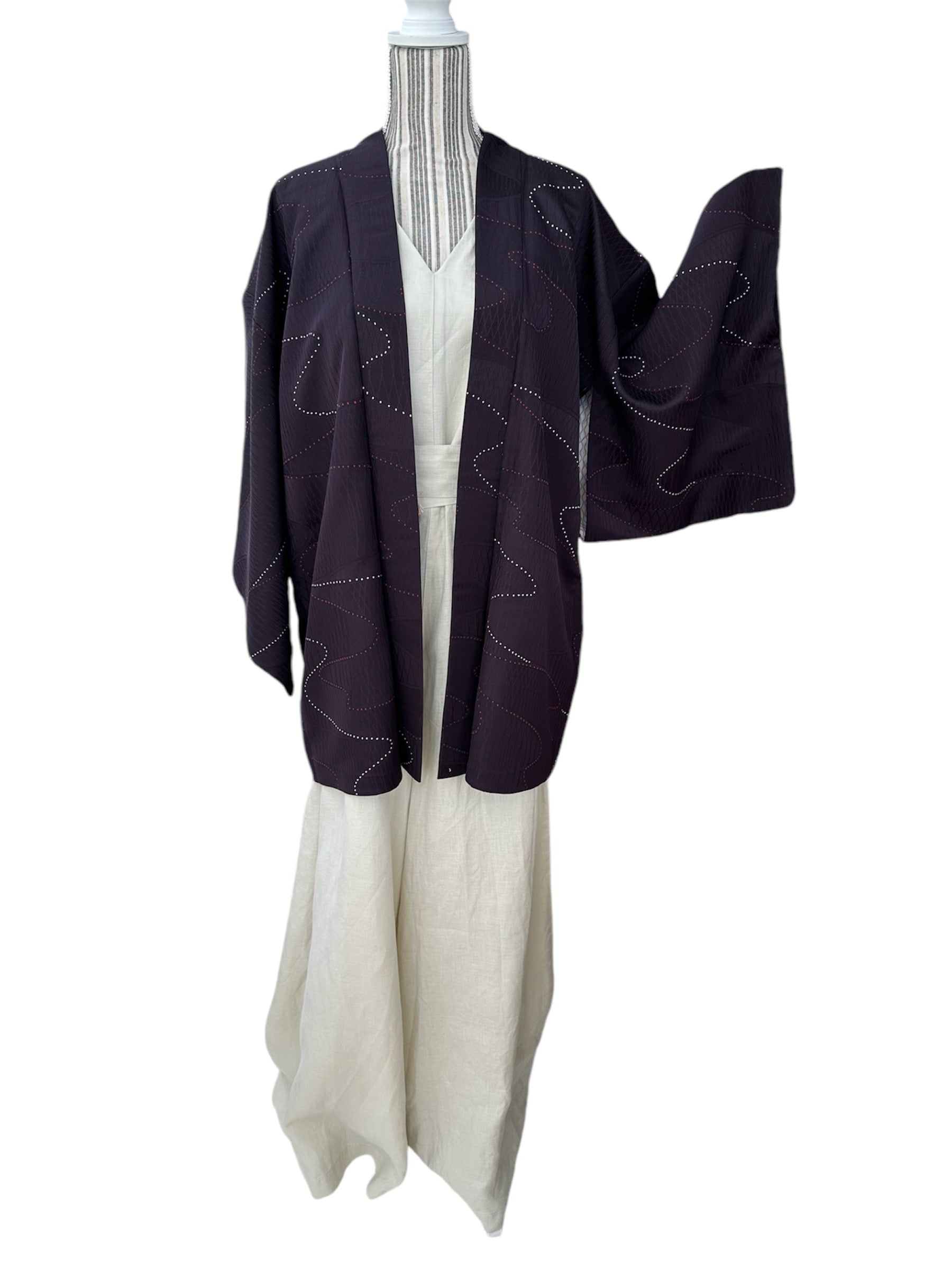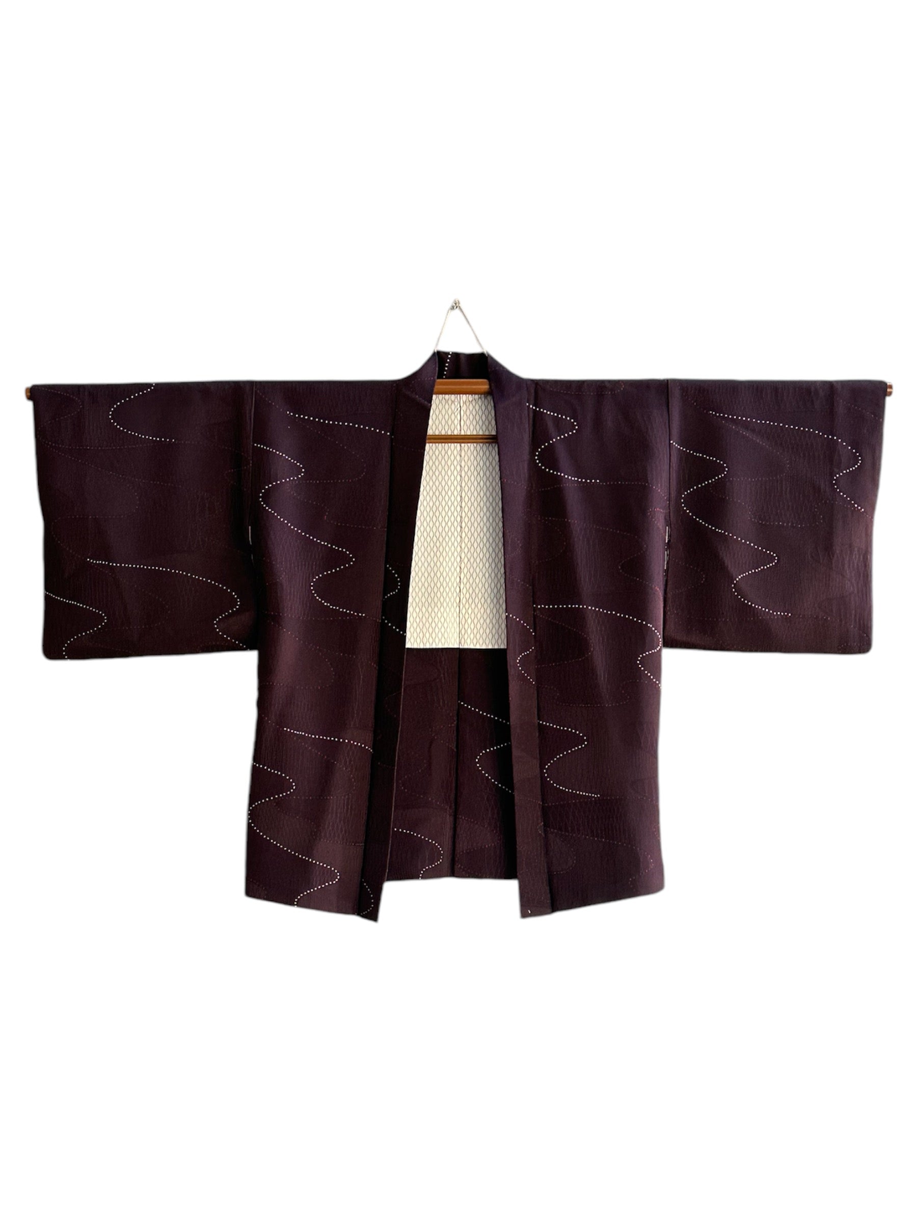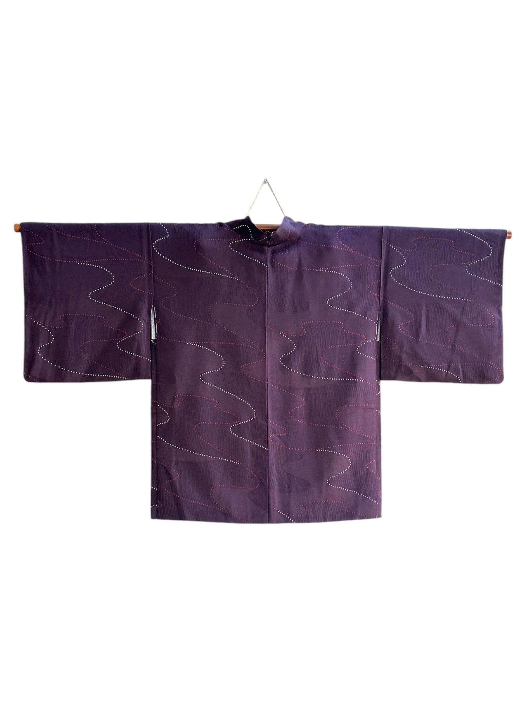 Description: This elegant haori features a Nisemurasaki color base, a sophisticated and muted shade of purple with subtle grey undertones that exude timeless elegance. Crafted from rinzu silk, the fabric showcases a delicate woven pattern, enhancing its luxurious texture. Flowing across the haori, white and red dots subtly emphasize the graceful movement of rivers, adding a classic touch to the design.