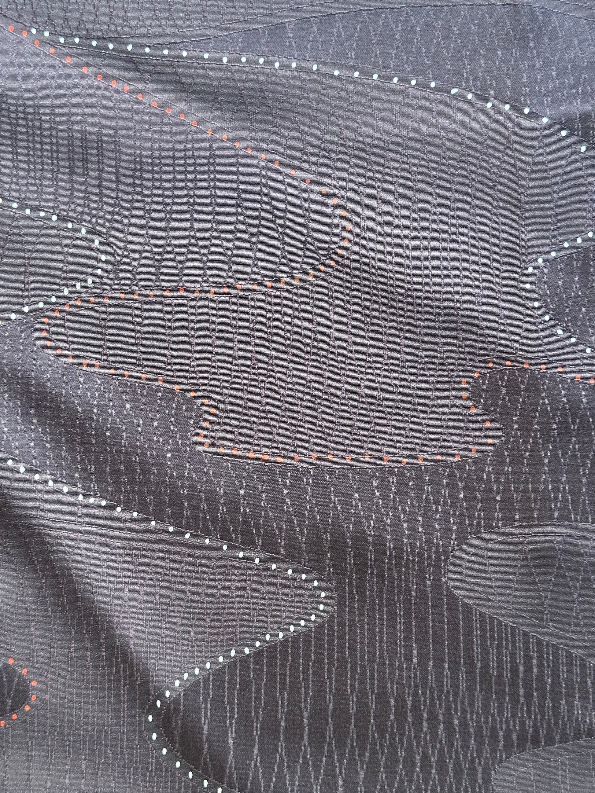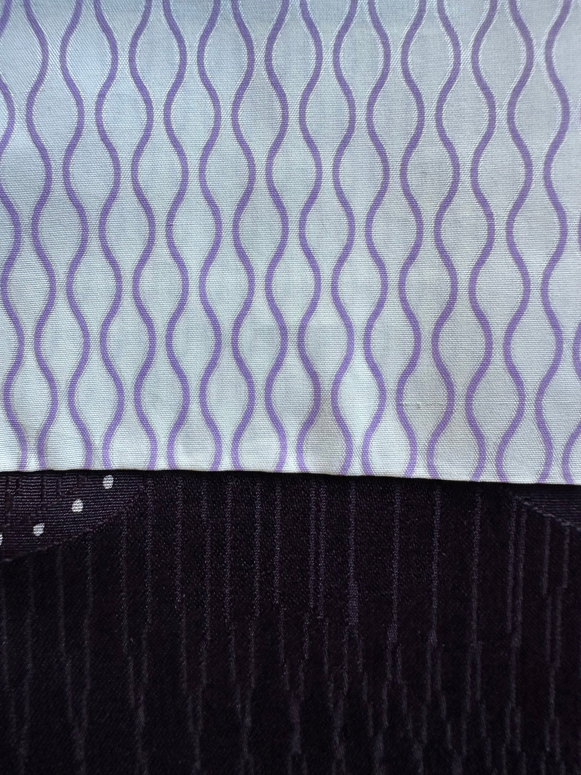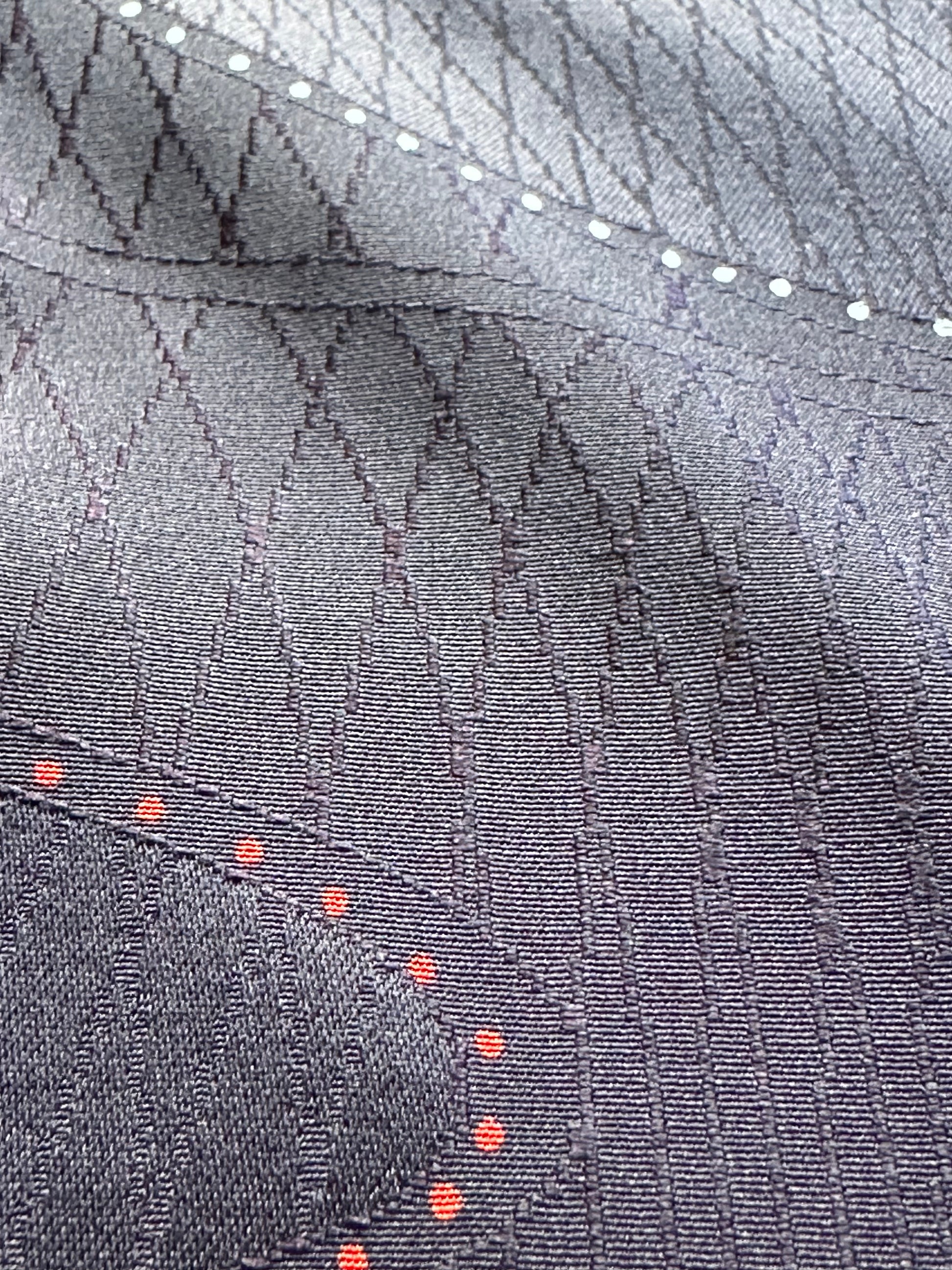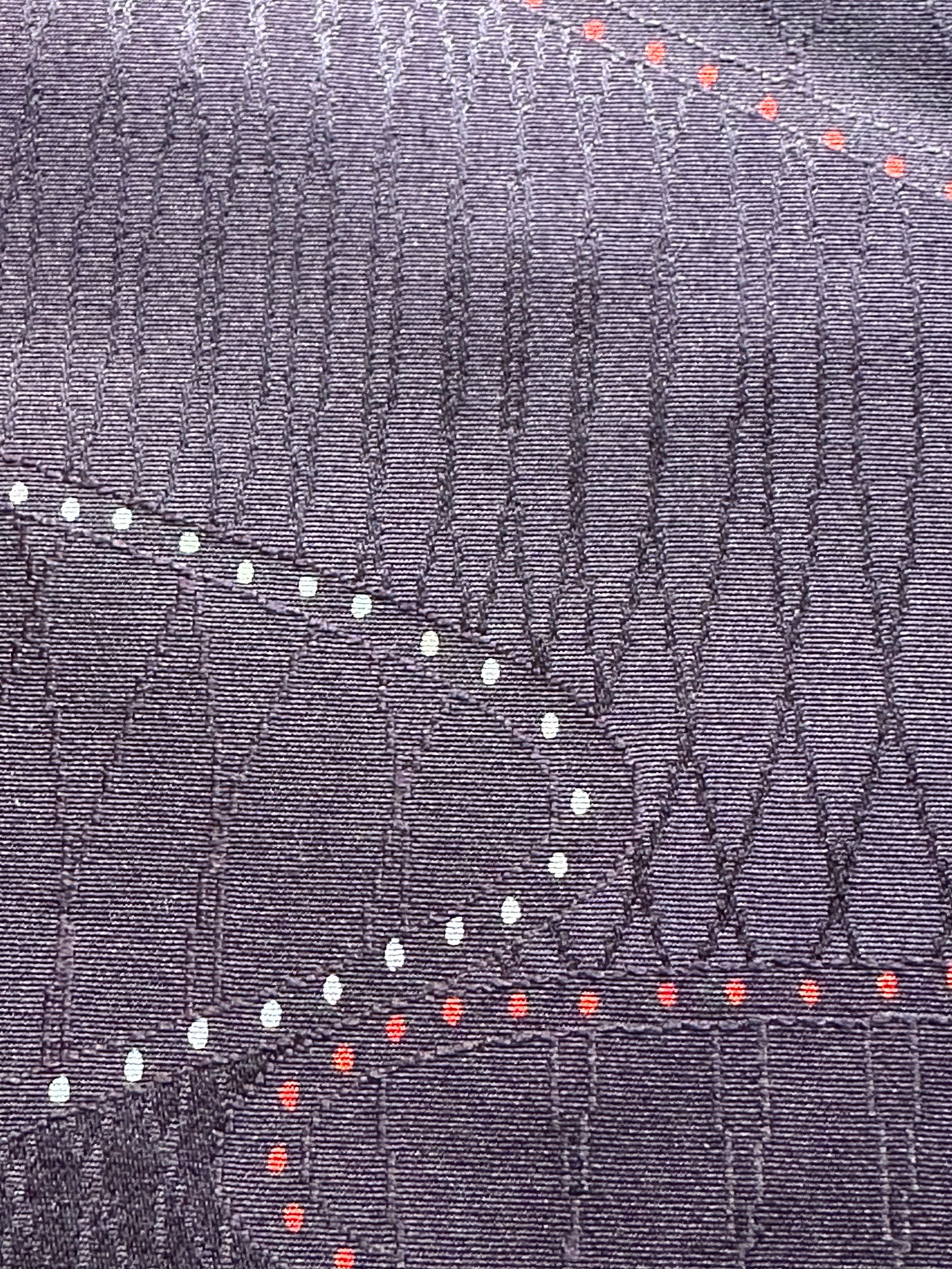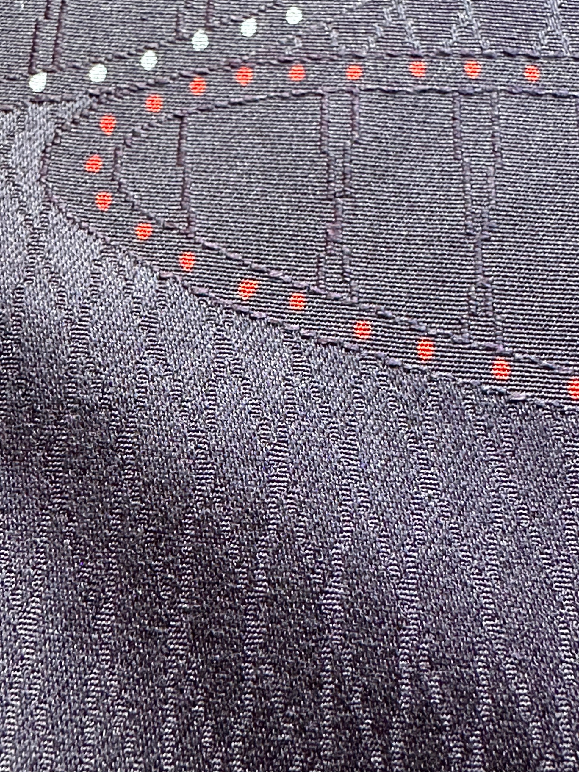 Description: This elegant haori features a Nisemurasaki color base, a sophisticated and muted shade of purple with subtle grey undertones that exude timeless elegance. Crafted from rinzu silk, the fabric showcases a delicate woven pattern, enhancing its luxurious texture. Flowing across the haori, white and red dots subtly emphasize the graceful movement of rivers, adding a classic touch to the design.