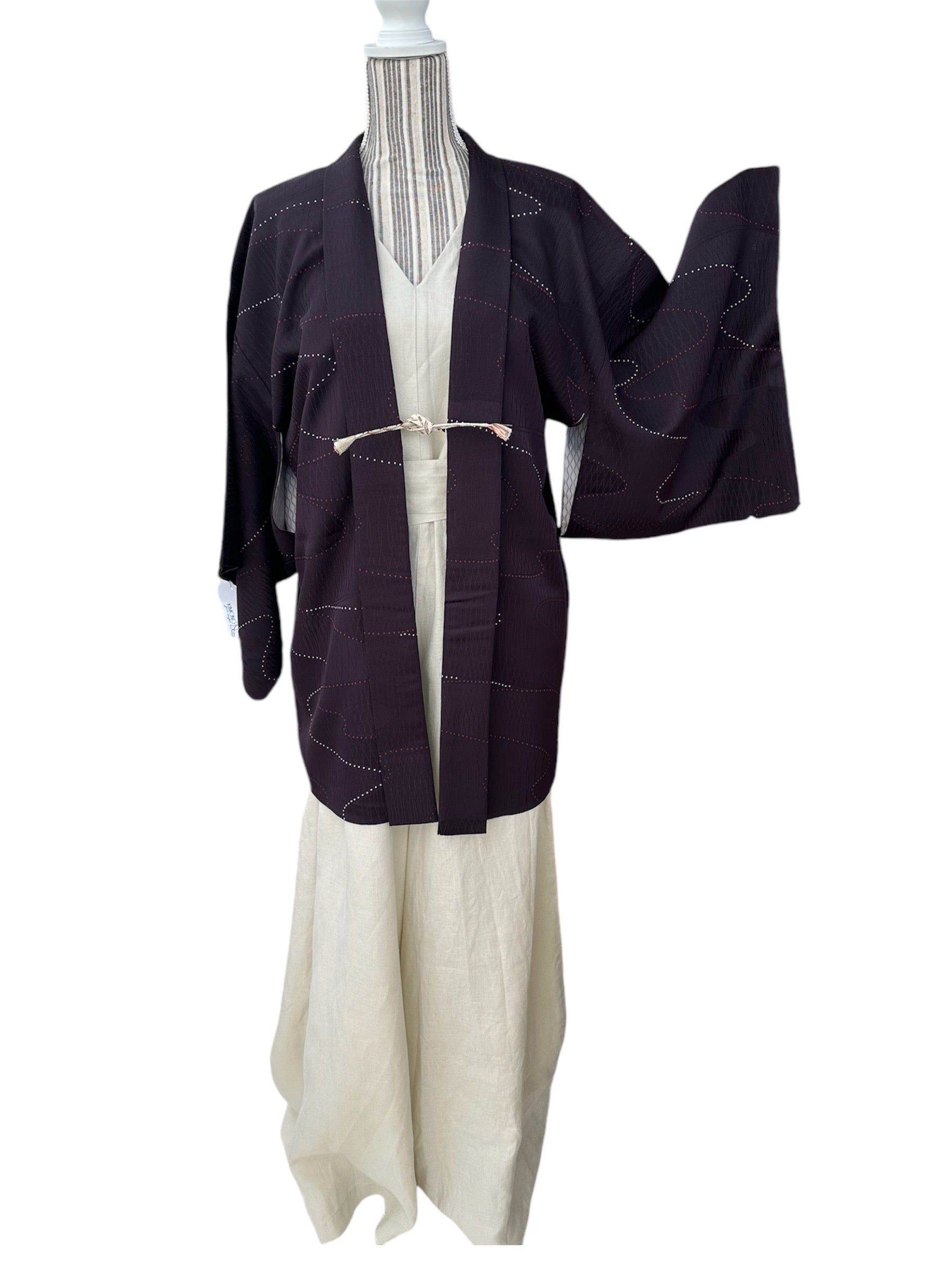Style: The haori comes complete with a haori himo, adding a traditional and decorative finishing touch. Its understated yet detailed design makes it versatile for both formal and casual wear, reflecting the artistry and elegance of Japanese textile craftsmanship.