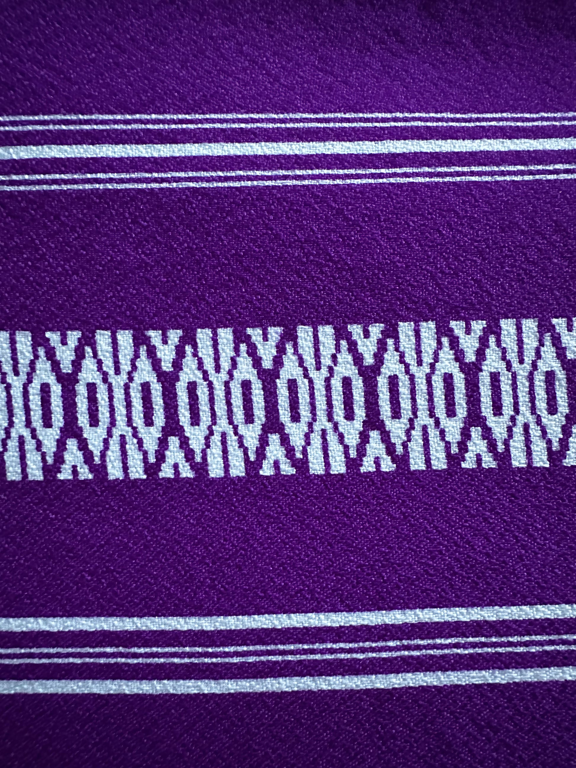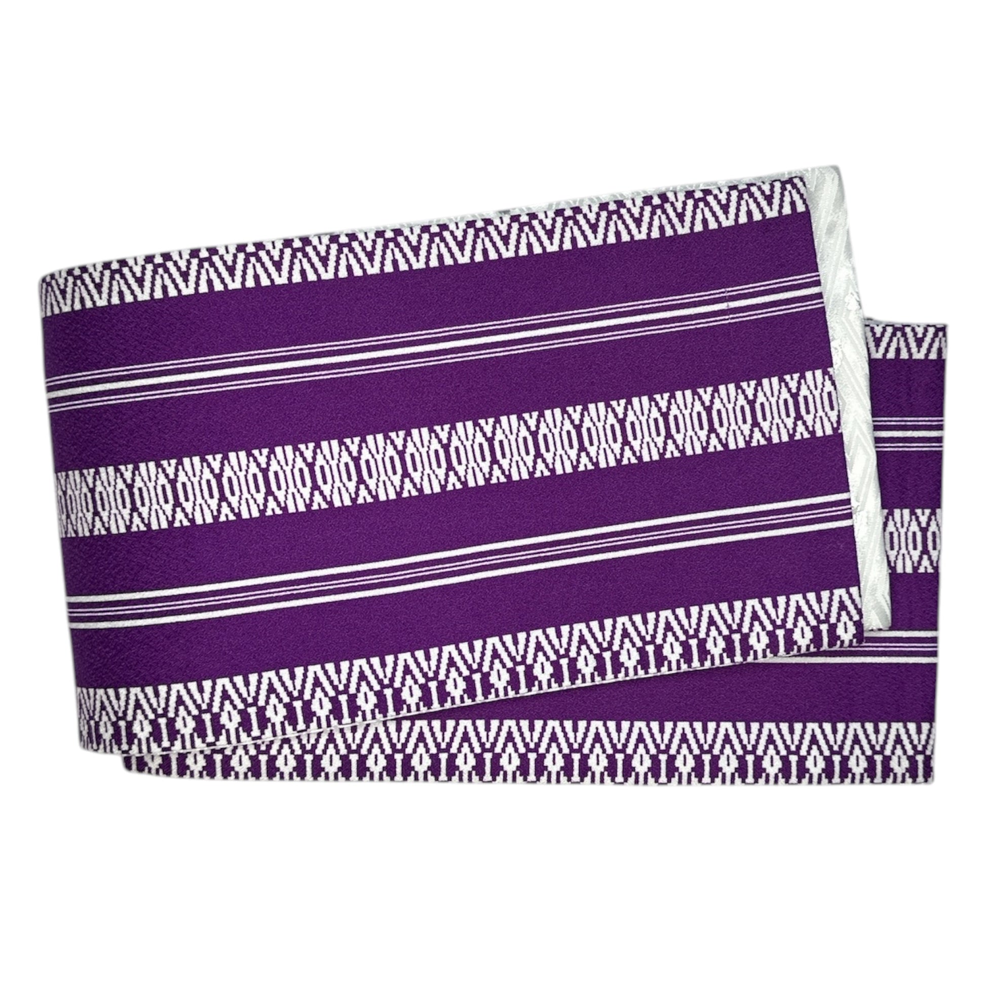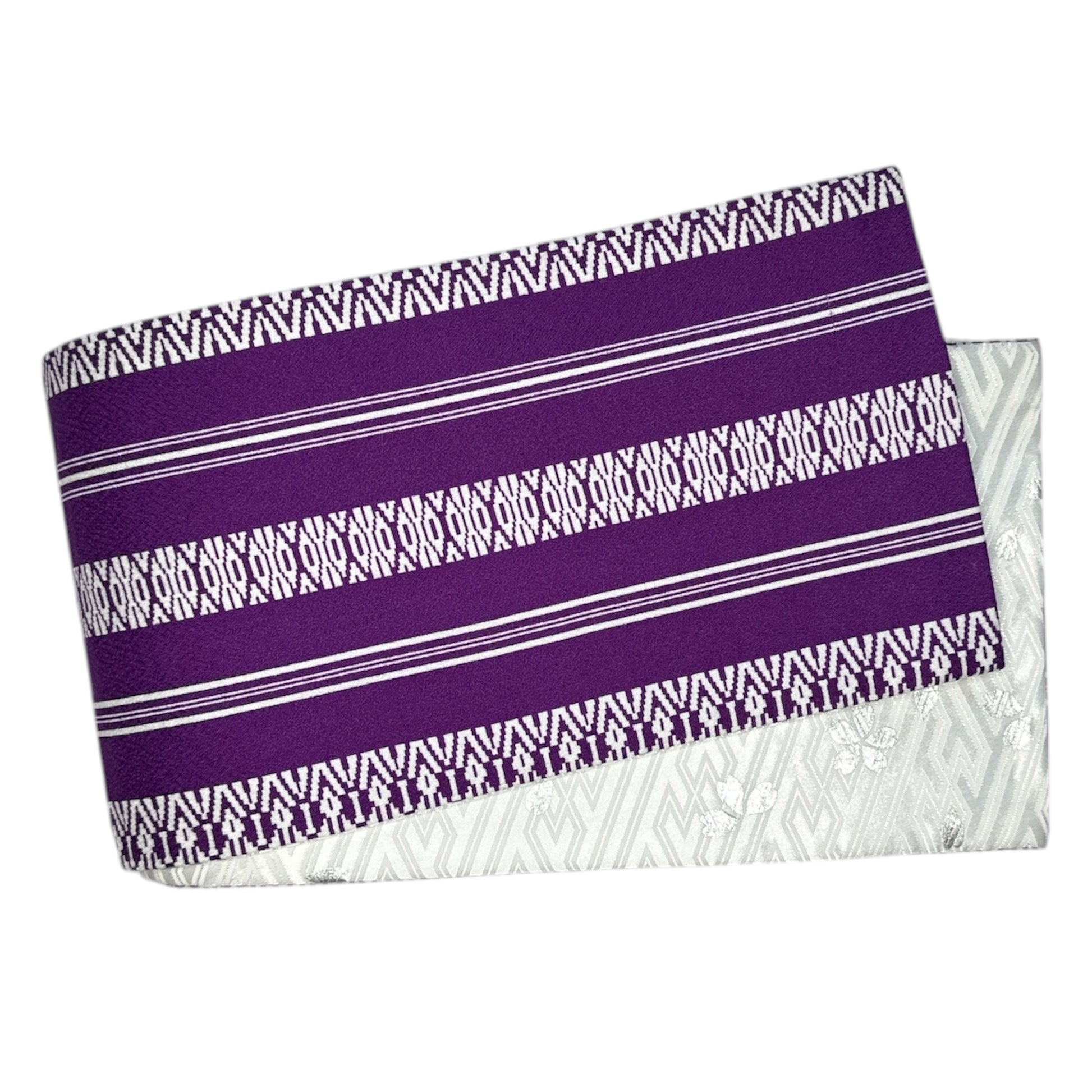 Description: This striking reversible hanhaba obi combines vivid color with graceful Japanese motifs, creating a perfect balance between modern style and traditional charm. One side features a vivid purple base with horizontal white stripes, adding rhythm, texture, and a touch of contemporary sophistication.