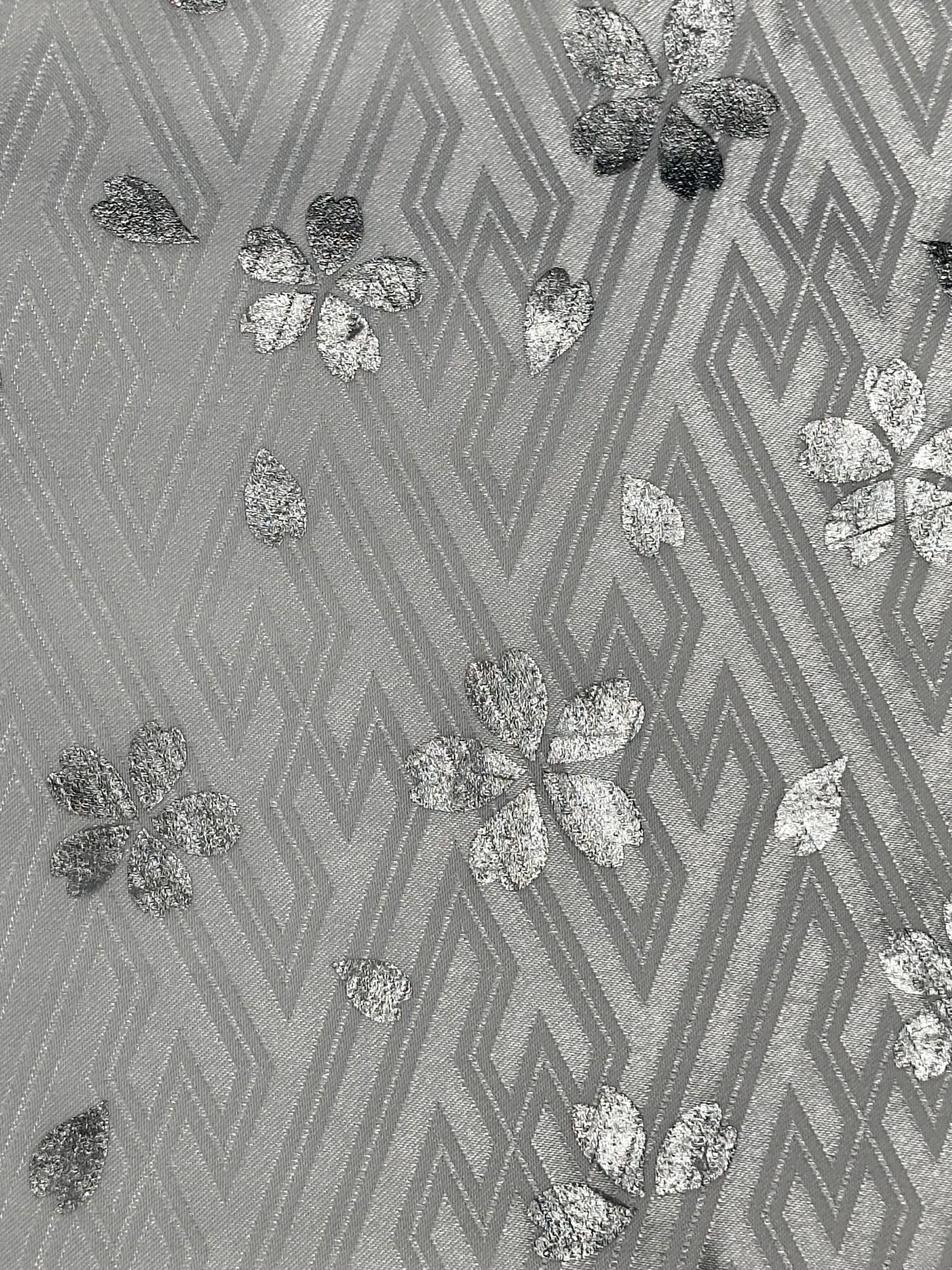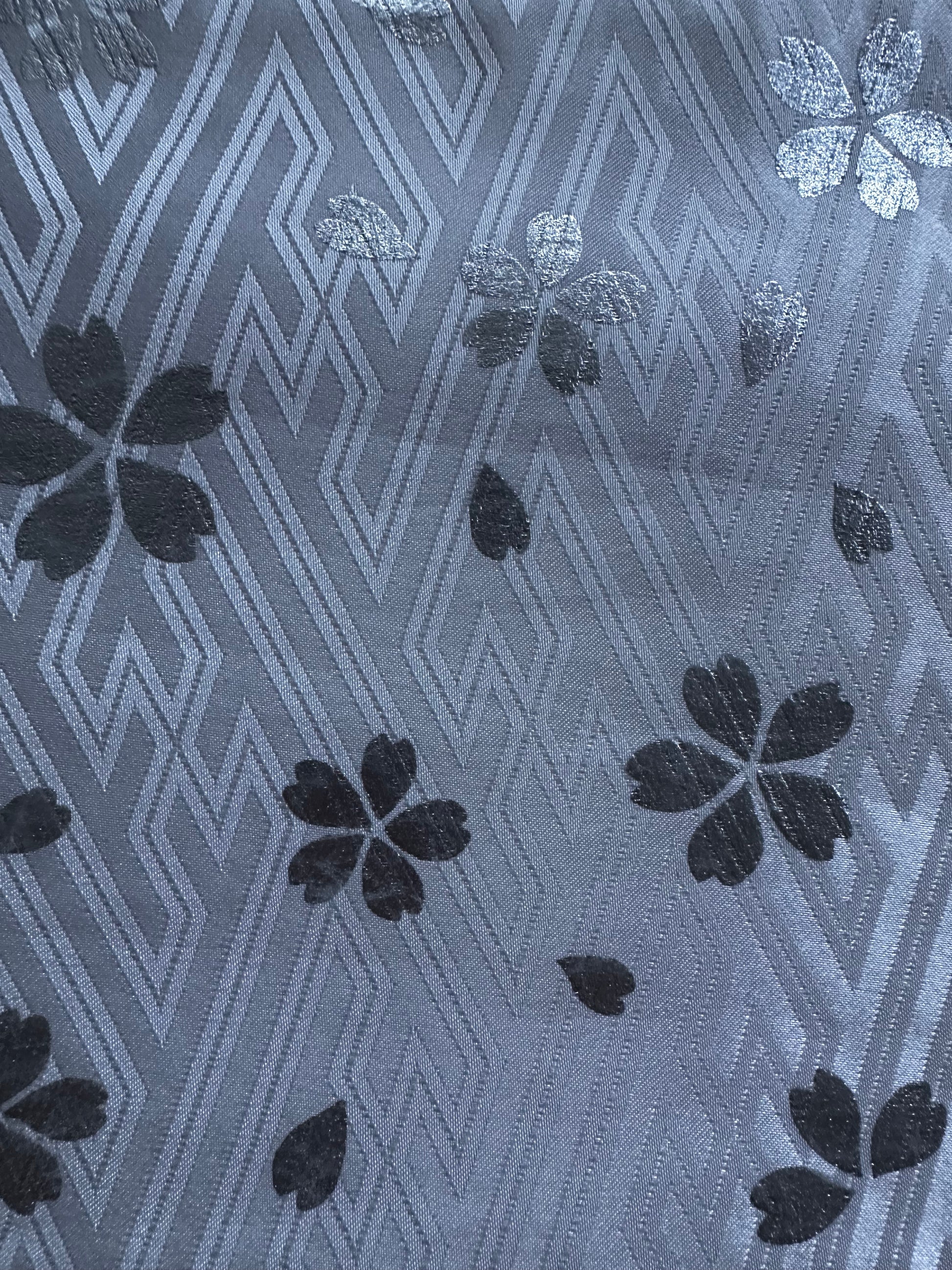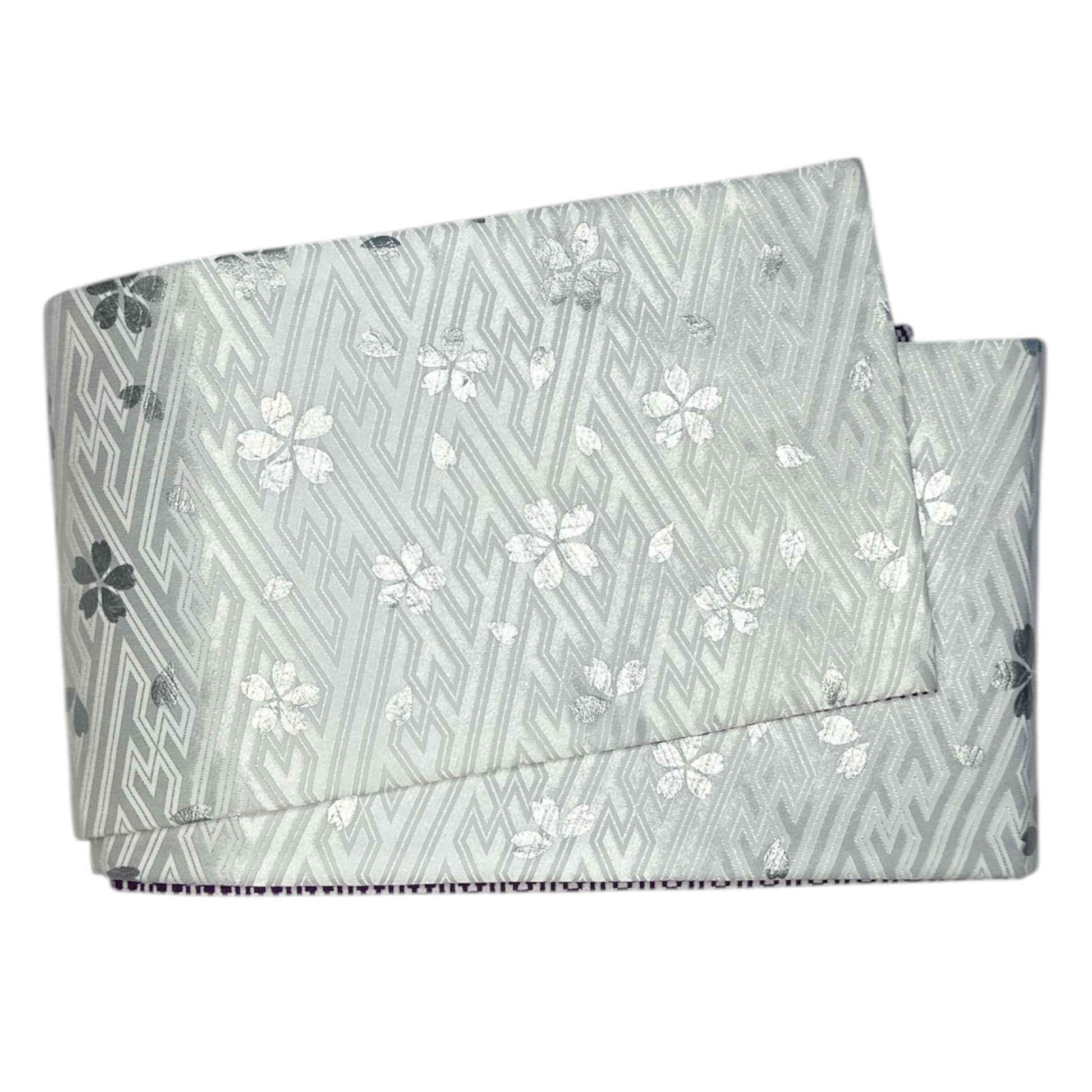 The reverse side features a soft white base with a woven sayagata (紗綾形) pattern — a traditional motif symbolizing longevity and prosperity — overlaid with silver-painted sakura blossoms and petals. The contrast between bold purple and gentle white makes this obi a versatile and eye-catching accessory for a variety of kimono styles.