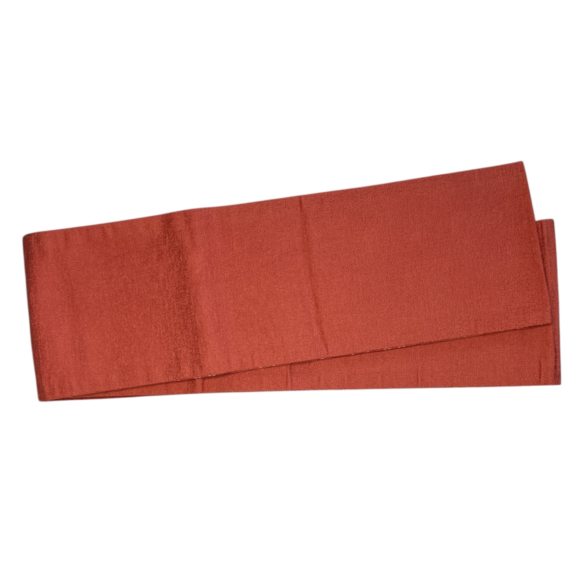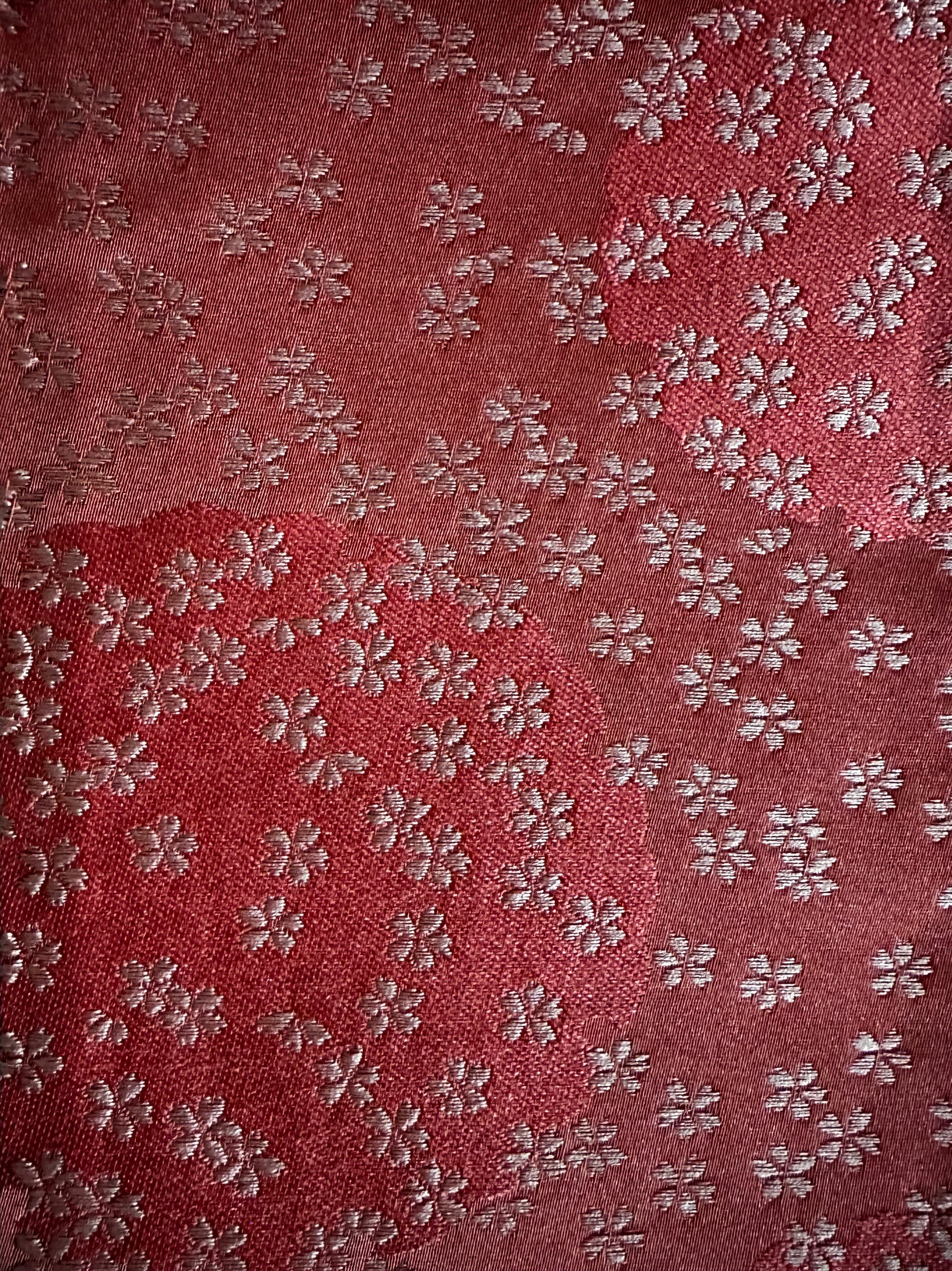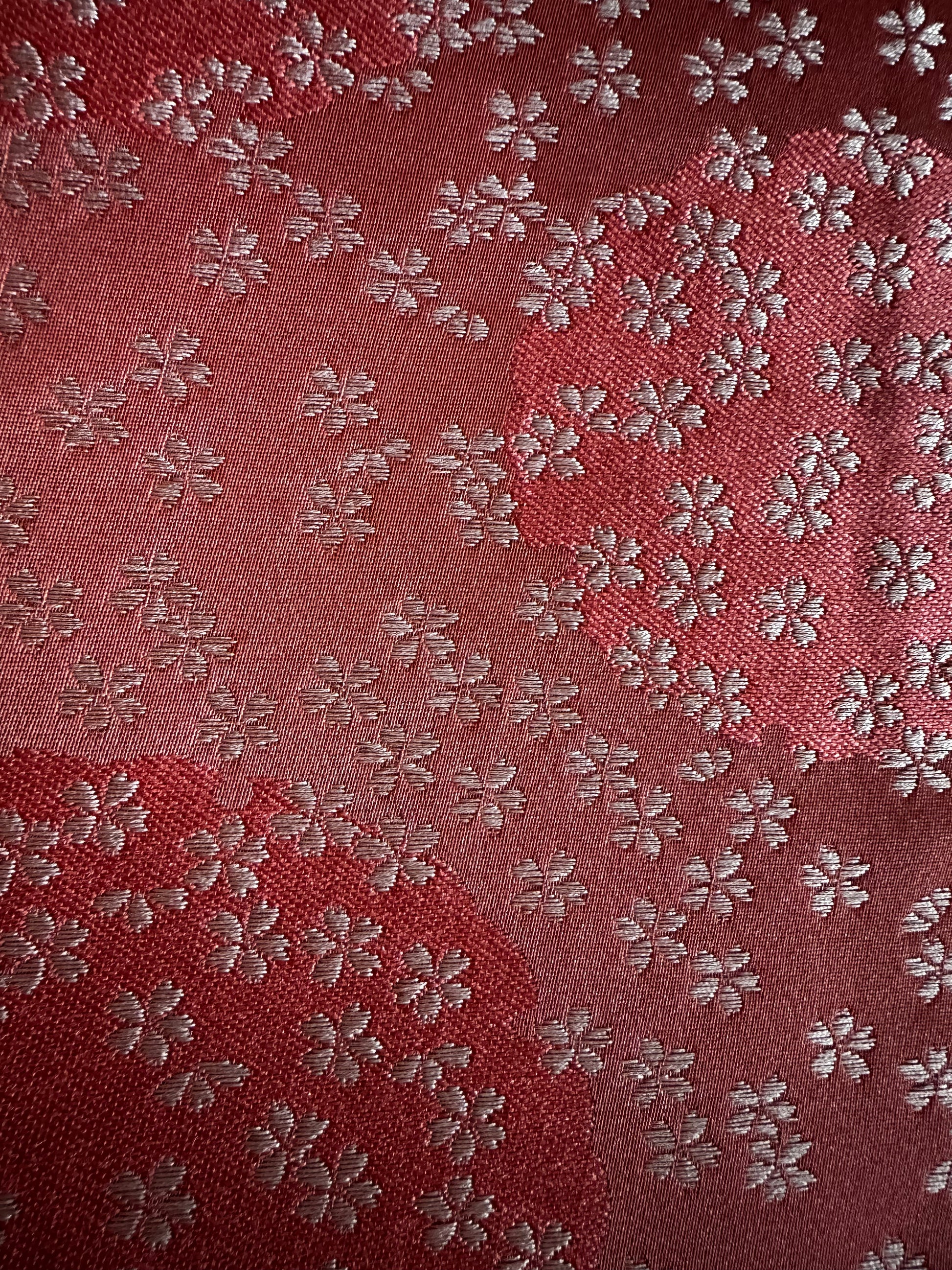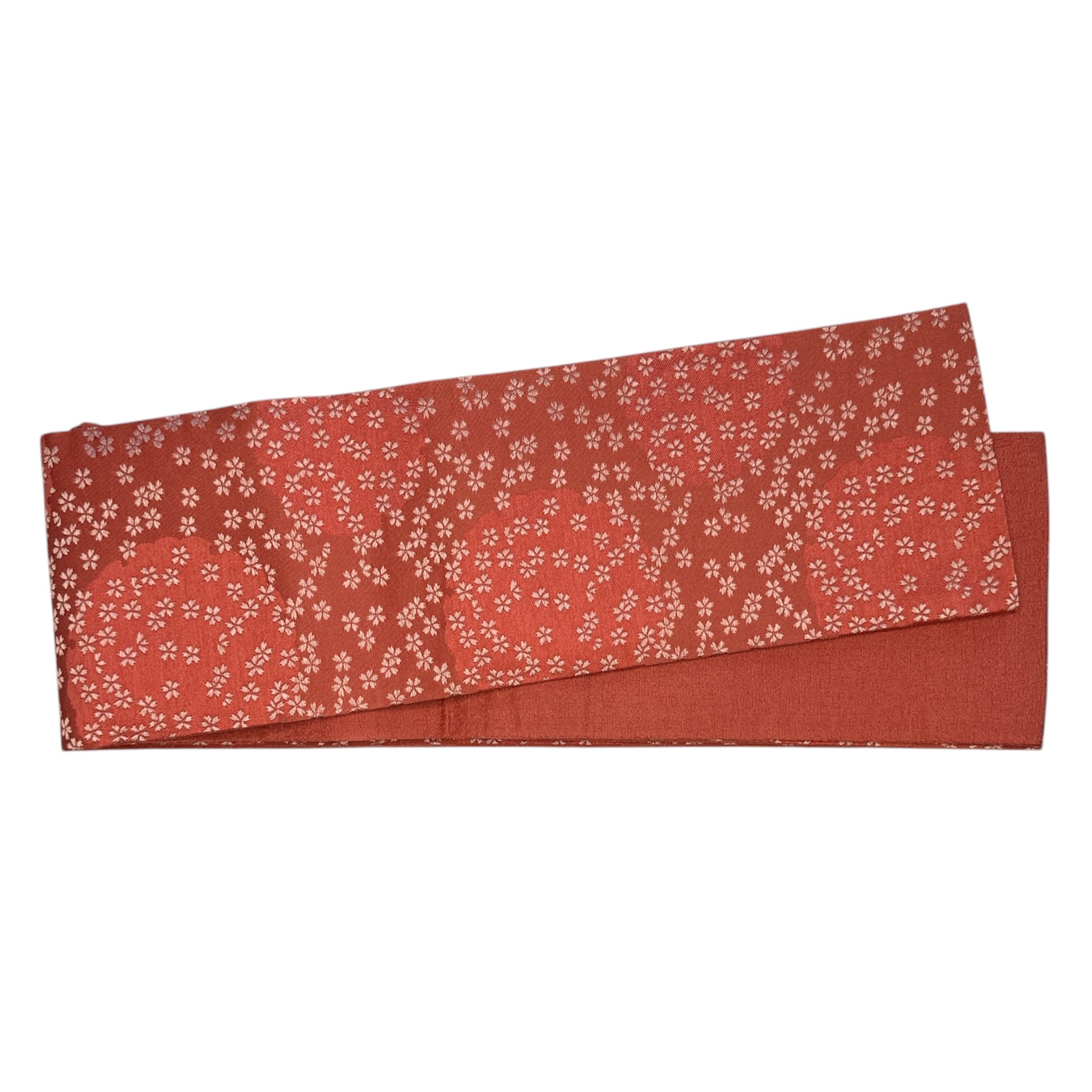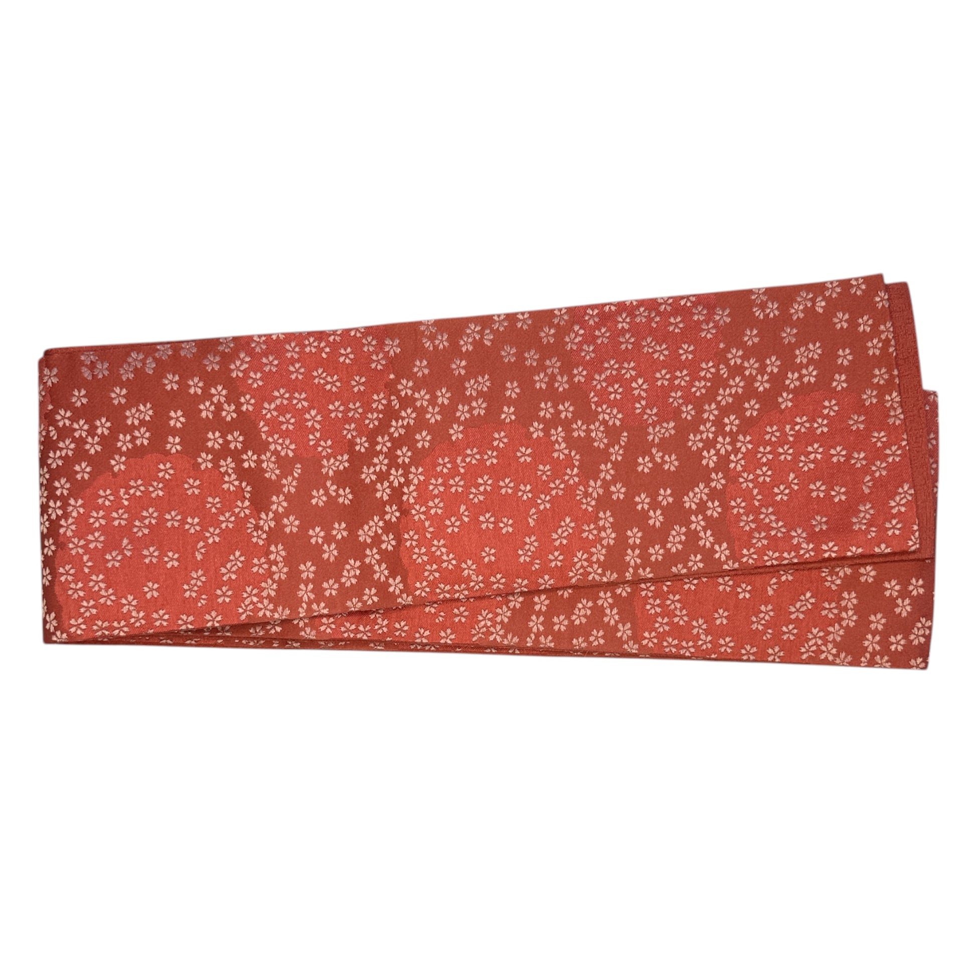 Description: This graceful hanhaba obi features a soft reddish-brown (vermilion) base beautifully woven with an all-over sakura (cherry blossom) pattern in a subtle light silver tone. The blossoms are delicately integrated into the jacquard weave, giving the fabric a refined texture and gentle shimmer that catches the light with movement.