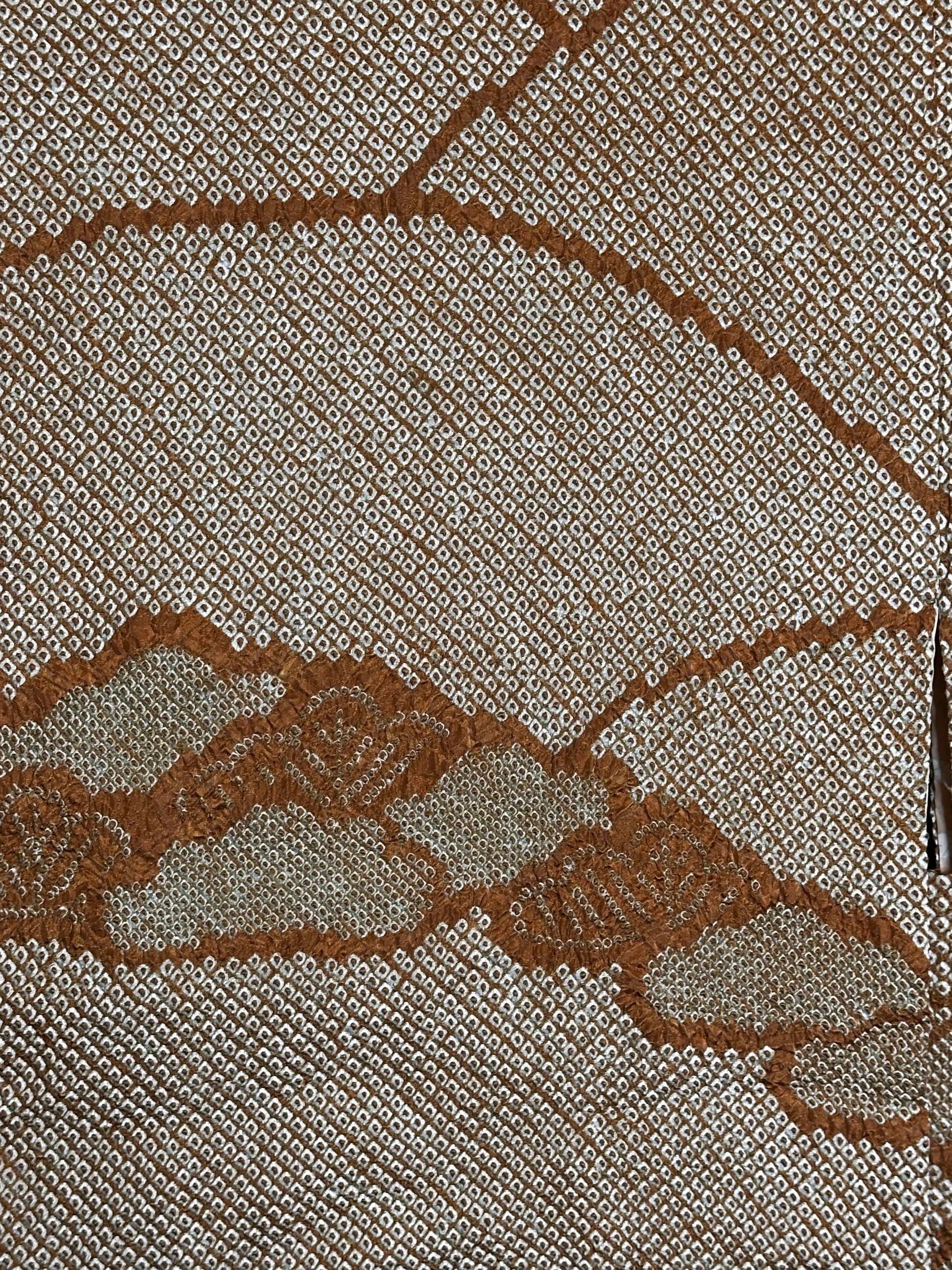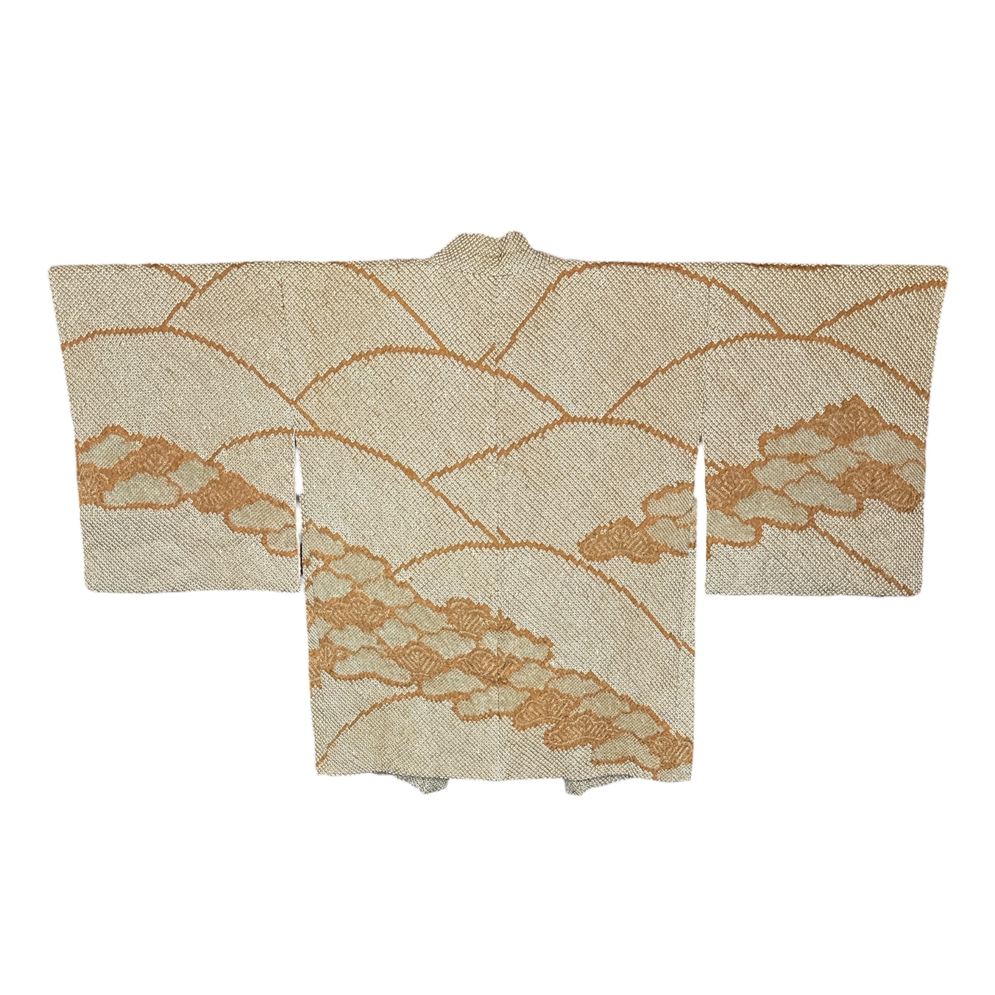Description: This women’s vintage haori is an elegant and exceptionally light garment crafted from fine rinzu silk using traditional shibori dyeing, a Japanese resist-dye technique in which fabric is bound, stitched, or gathered by hand before dyeing to create distinctive patterns and rich texture. The exterior features a soft light brown ground adorned with a serene mountain landscape and matsu (pine) motifs, symbols of endurance and harmony with nature. The shibori work lends the design a subtle three-dimensional quality and an organic, flowing presence.
