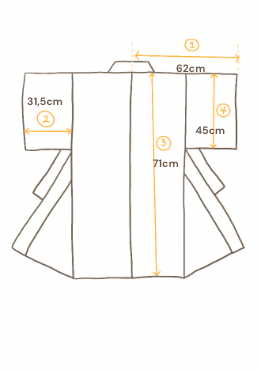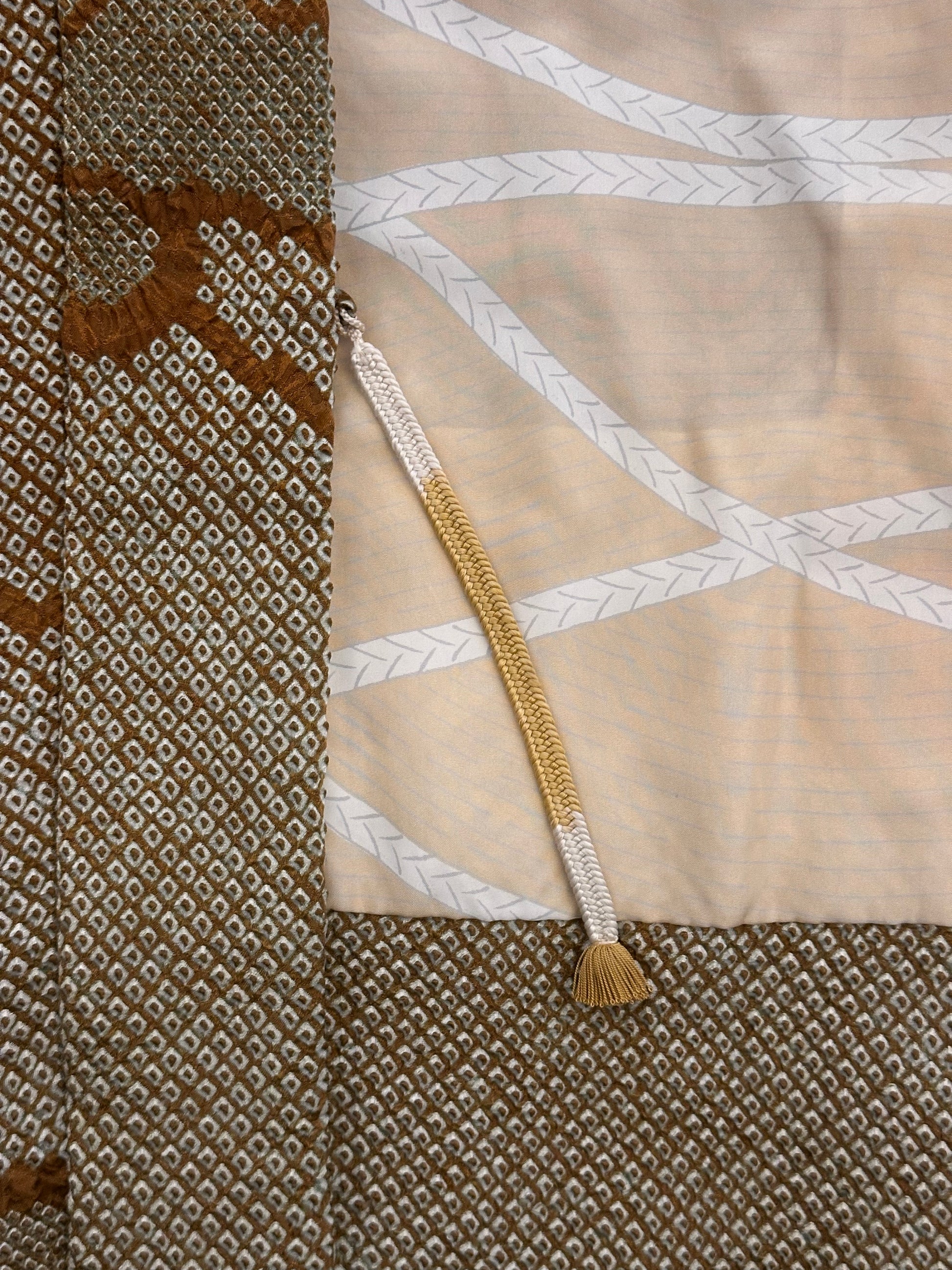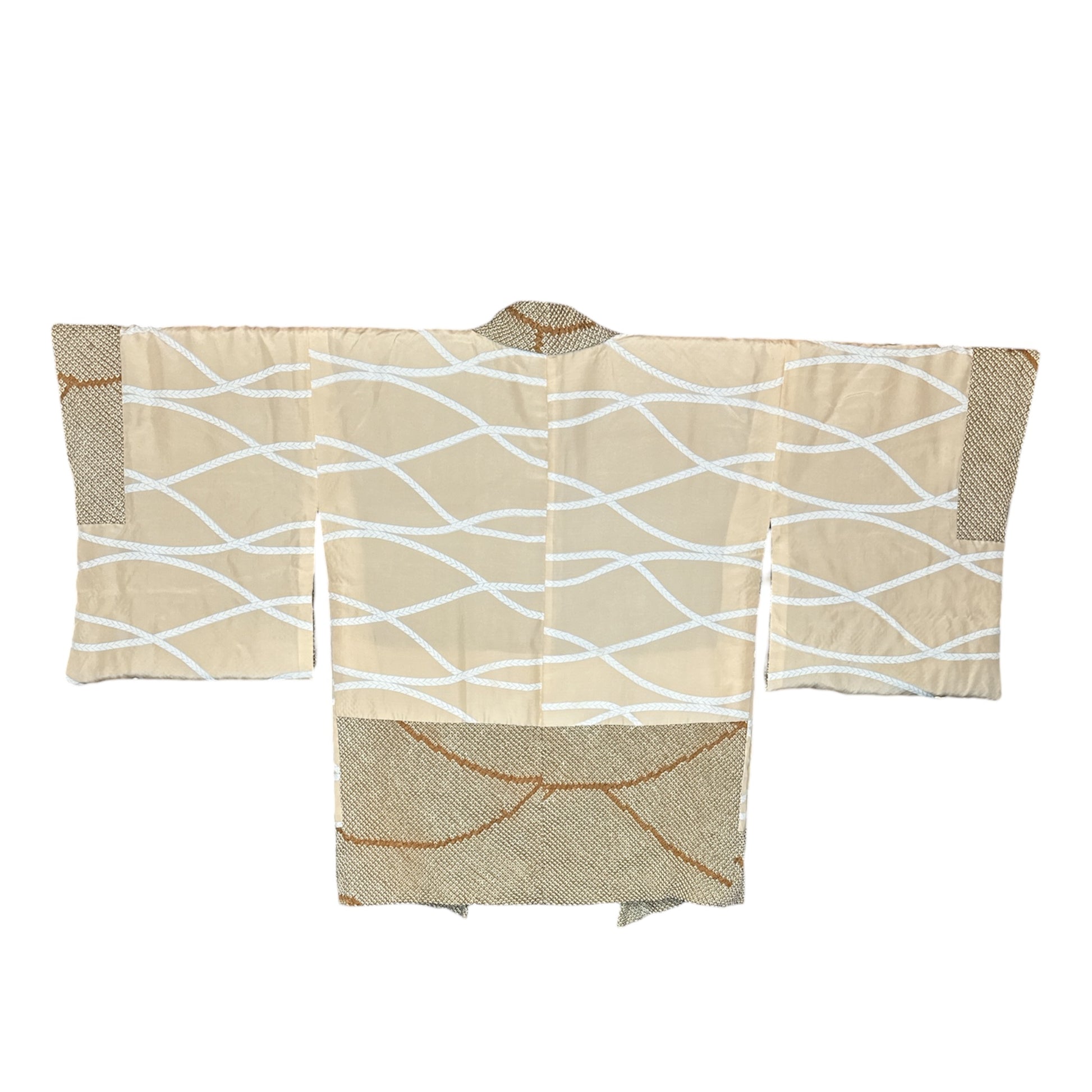 The haori is lined with beige silk decorated with a bell-pull rope (suzu-o) motif, traditionally associated with protection and good fortune. The interior complements the natural tones of the exterior, while traditional haori himo (decorative haori ties) complete the piece and preserve its authentic form.