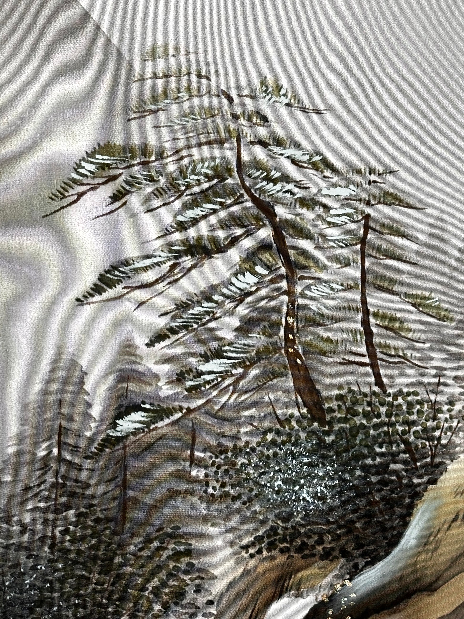 Description: This men’s haori is crafted from tsumugi silk, with a refined, textured exterior. The inner lining is hand-painted in a landscape scene featuring a waterfall, executed in warm, light tones with subtle turquoise accents, capturing the glimmer and movement of water as if sunlight dances across it. In Japanese culture, waterfalls symbolize resilience, the continuous flow of life, renewal, and purification, reflecting both natural beauty and spiritual clarity. The design evokes a sense of calm and energy simultaneously, blending artistry with cultural meaning.