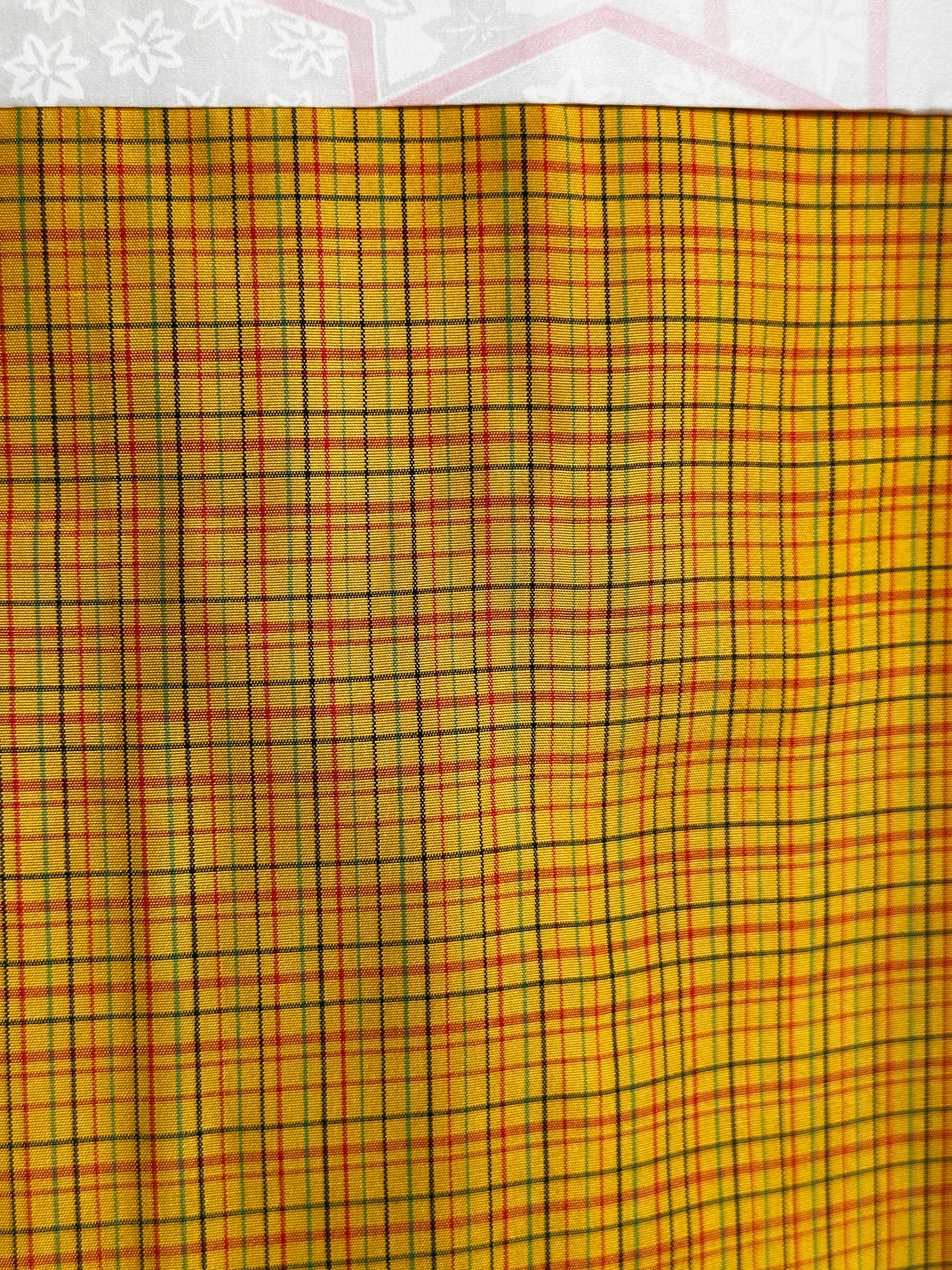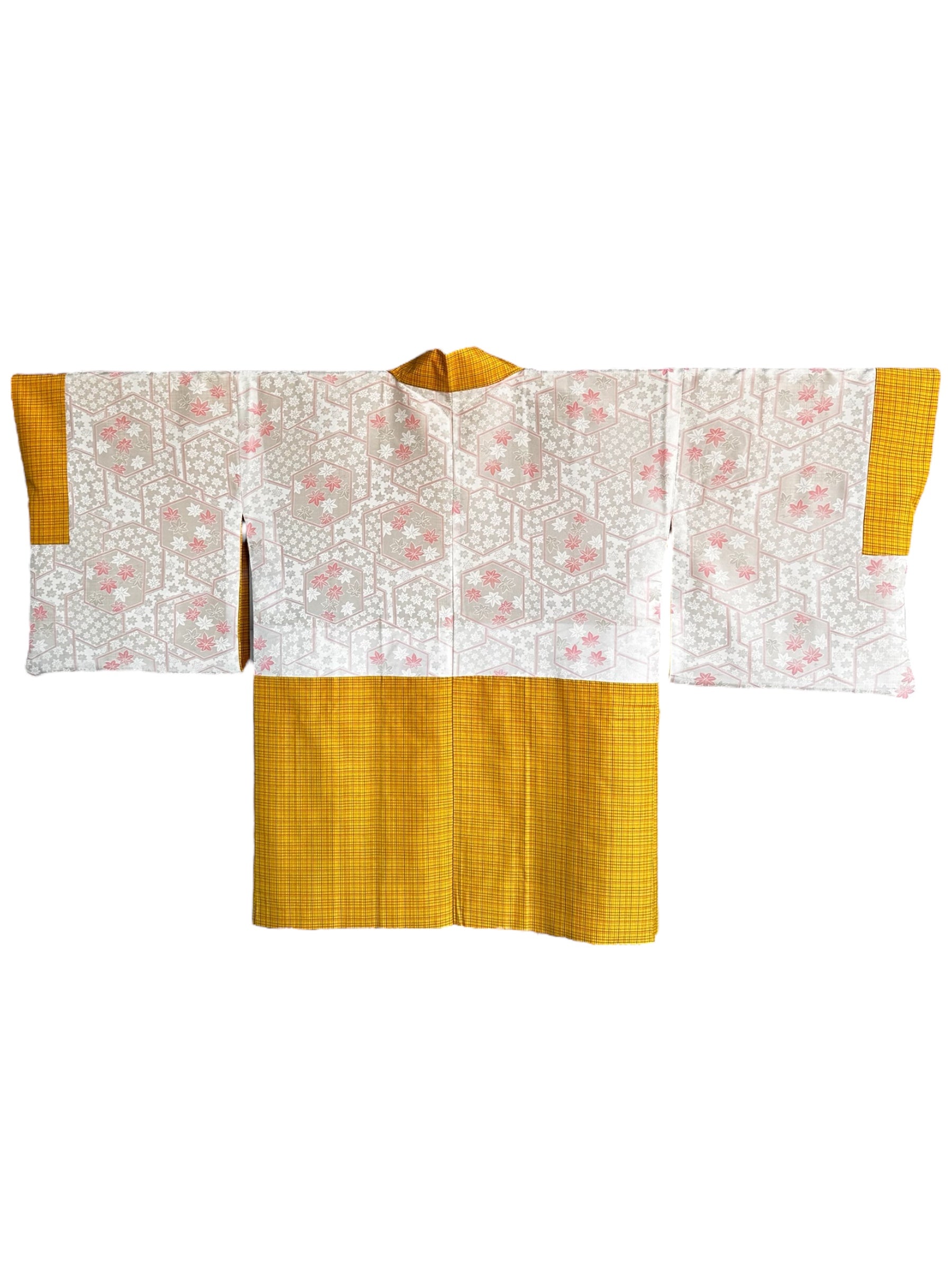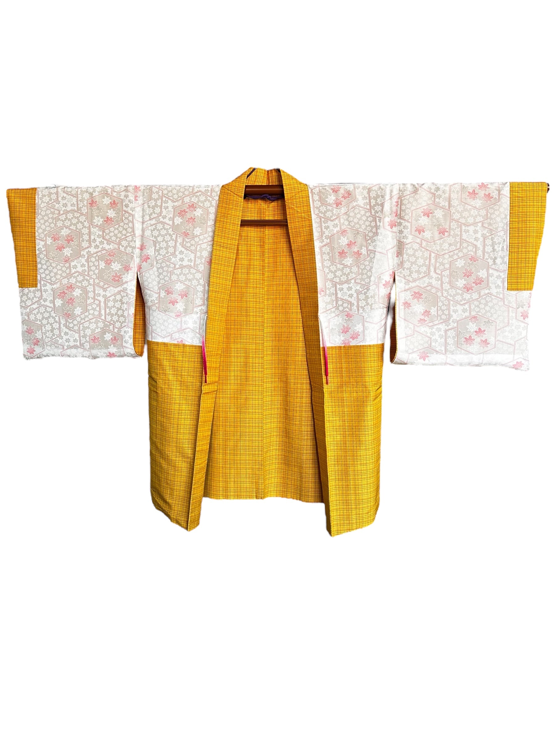 Descriere: Acest haori fermecător pentru femei, realizat din mătase Pongee (Tsumugi), are o culoare de bază galbenă veselă, împodobită cu un model de carouri mic și subtil. Captând perfect spiritul perioadei Showa (anii 1950-1980), haori emană căldură și sofisticare. Căptușeala din mătase este excepțional de netedă pe piele, asigurând atât confort, cât și eleganță. Căptușeala interioară are un model care se repetă de momiji stilizat (frunze de arțar) asociat cu un model neregulat kikko (carapace de broască țestoasă), redat în tonuri moi, atenuate, care adaugă profunzime și contrast subtil. O caracteristică remarcabilă este haori himo (snururi decorative), gradientul său delicat de la roz la alb care completează frumos designul general și adaugă un efect vizual rafinat.