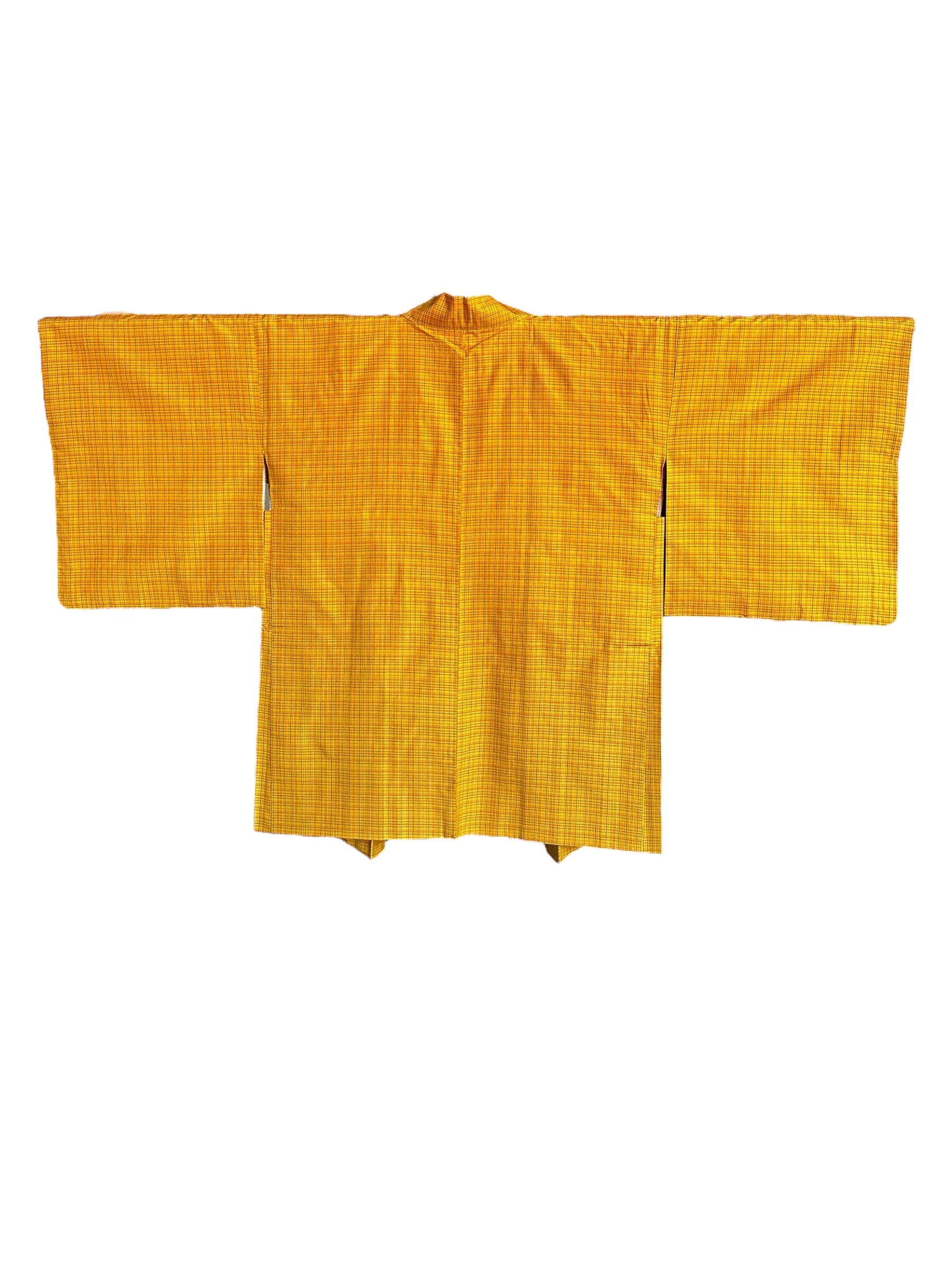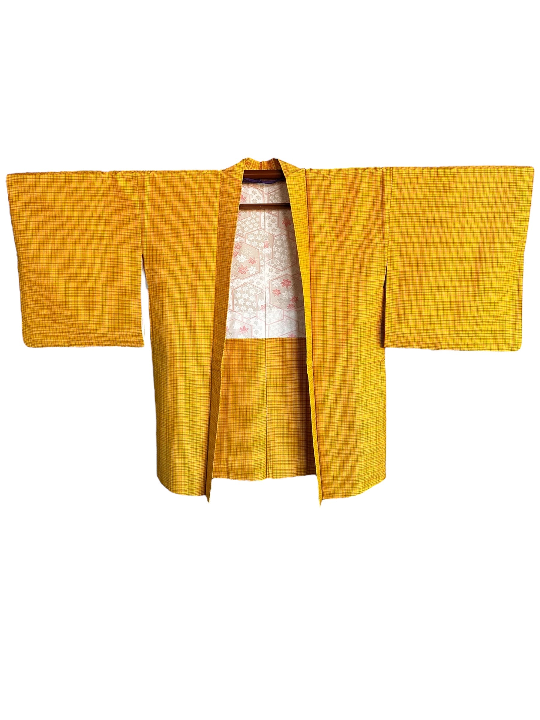 Stil: Culoarea de bază galbenă veselă și modelul cu carouri mici sunt perfect echilibrate de motivele delicate momiji și kikko de pe căptușeala interioară. Gradientul frumos al haori himo adaugă o notă perfectă de eleganță, făcând această piesă ideală atât pentru ocazii casual, cât și pentru ocazii semi-formale.