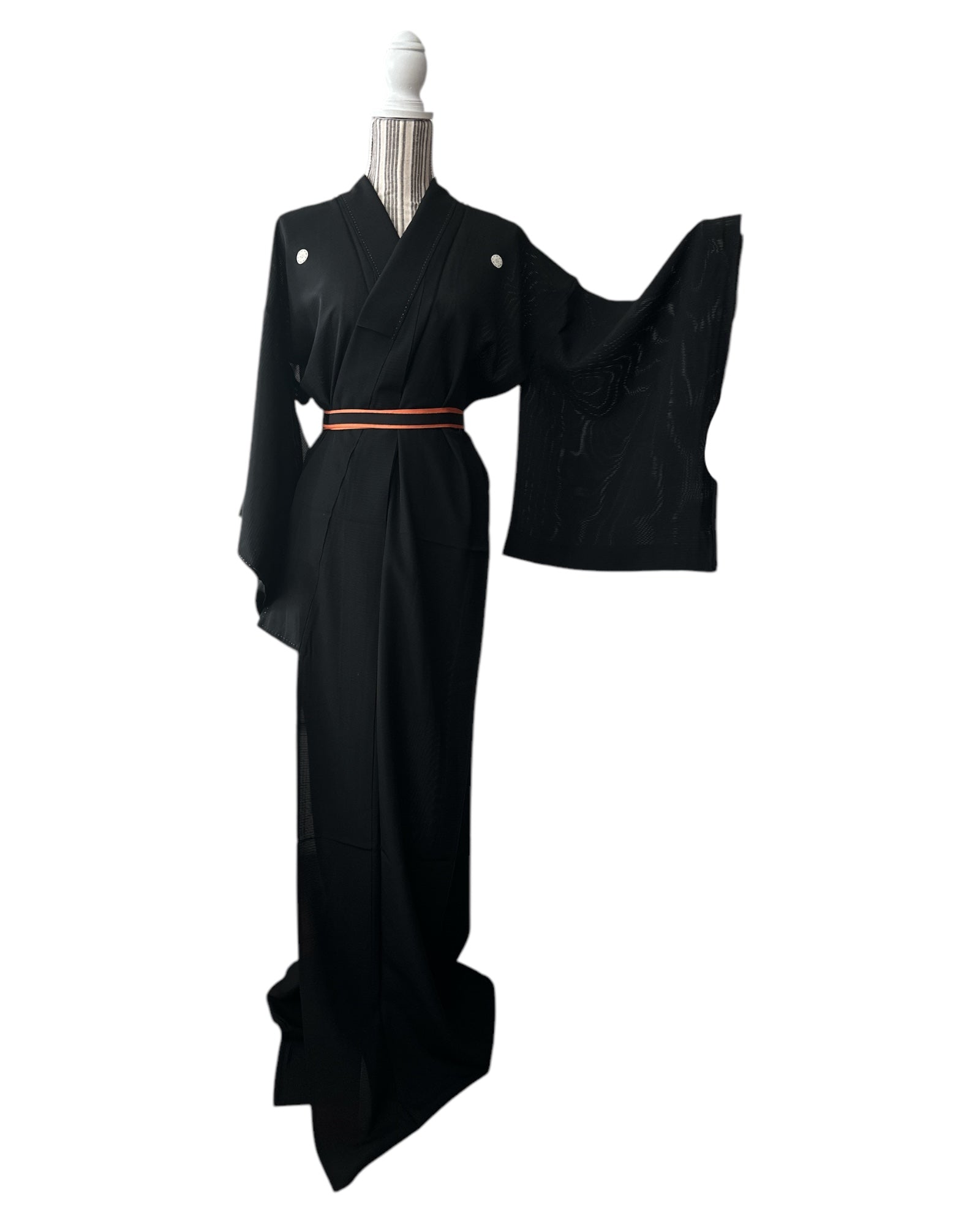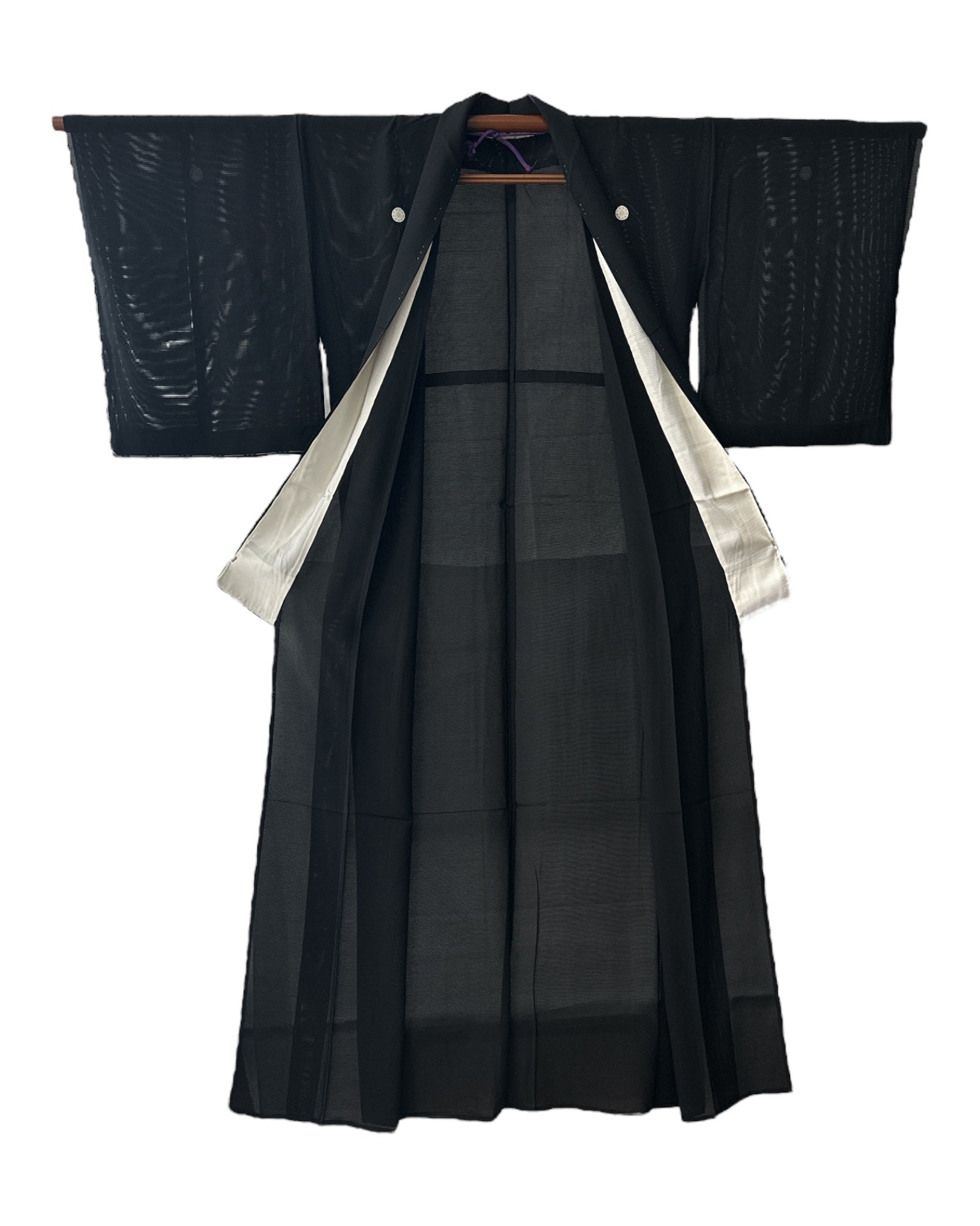 Descriere: Acest chimono negru elegant Ro Mofuku este realizat dintr-o mătase Ro delicată, transparentă, perfect pentru anotimpurile mai calde sau ocaziile formale. Construcția Hitoe (cu un singur strat) îmbunătățește senzația de ușoară și aerisită a kimonoului, în timp ce culoarea sa neagră bogată emană o sofisticare atemporală.