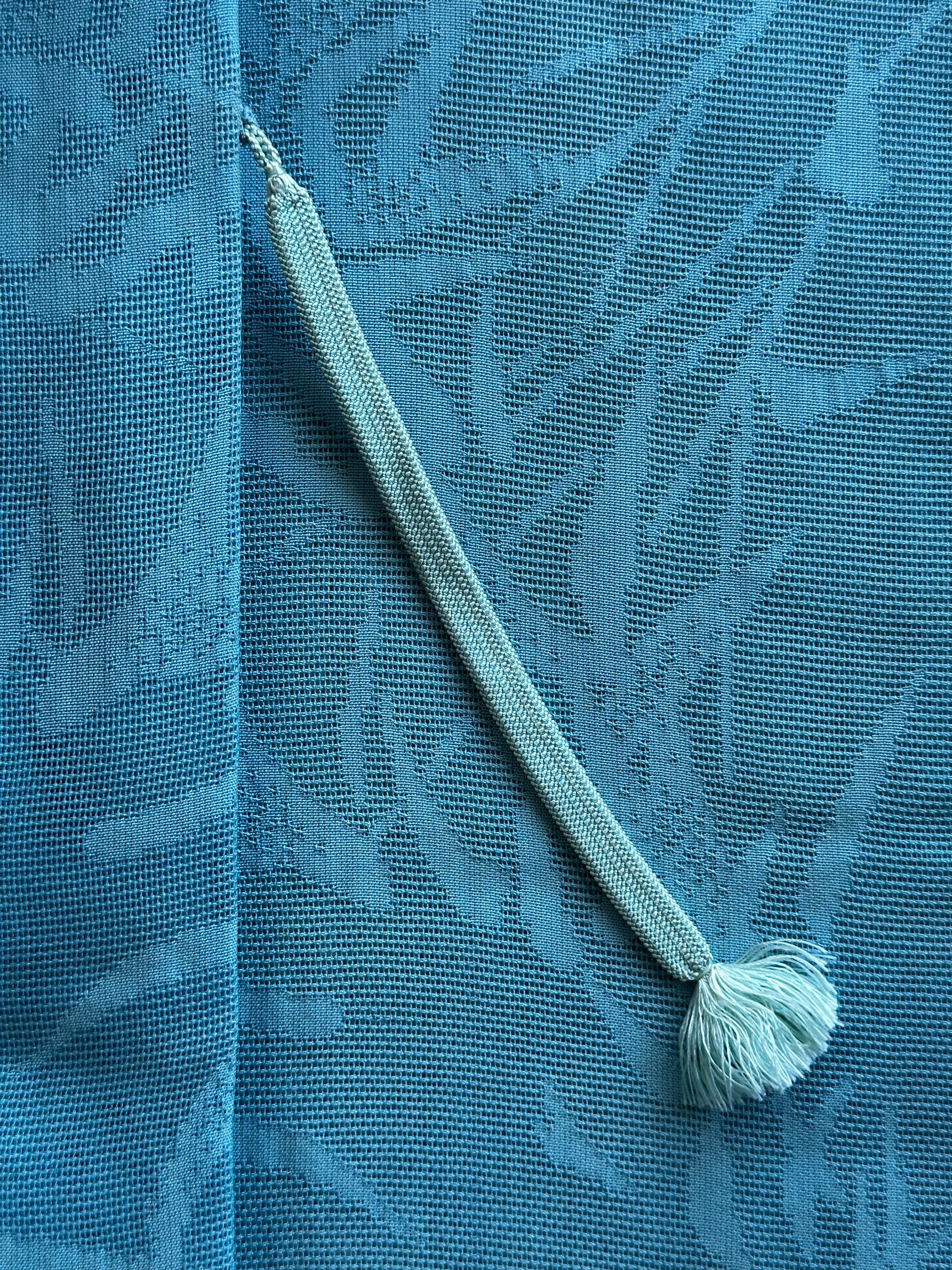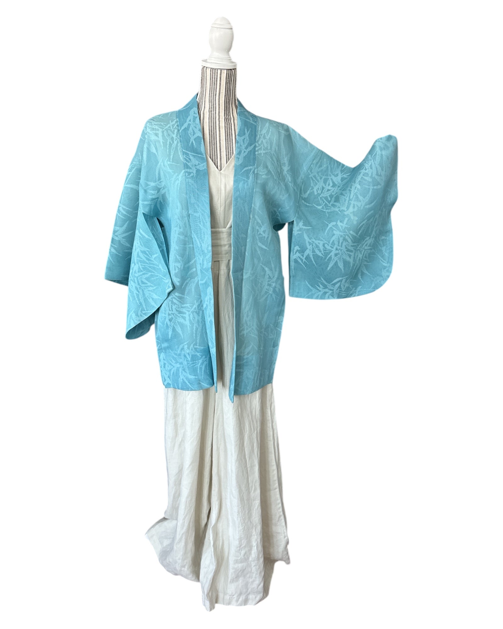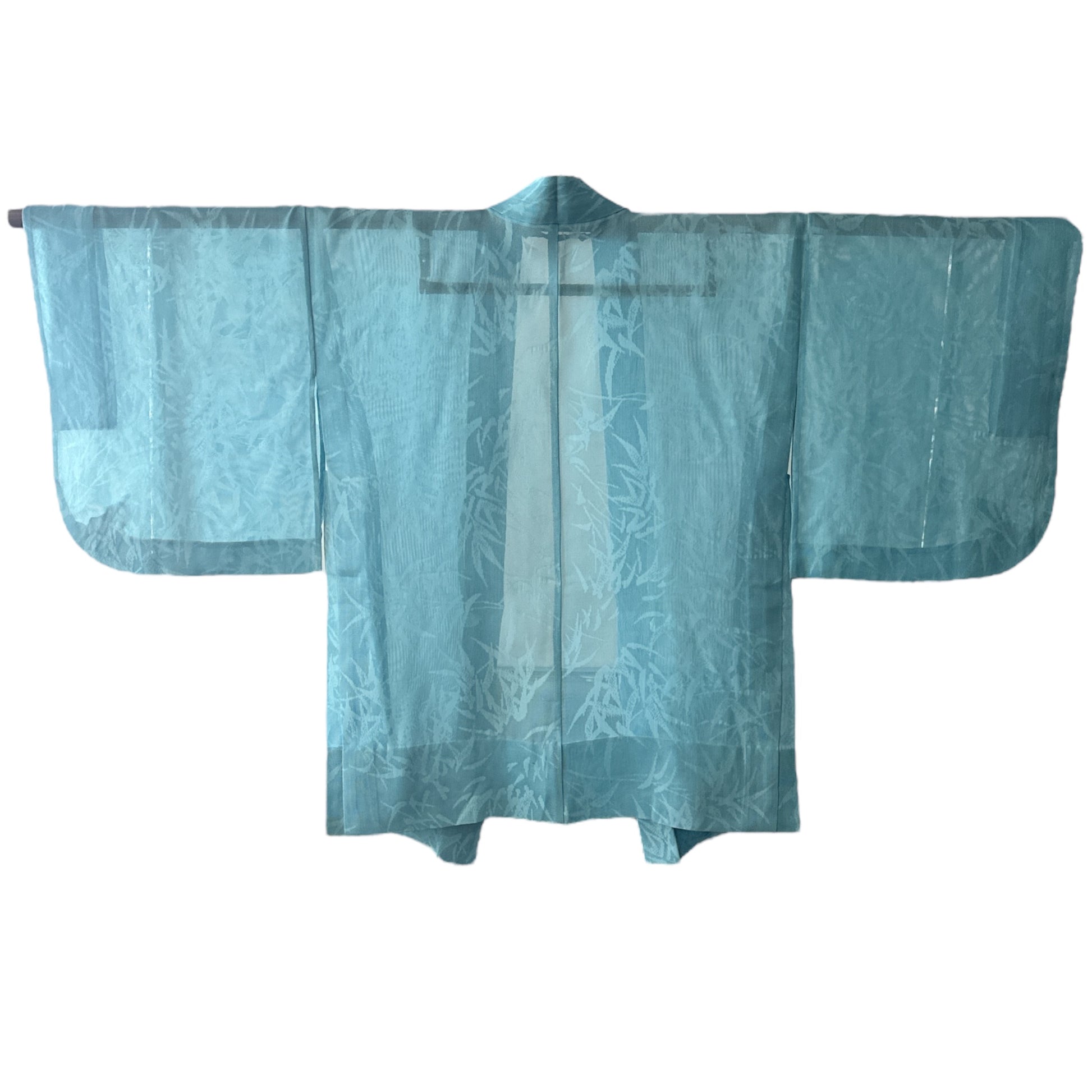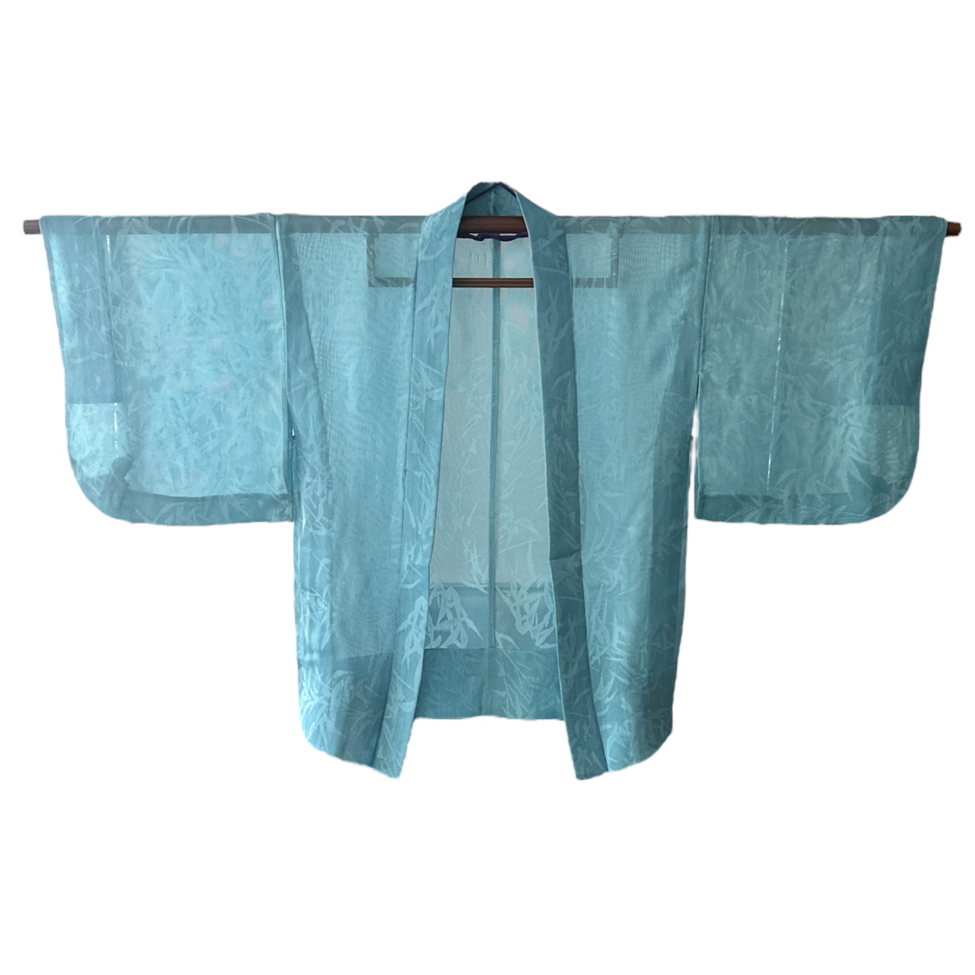 Descriere: Acest haori vintage de vară este o piesă frumos subestimată, țesută din mătase brută aerisită într-o nuanță delicată de albastru deschis . Țesătura prezintă un model elegant de frunze mici de bambus sasa, țesute subtil în material, adăugând o notă naturală și rafinată. Construcția sa ușoară permite o draperie curgătoare, fără efort, făcându-l să se simtă la fel de revigorant ca o briză de vară. Haori este completat cu legăturile sale originale haori himo , păstrându-și farmecul tradițional.