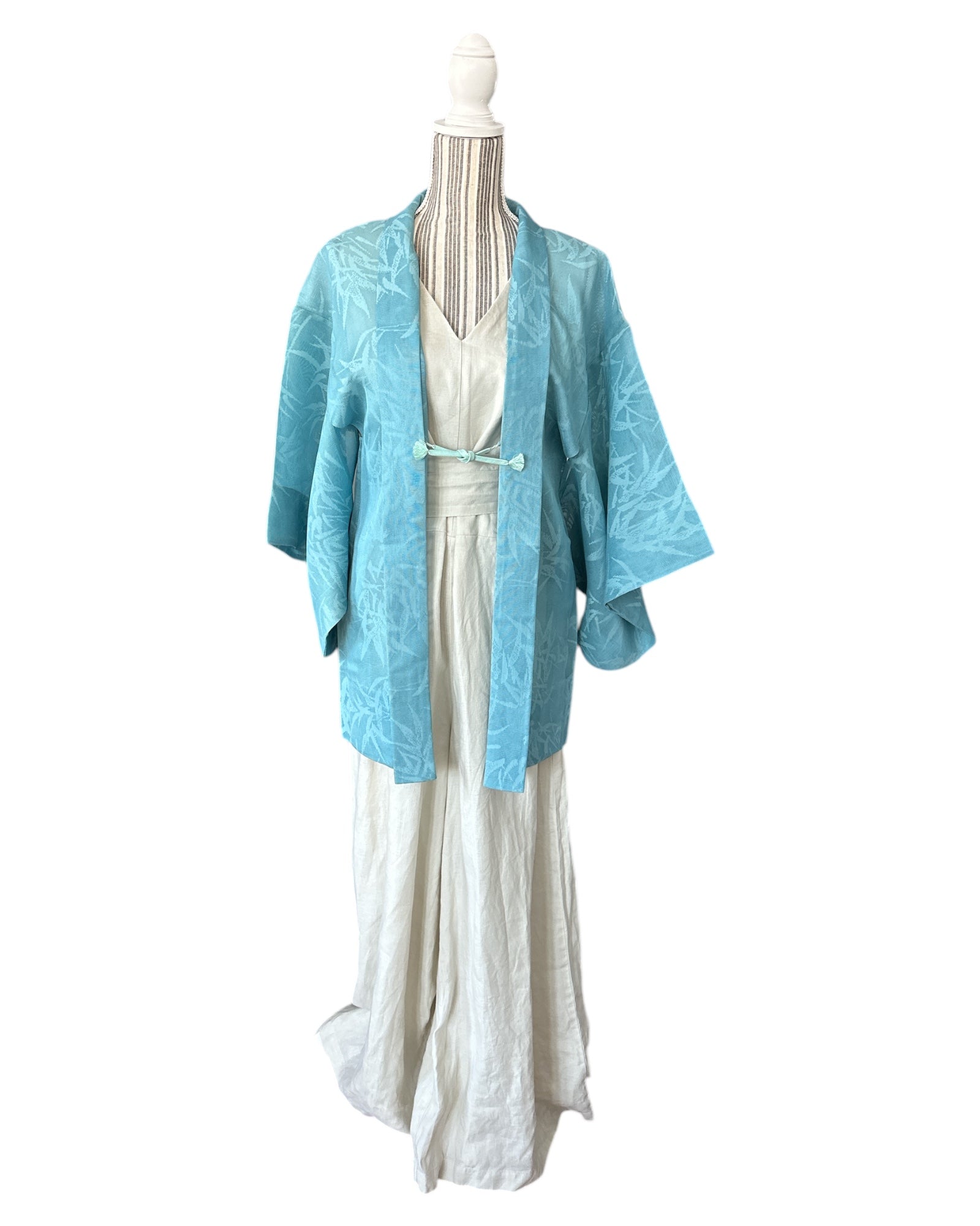 Material: Fabricat din mătase brută, acest haori are o senzație moale, texturată, rămânând în același timp incredibil de ușor și respirabil. Fibrele naturale îi sporesc calitatea aerisită, făcându-l o piesă ideală de stratificare pentru anotimpurile mai calde. Modelul țesut cu frunze de bambus sasa se îmbină perfect în țesătură, adăugând profunzime fără a depăși designul.