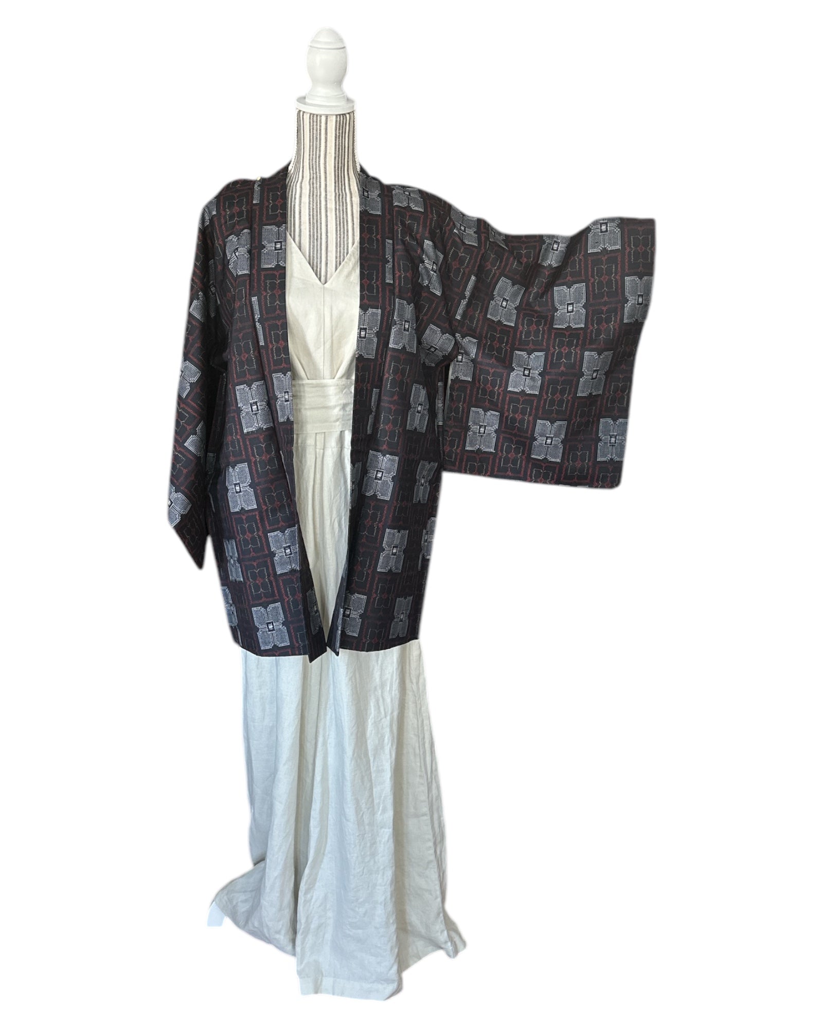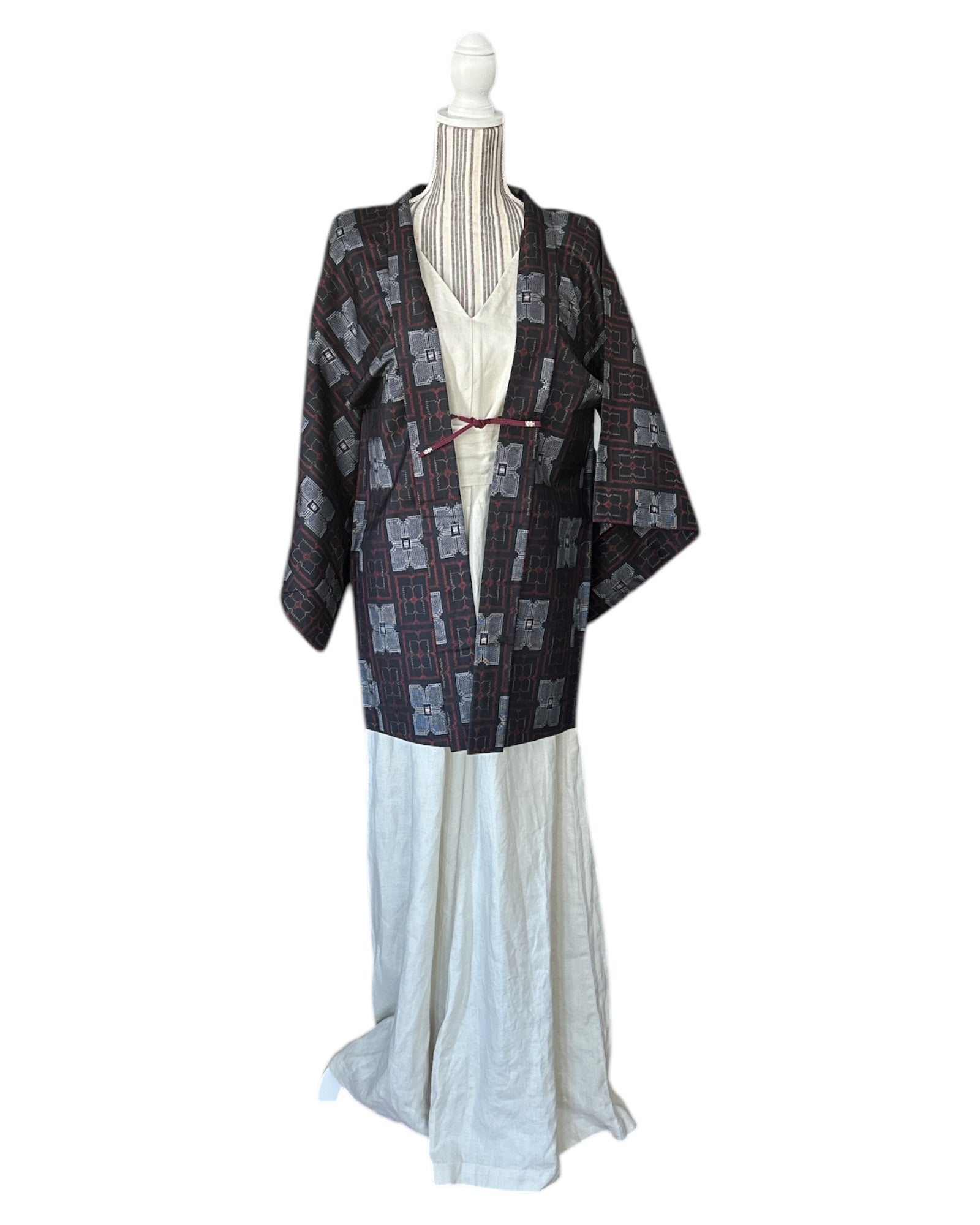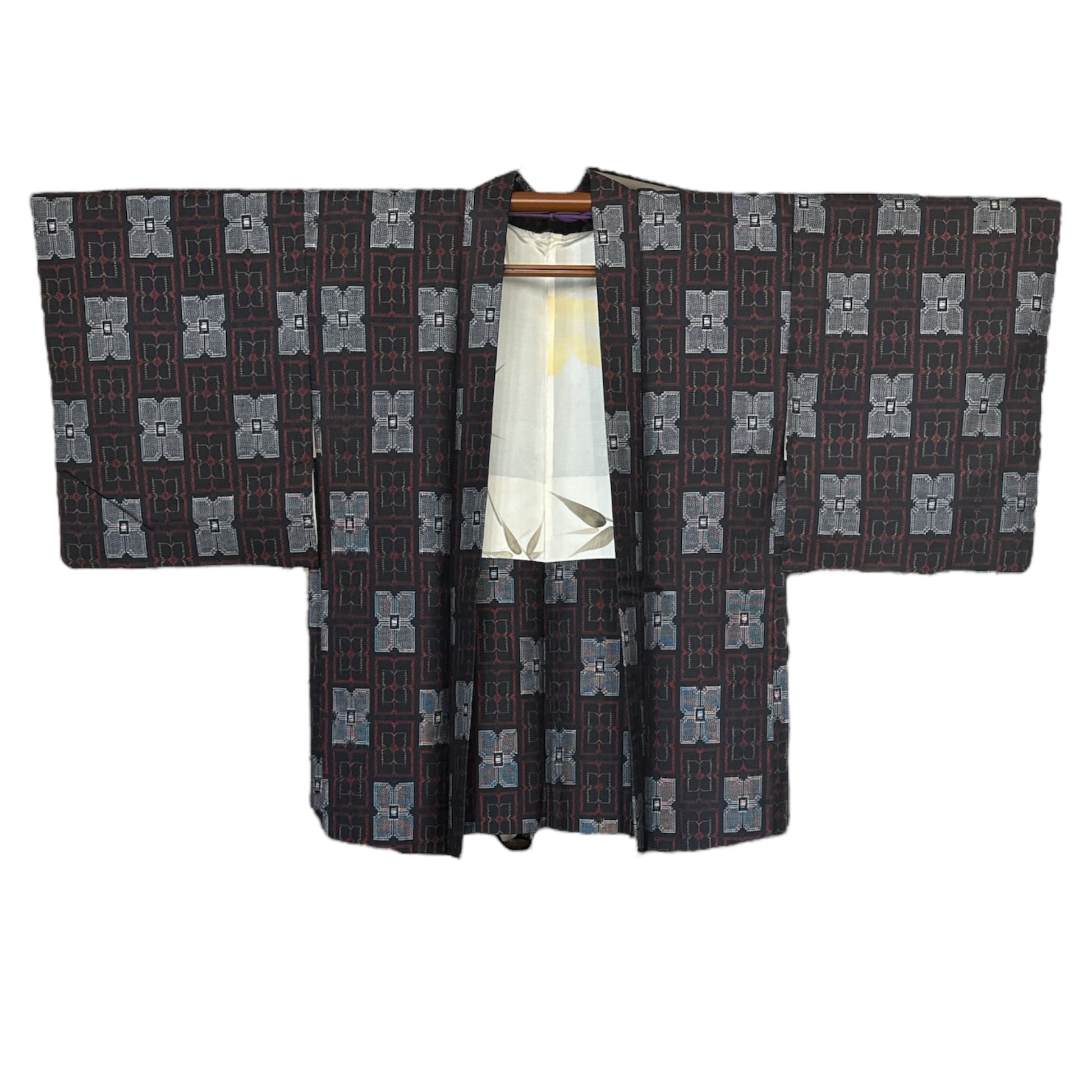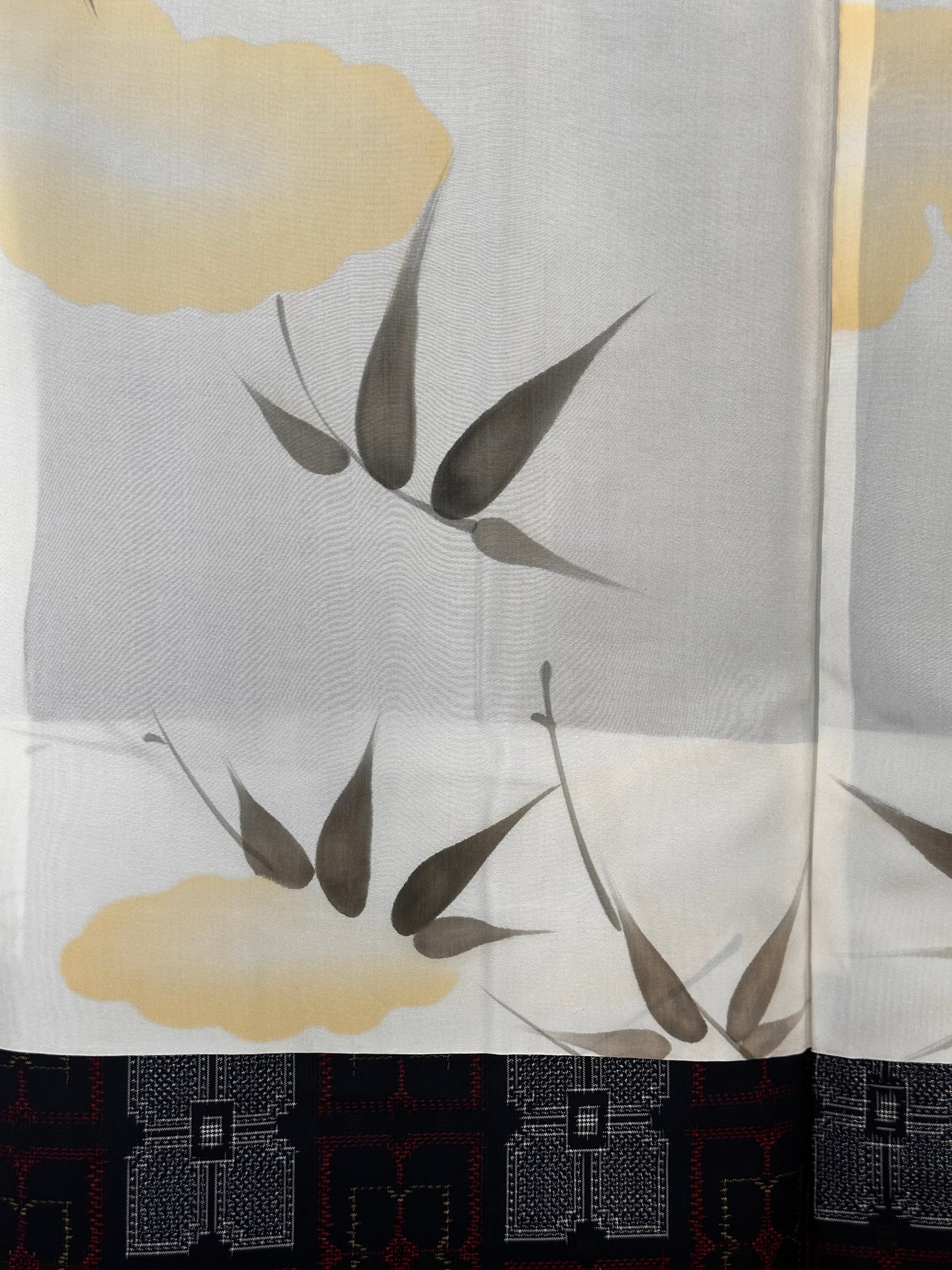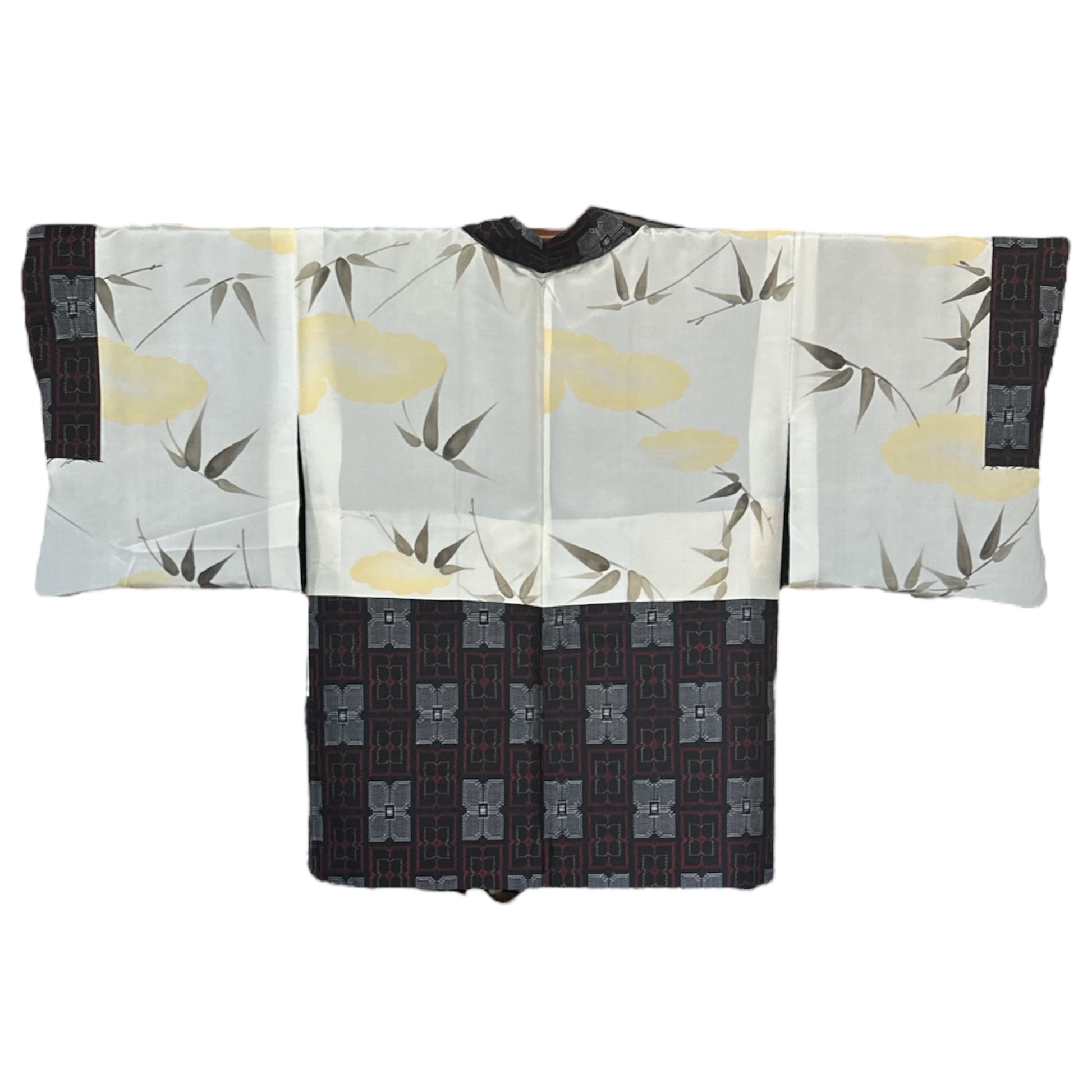 Stil: Cu designul său geometric îndrăzneț și detaliile artistice, acest haori este o piesă atemporală și versatilă , perfectă atât pentru setările formale, cât și pentru cele semi-formale . Indiferent dacă este stratificat peste un kimono sau combinat cu ținute contemporane, oferă o eleganță sofisticată, dar subestimată. Contrastul dintre modelul exterior structurat și motivele fluide, organice din bambus și nori din interior, fac din acest haori o adevărată operă de artă.
