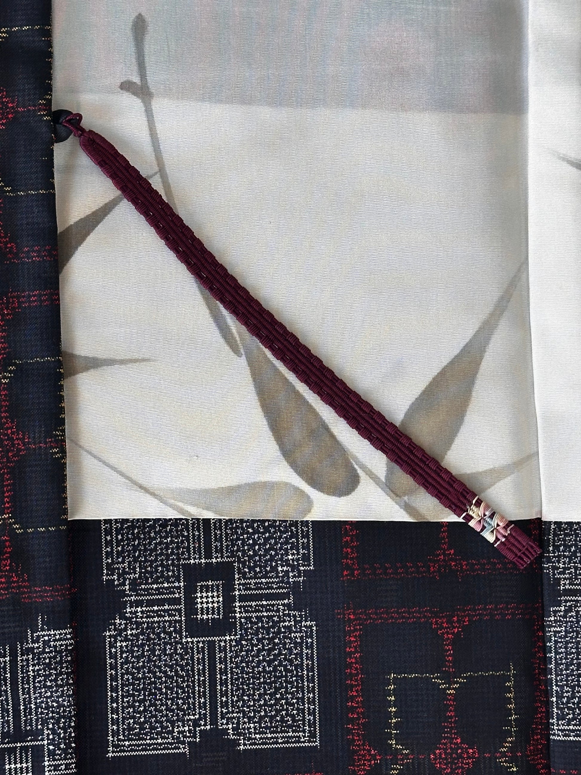 Design: Acest haori sofisticat pentru femei are un cadru geometric complicat care acoperă întreaga țesătură. În cadrul fiecărui pătrat structurat, este plasat elegant un motiv floral stilizat - nu flori realiste, ci o interpretare abstractă, geometrică a formelor naturale. Modelul structurat contrastează frumos cu căptușeala interioară fluidă , pictată manual , care prezintă frunze de bambus și forme stilizate de nori în tonuri calde . Haori este complet cu haori himo , asigurând un aspect rafinat și tradițional.