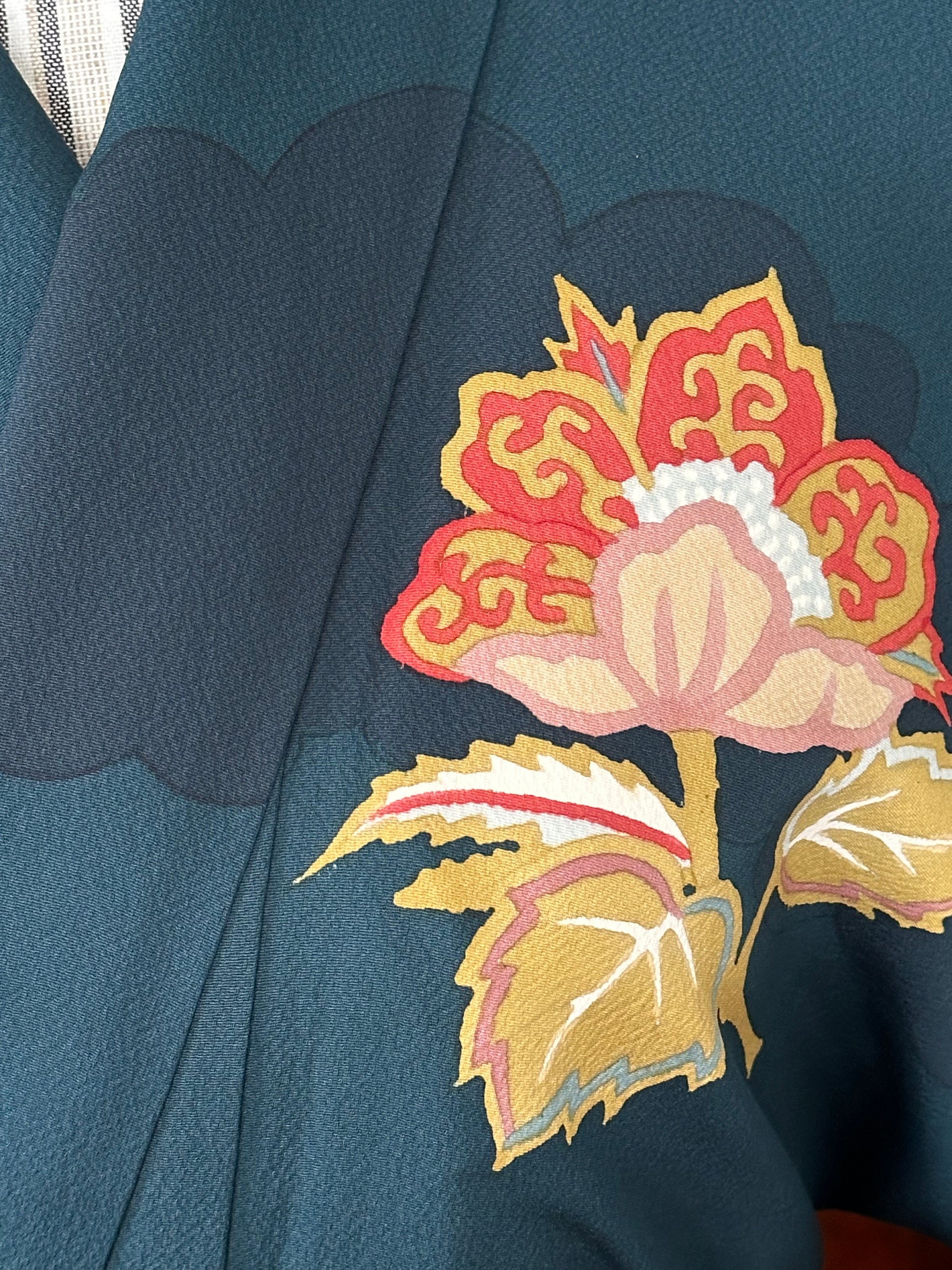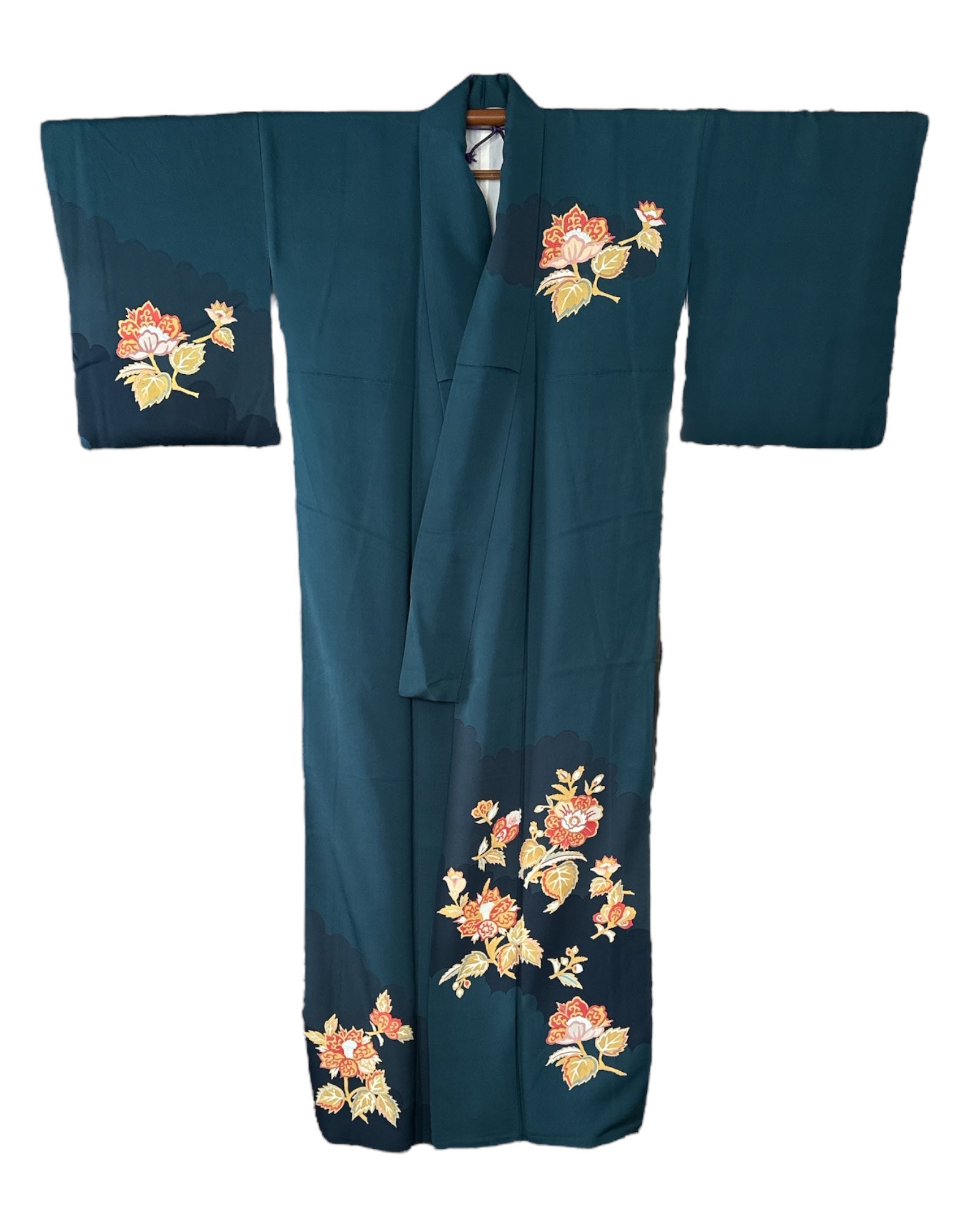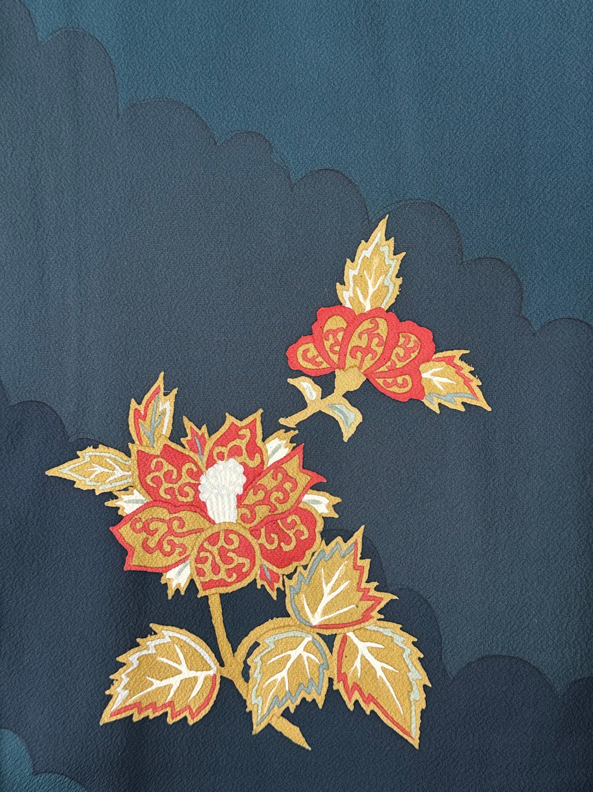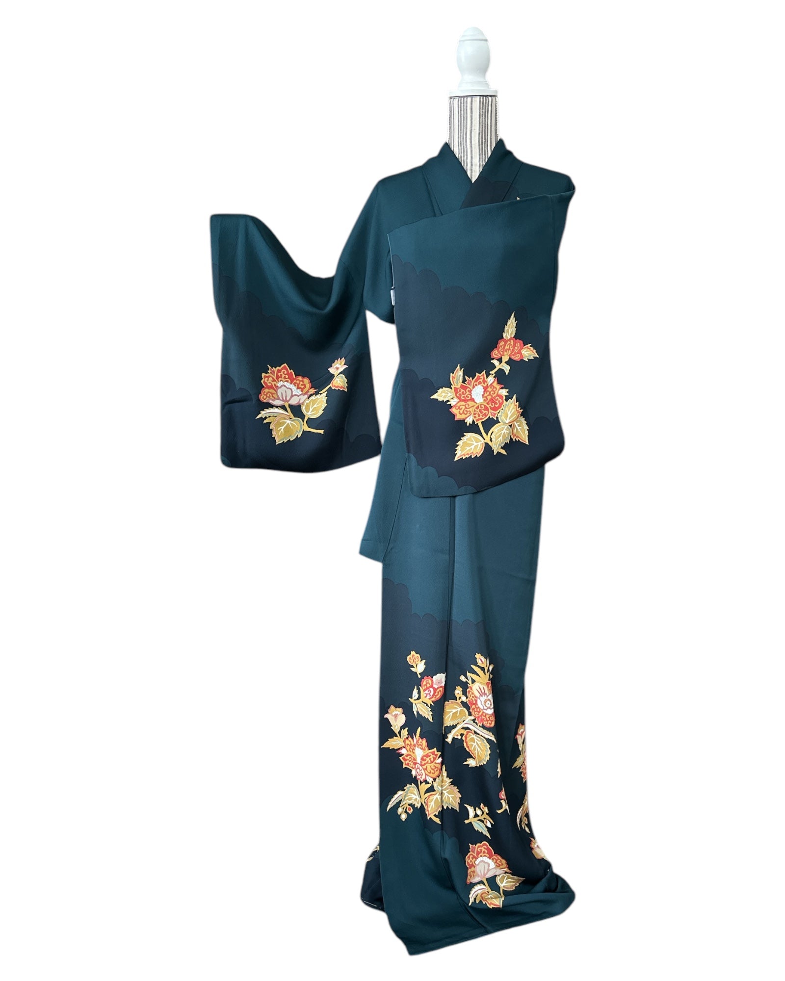 Description: This tsukesage kimono from the Showa or early Heisei period features an eye-catching design of large, vibrant flowers, Yuzen-dyed in rich hues that stand out against a deep teal/blue-green background. Cloud motifs gently weave through the design, adding a sense of movement and elegance. The combination of bold florals and delicate clouds creates a harmonious balance, making this kimono a beautiful choice for formal events. A family crest is subtly placed on the garment, further adding to its personal and traditional significance.