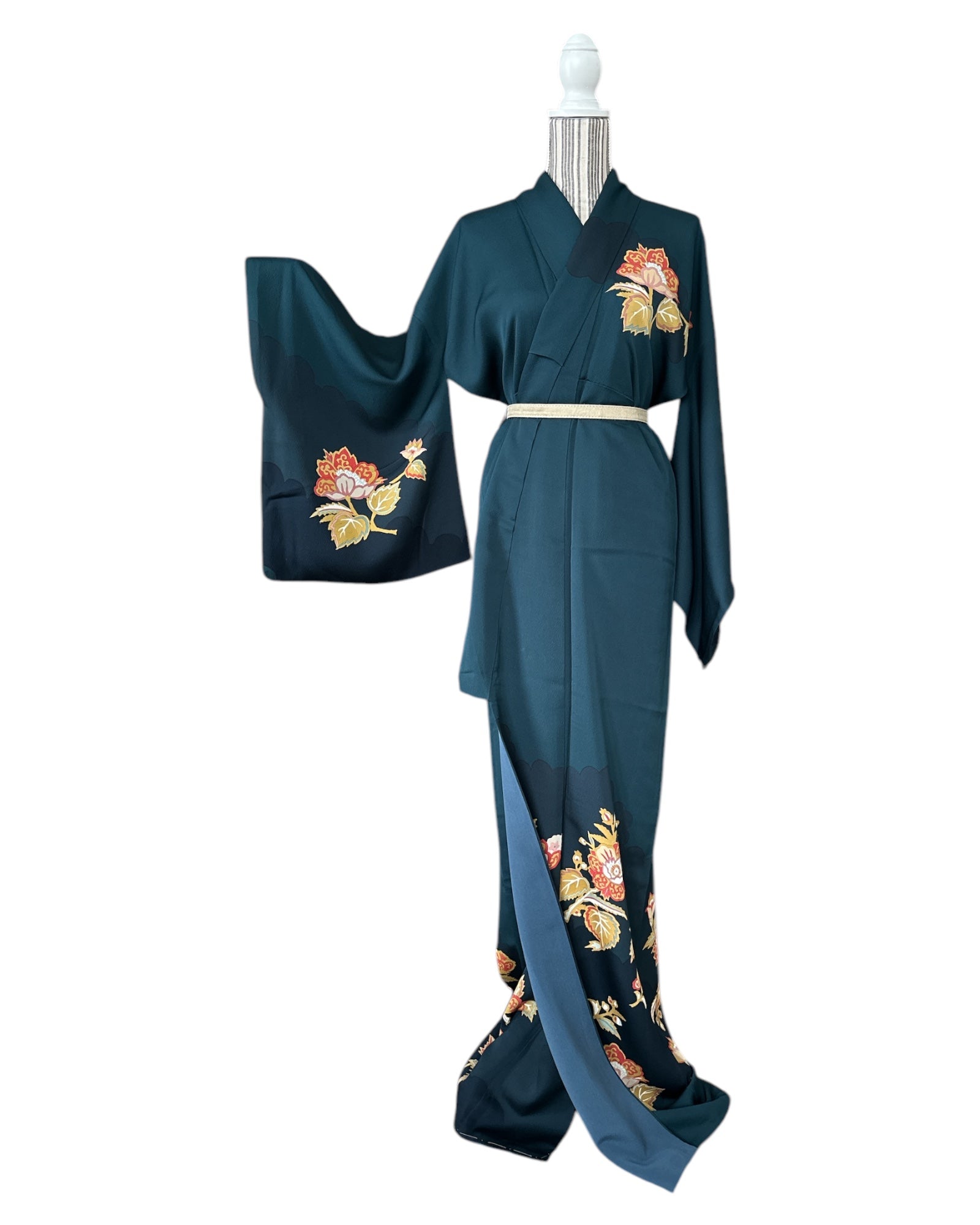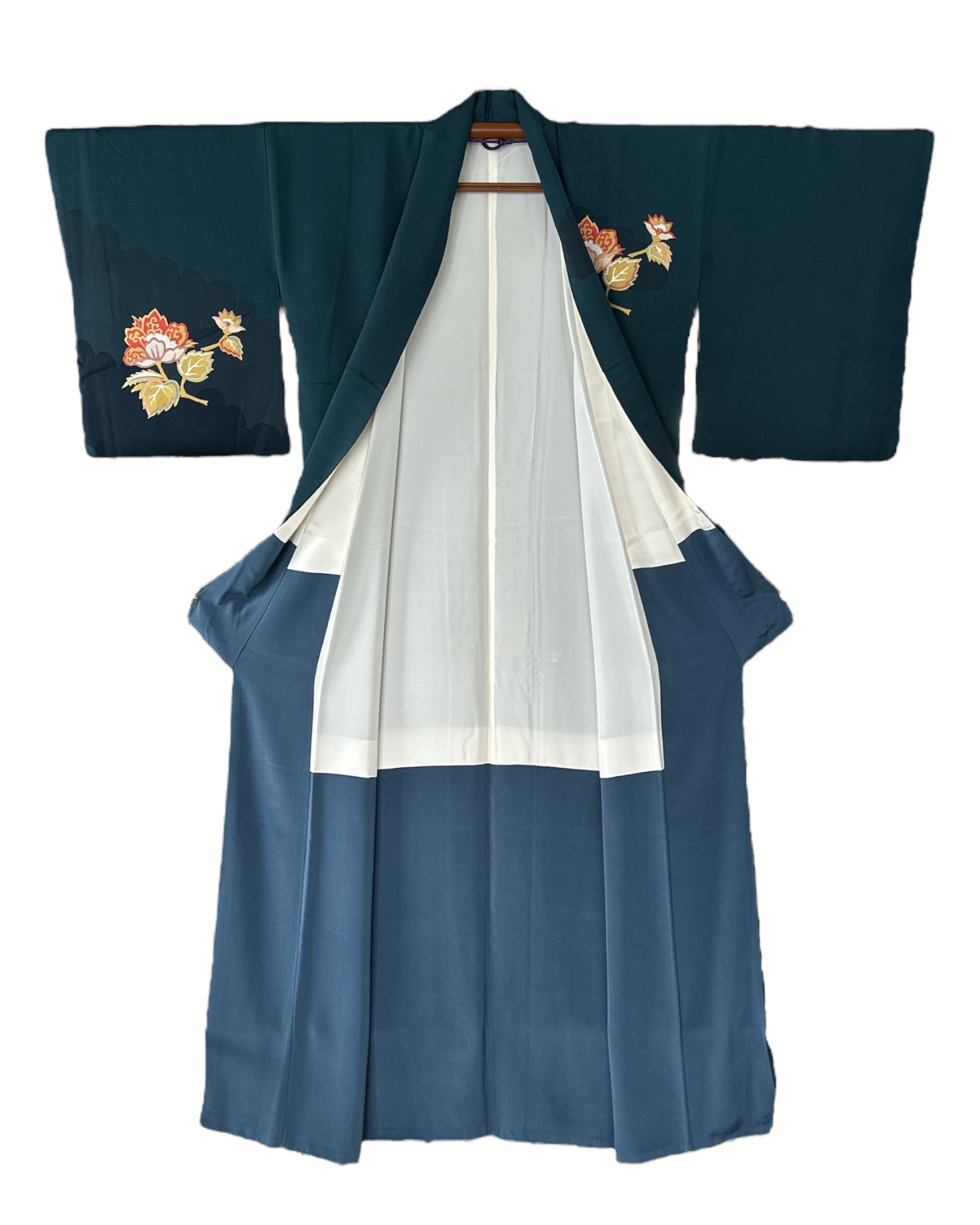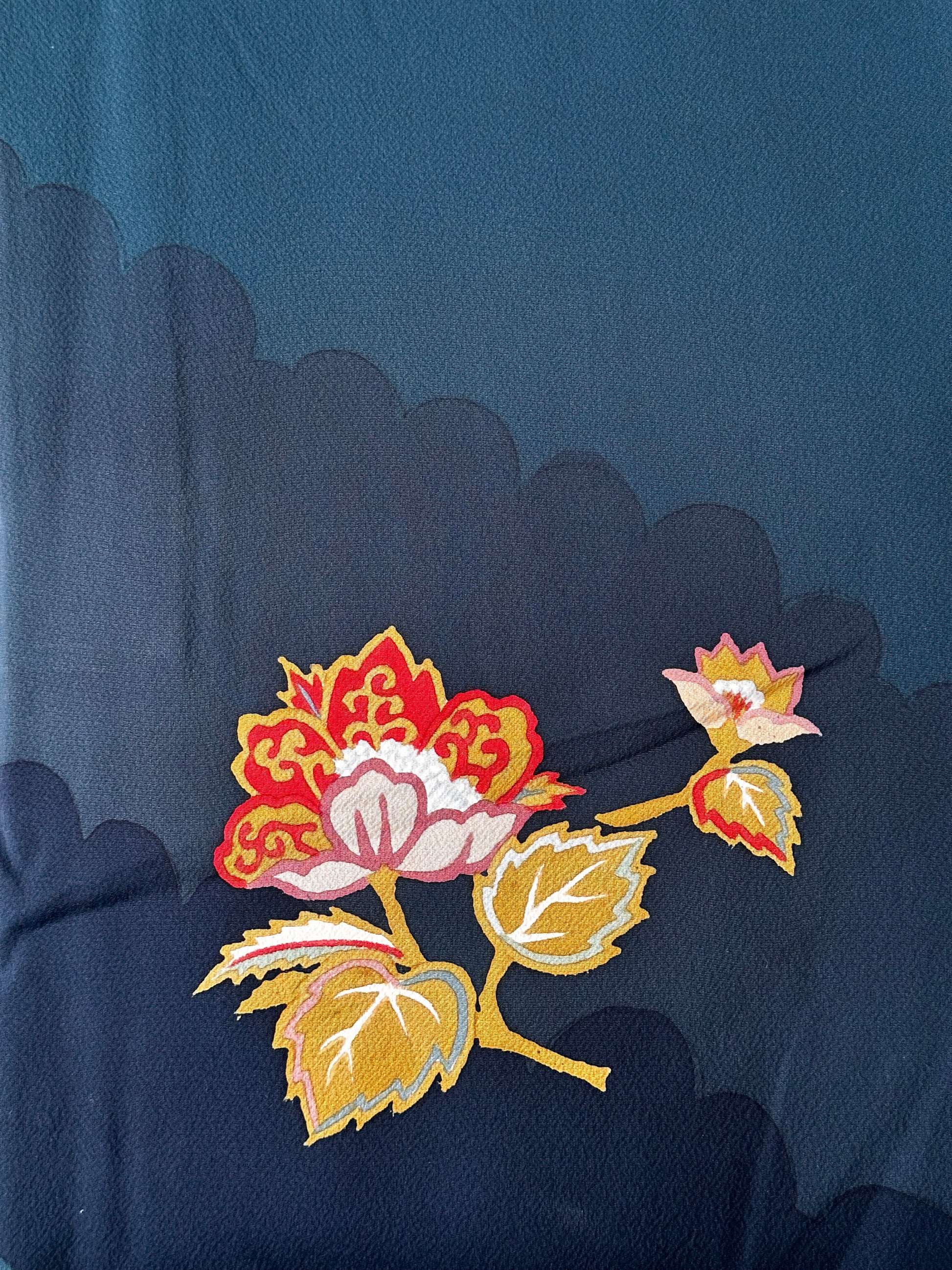 Description: This tsukesage kimono from the Showa or early Heisei period features an eye-catching design of large, vibrant flowers, Yuzen-dyed in rich hues that stand out against a deep teal/blue-green background. Cloud motifs gently weave through the design, adding a sense of movement and elegance. The combination of bold florals and delicate clouds creates a harmonious balance, making this kimono a beautiful choice for formal events. A family crest is subtly placed on the garment, further adding to its personal and traditional significance.