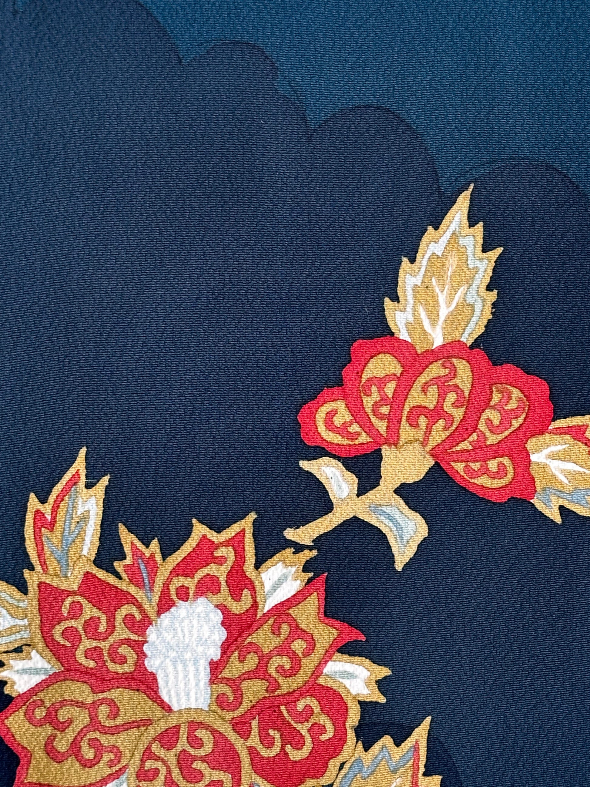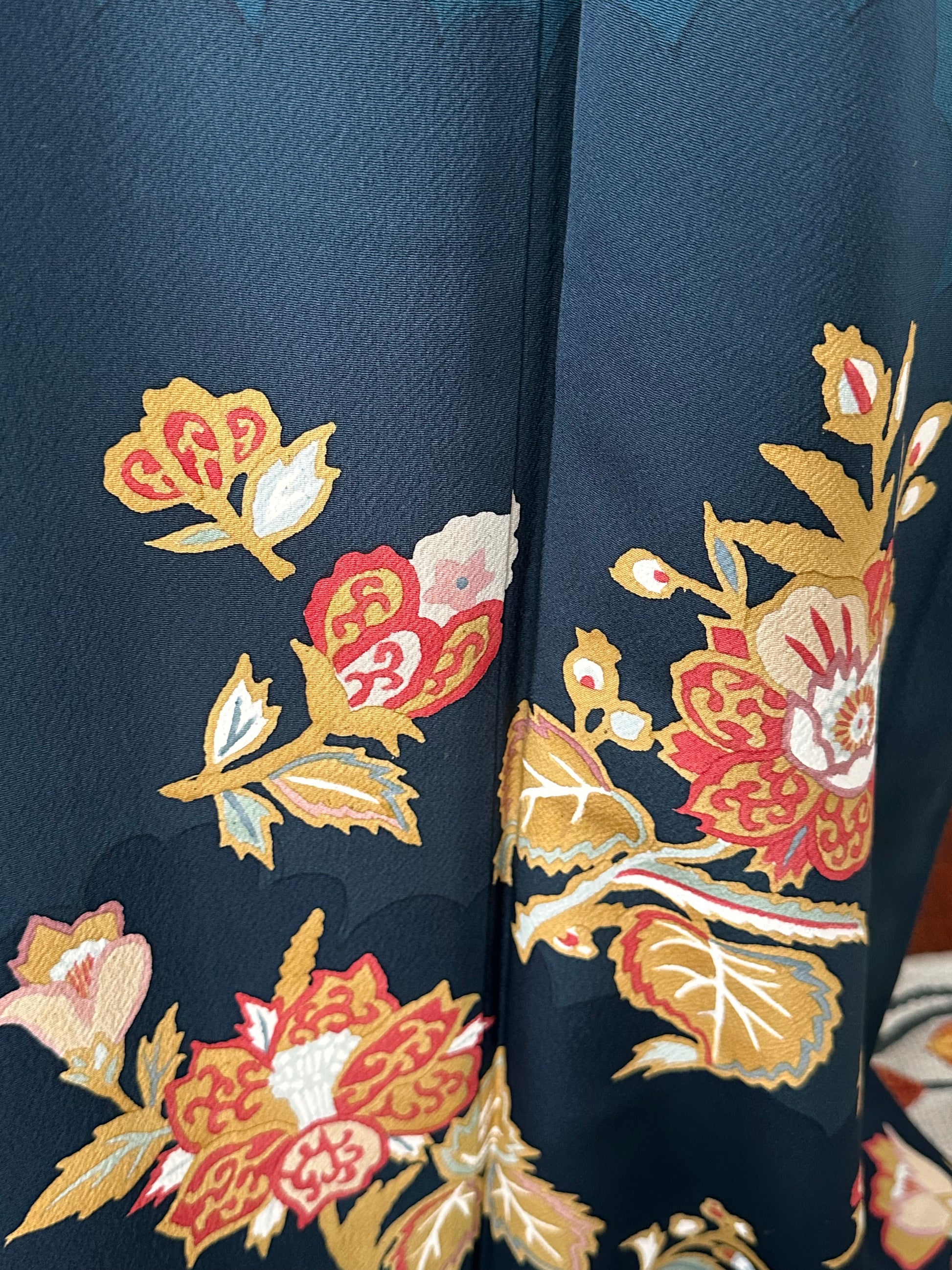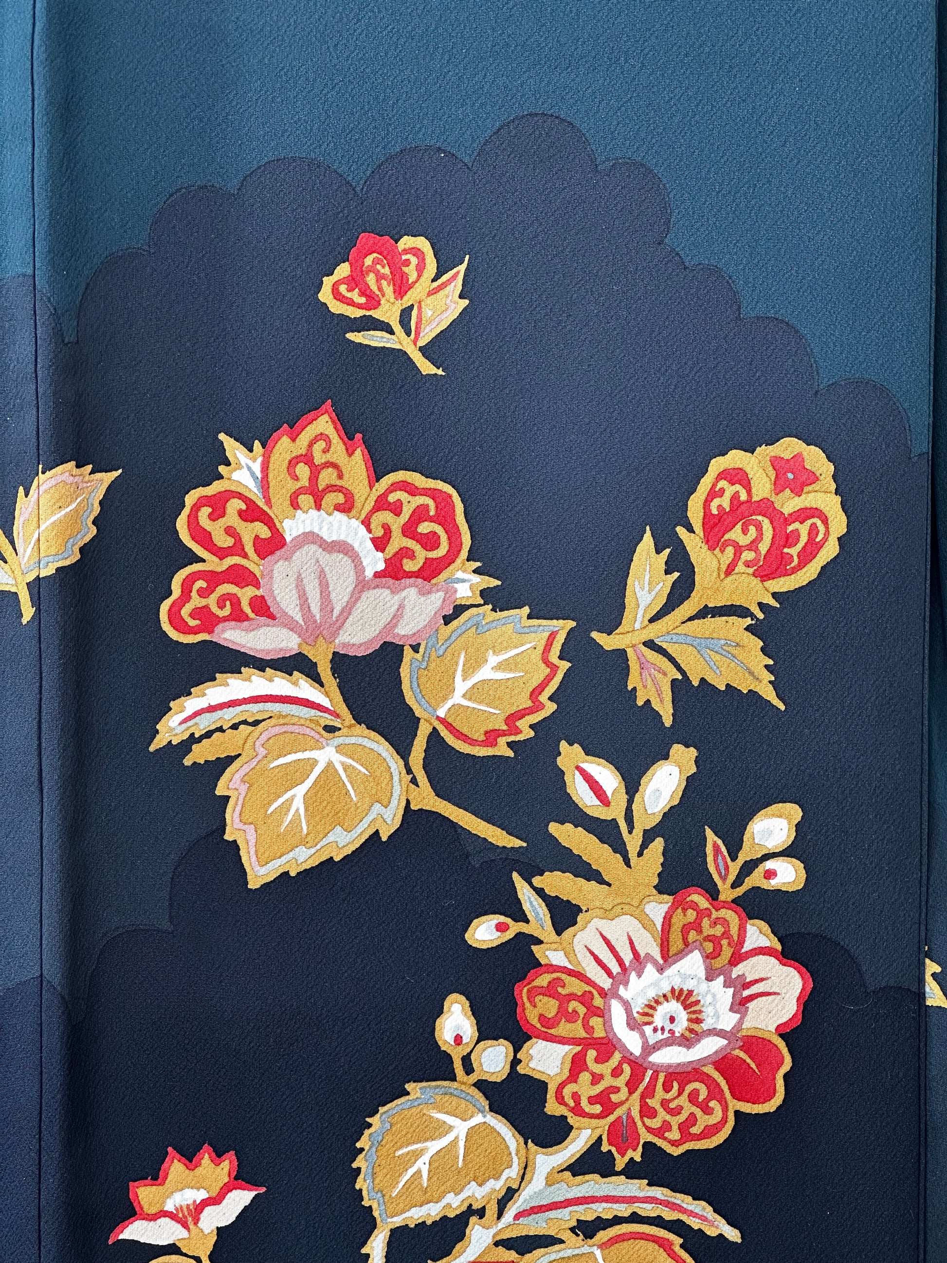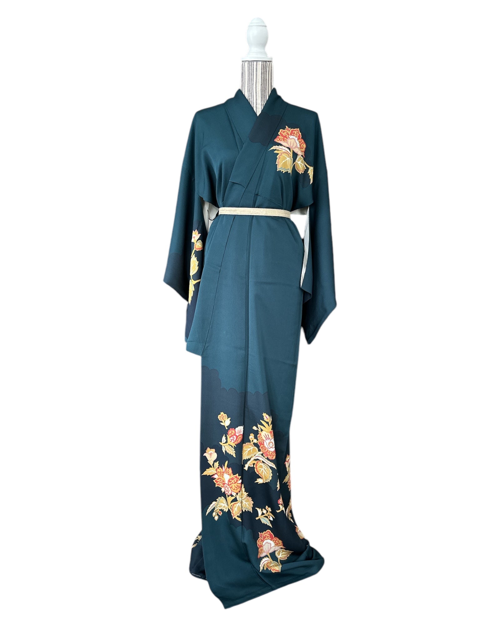 Description: This tsukesage kimono from the Showa or early Heisei period features an eye-catching design of large, vibrant flowers, Yuzen-dyed in rich hues that stand out against a deep teal/blue-green background. Cloud motifs gently weave through the design, adding a sense of movement and elegance. The combination of bold florals and delicate clouds creates a harmonious balance, making this kimono a beautiful choice for formal events. A family crest is subtly placed on the garment, further adding to its personal and traditional significance.