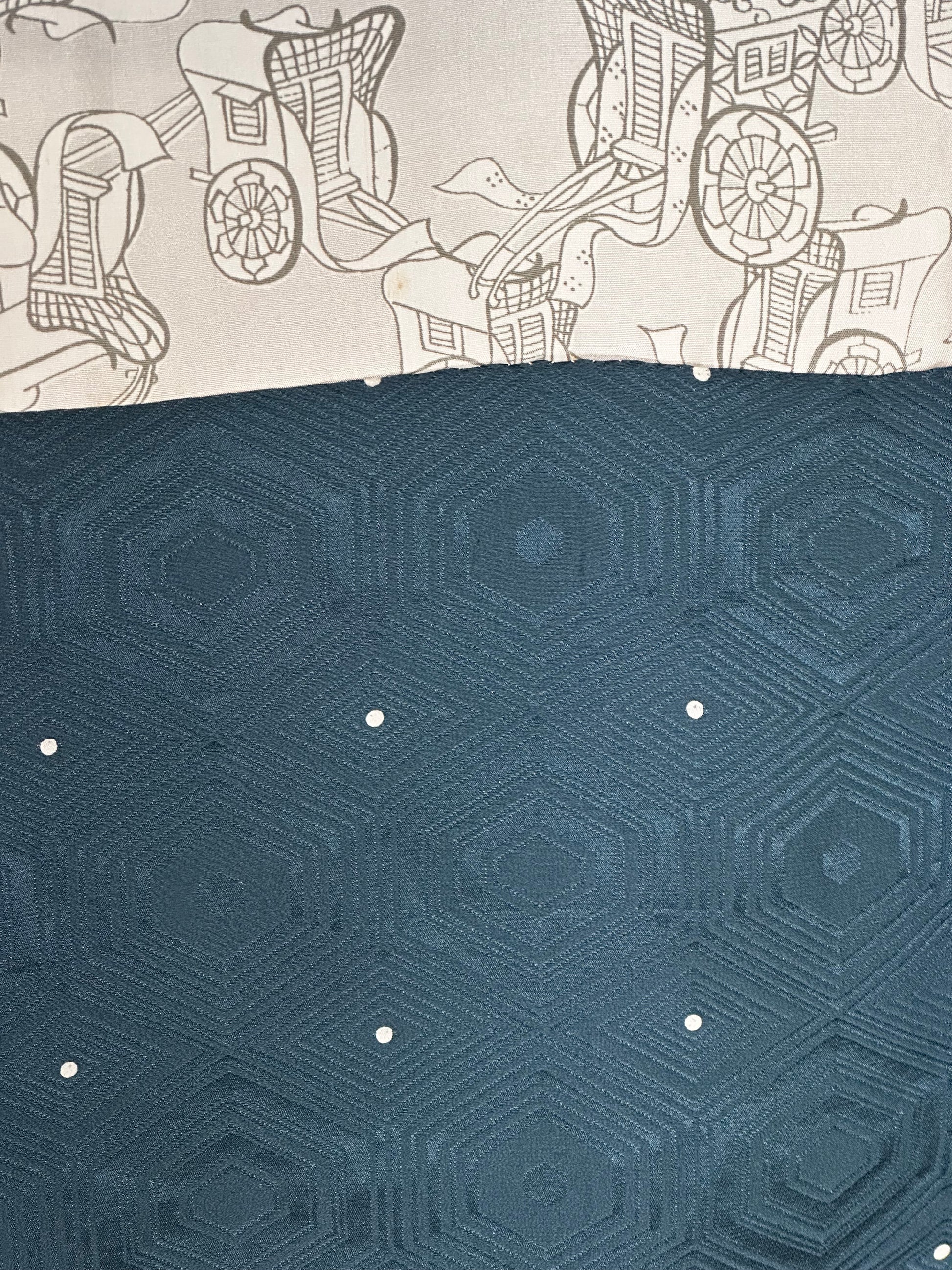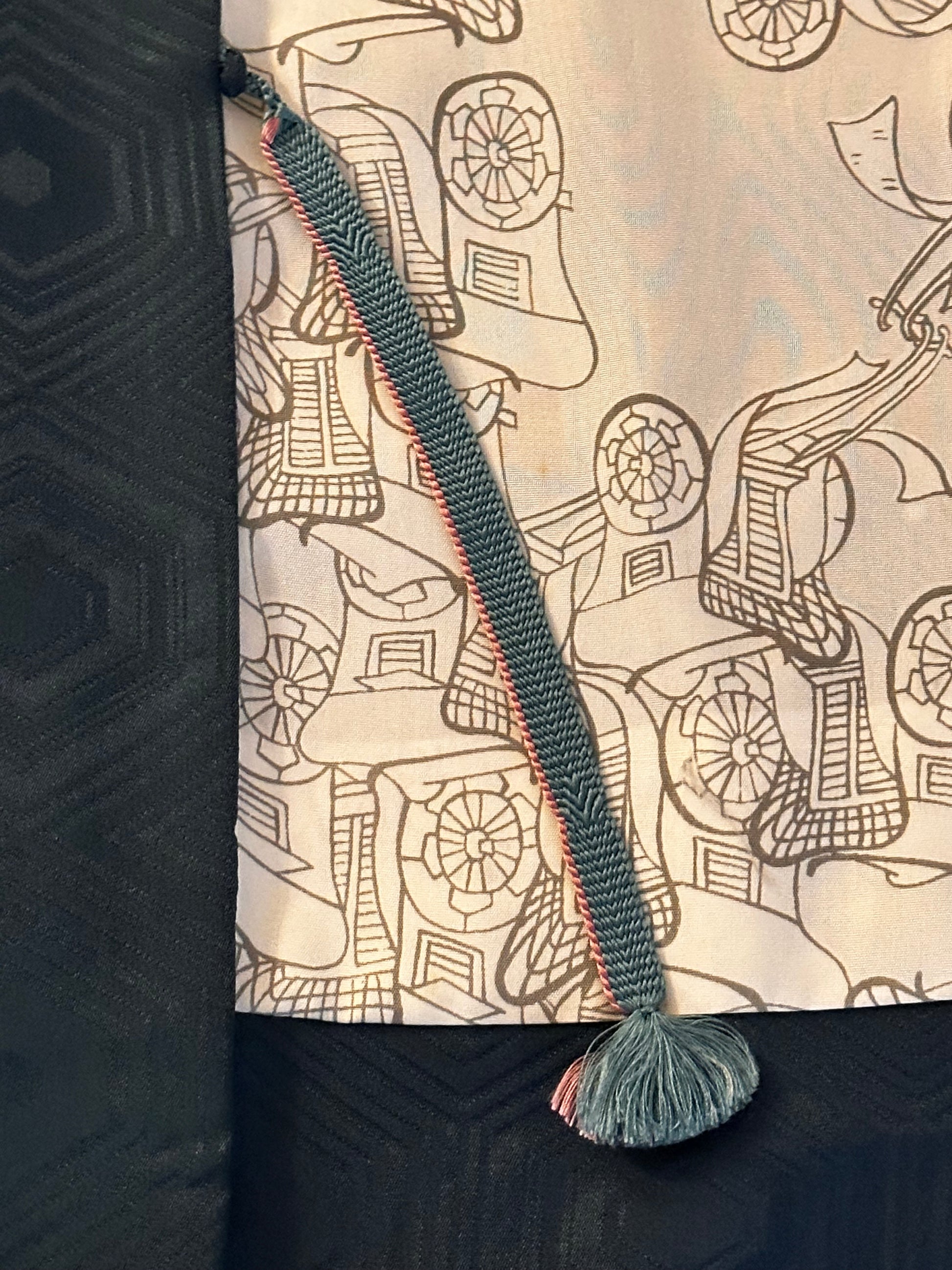 Material: exterior din mătase Rinzu cu model kikkō (亀甲) și accente cu puncte albe; căptușeală din mătase cu motiv japonez kuruma (trăsură).