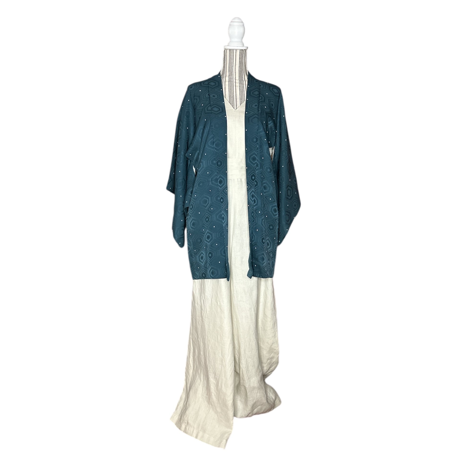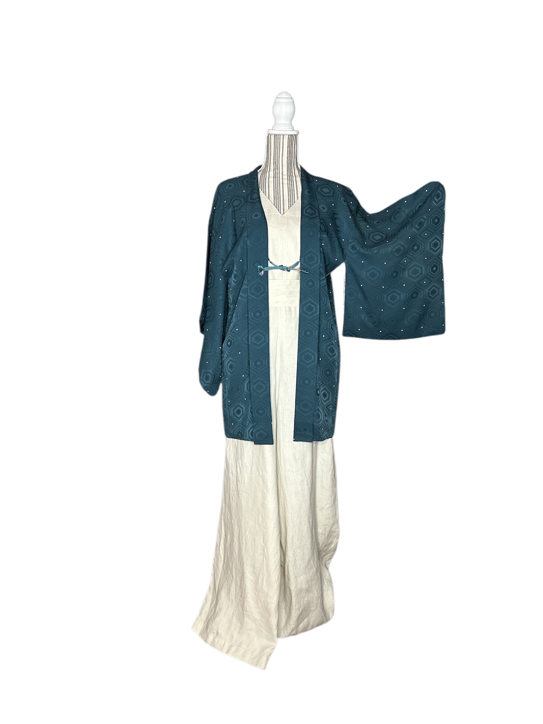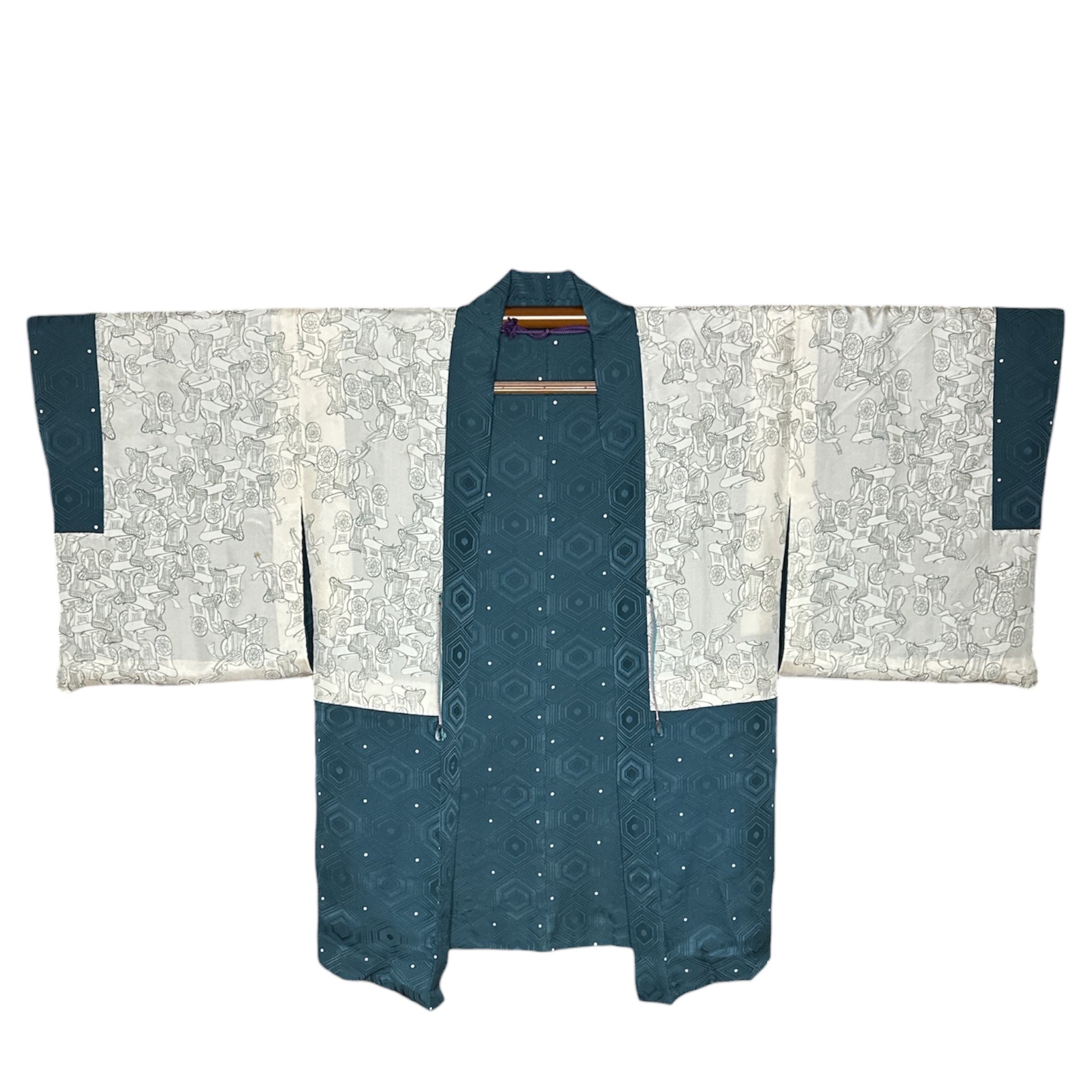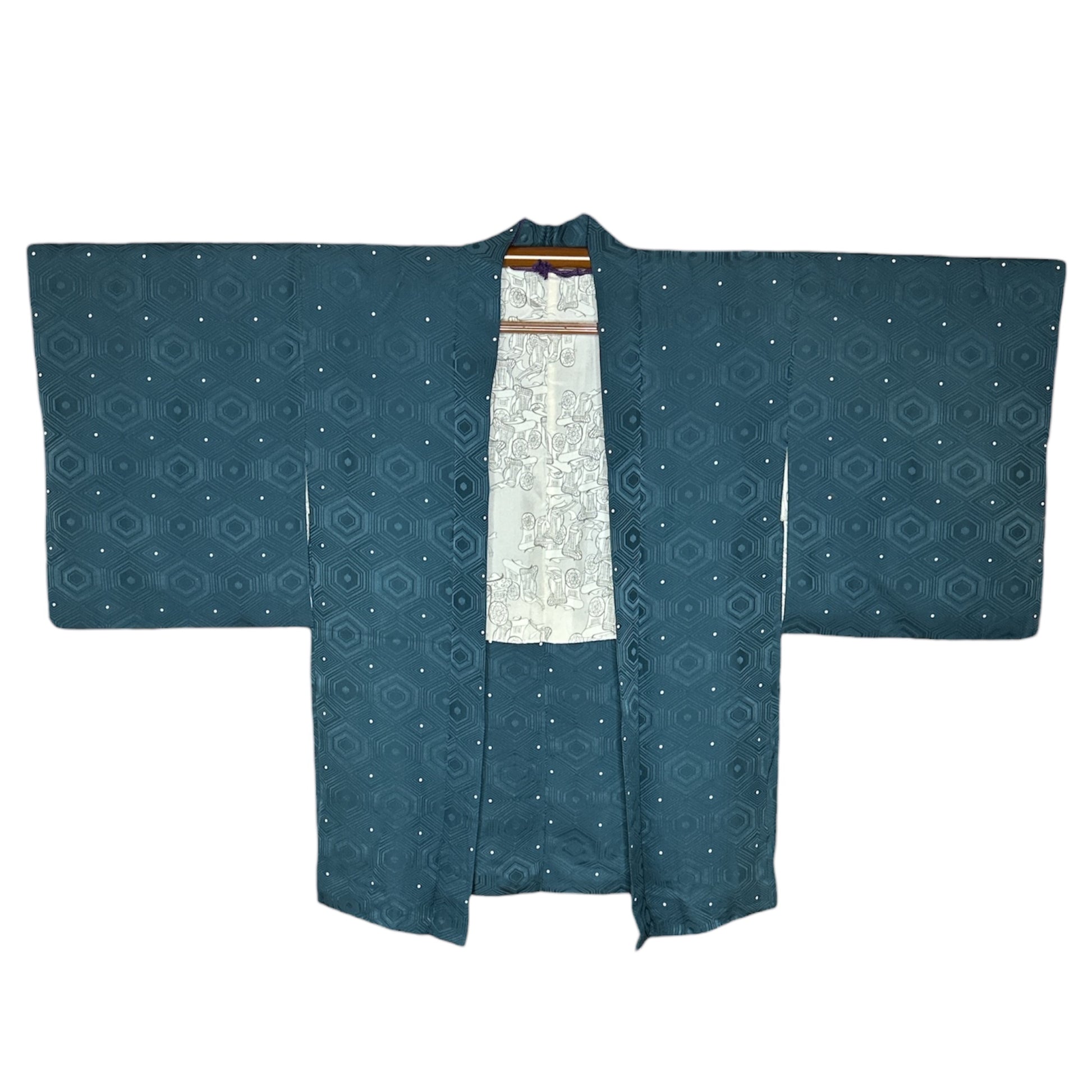 Descriere: Acest haori vintage pentru femei este confecționat din mătase rinzu într-o culoare rafinată, în nuanțe de petrol. Exteriorul prezintă un model kikkō (亀甲) - un motiv hexagonal tradițional inspirat de carapacea broaștei țestoase - intercalat cu puncte albe delicate care adaugă ritm vizual și lejeritate designului. În cultura japoneză, modelul kikkō simbolizează longevitatea, protecția și norocul, deoarece broasca țestoasă este asociată cu o viață lungă și proastă.