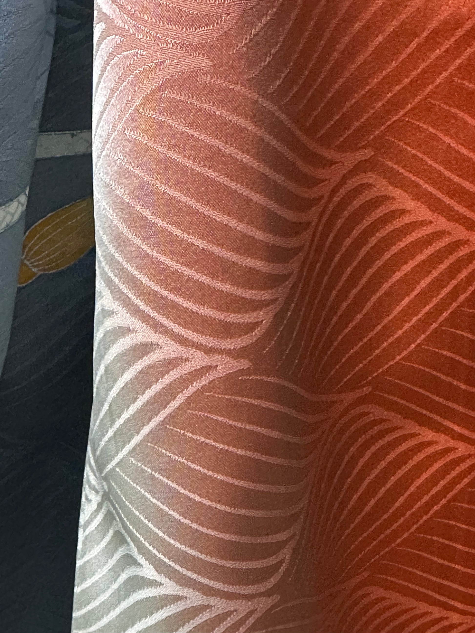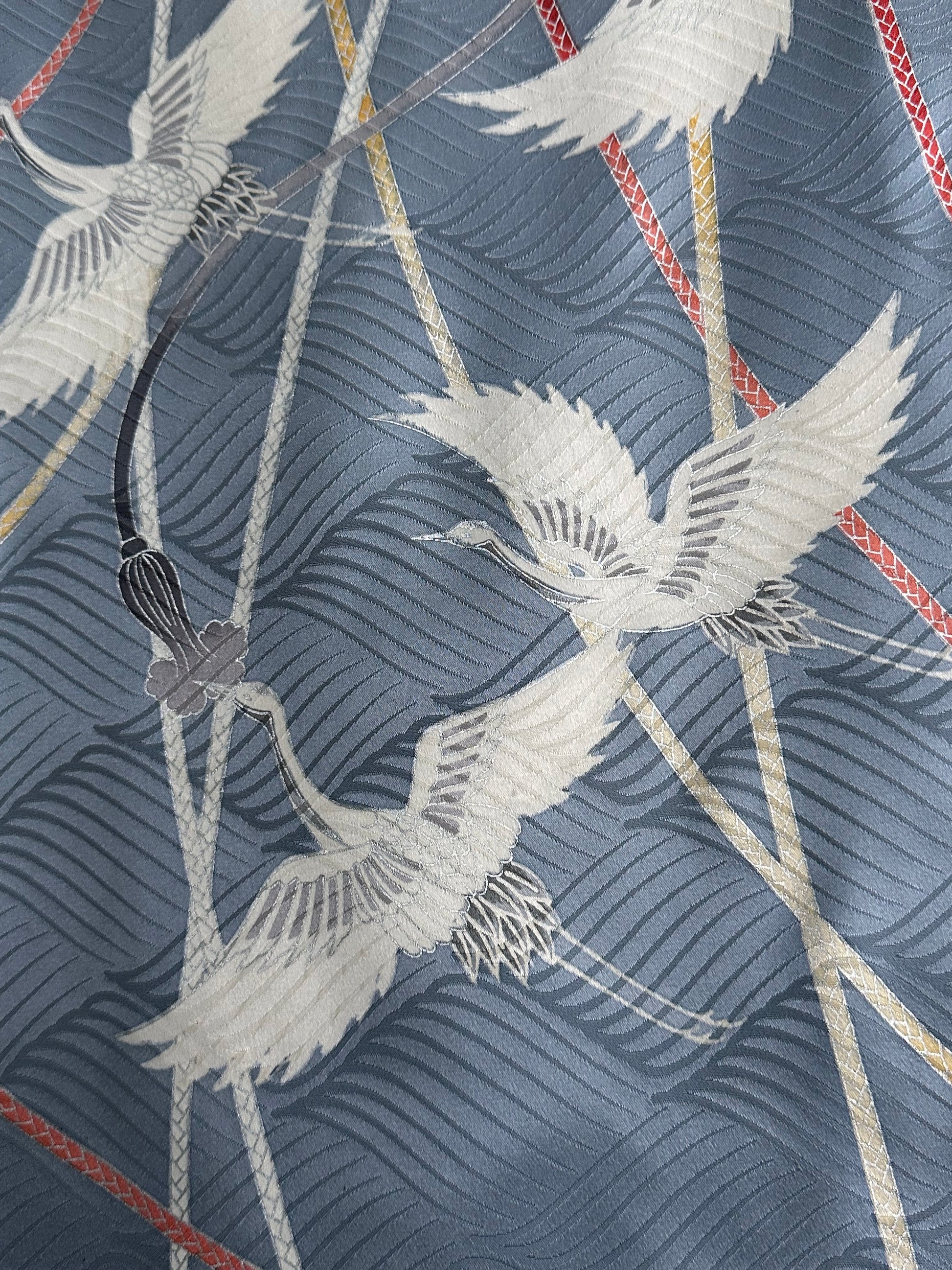 Material: Confecționat din mătase rinzu de înaltă calitate, materialul prezintă un model discret jacquard, cu un motiv sayagata ondulat, care oferă atât profunzime vizuală, cât și o strălucire delicată. Această textură rafinată completează perfect motivele pictate manual și vopsite prin tehnica Yuzen, în timp ce broderia minuțioasă adaugă un plus de eleganță și măiestrie artistică.