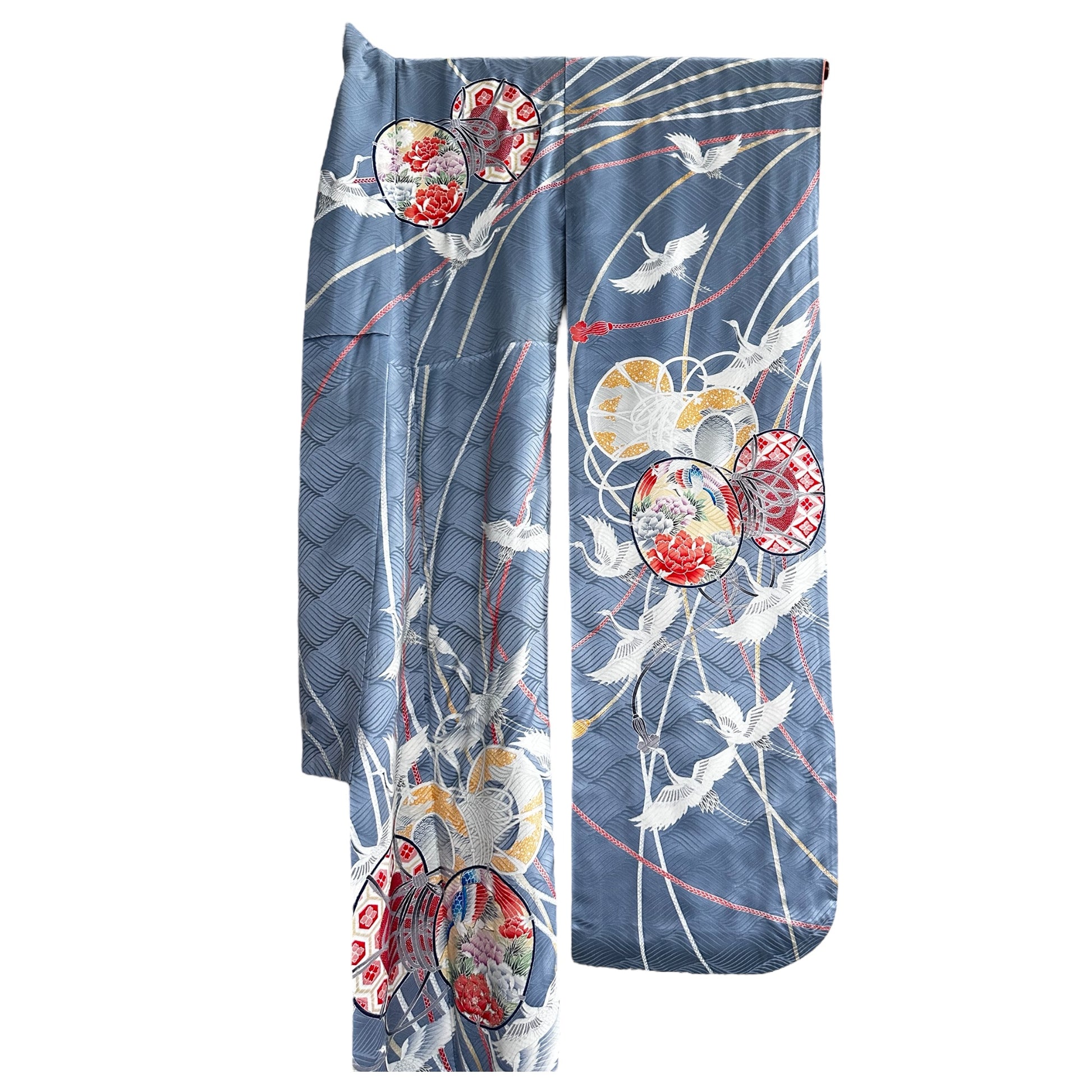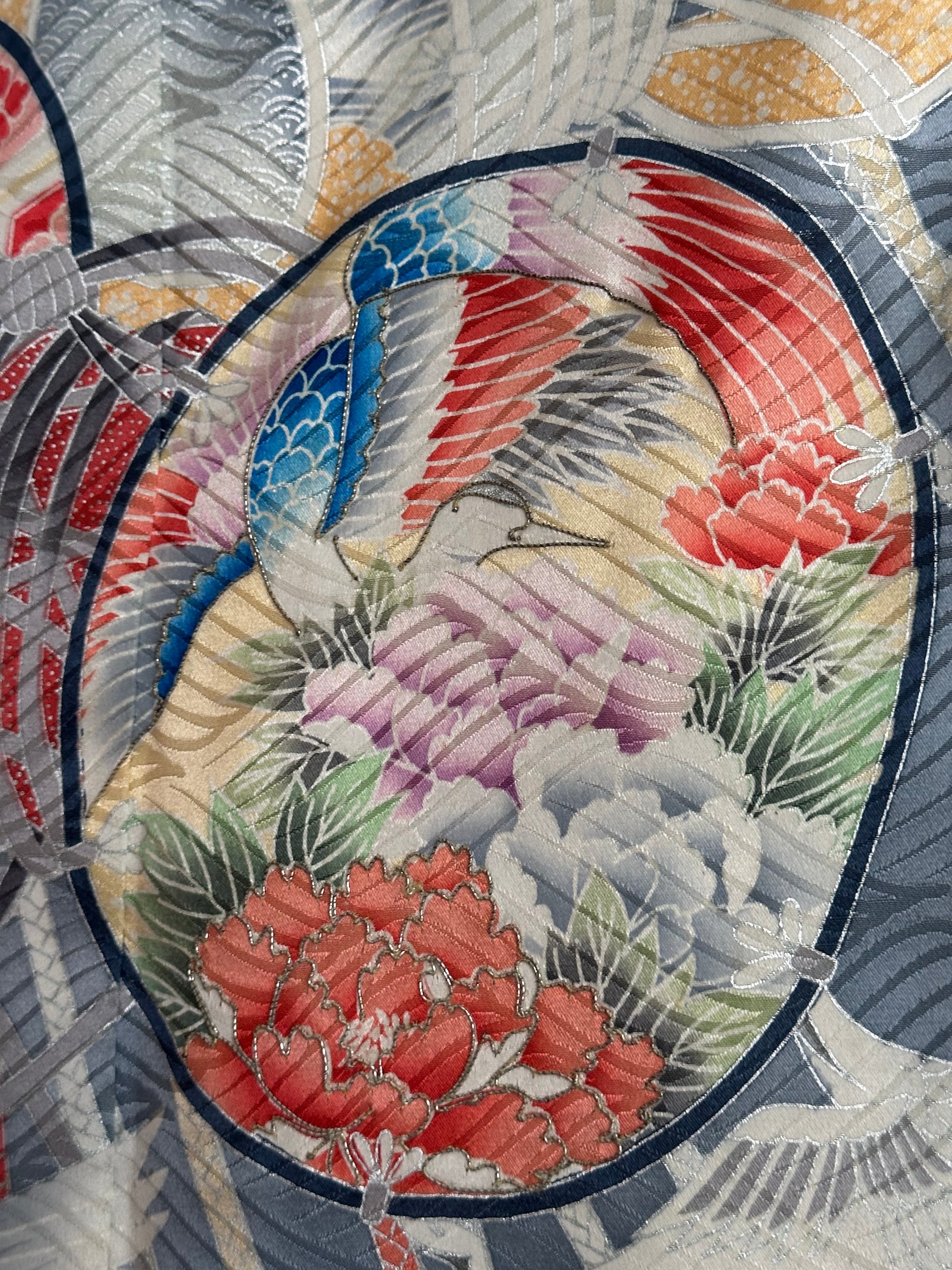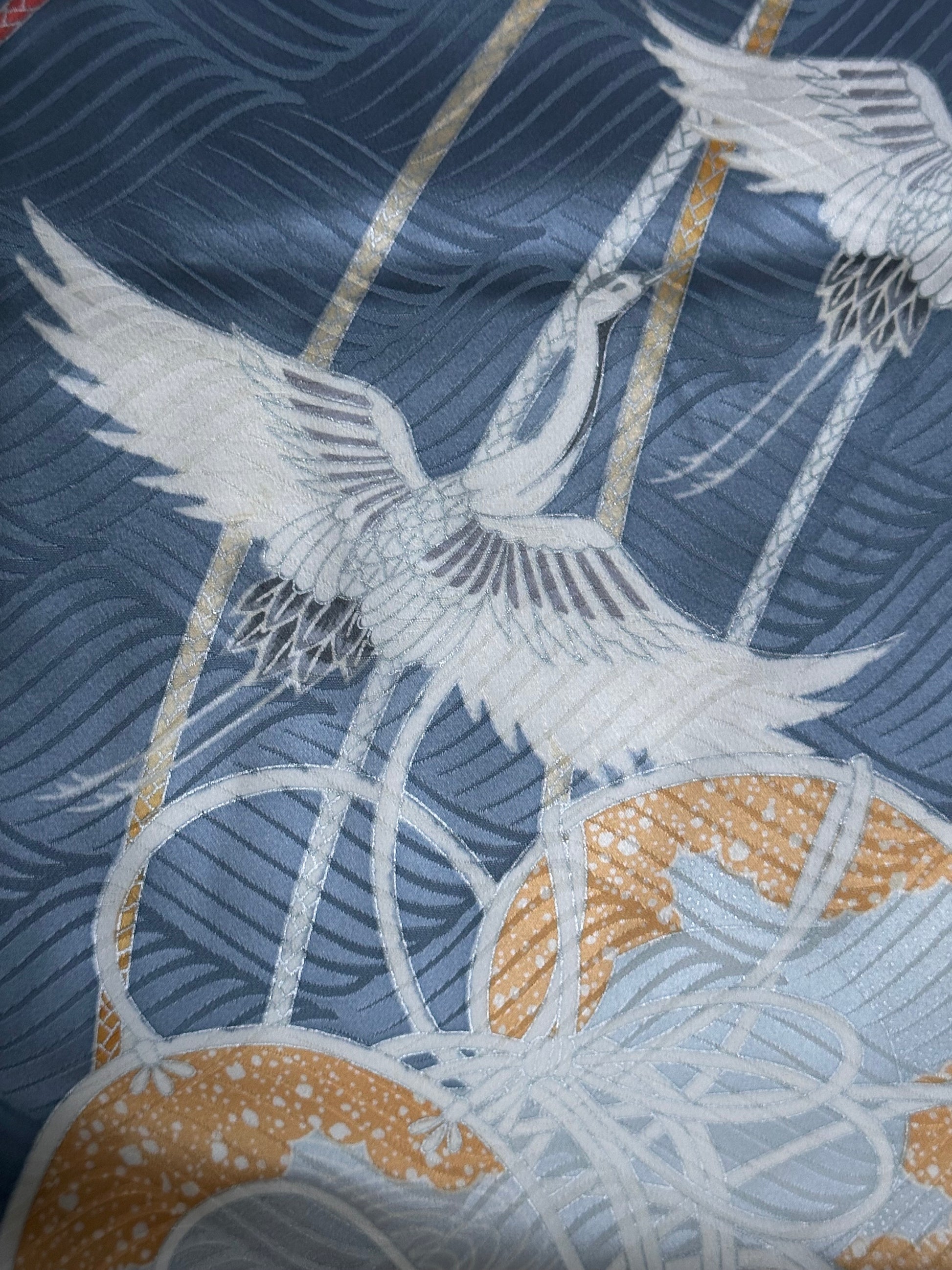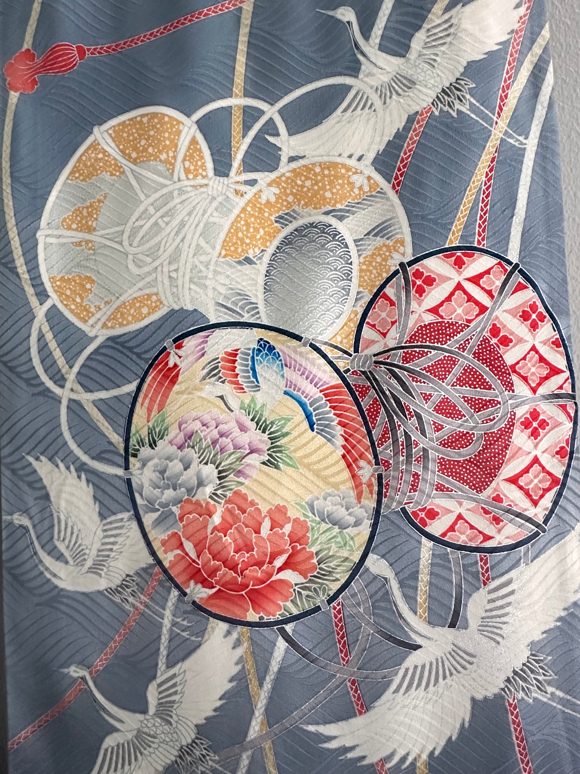 Descriere: Acest chimono furisode deosebit impresionează prin baza din mătase rinzu, într-o nuanță delicată de albastru-argintiu, subtil țesută cu un model sayagata ondulat, care creează o textură bogată și rafinată. Modelul este adus la viață prin motive realizate manual prin tehnica tradițională Yuzen, renumită pentru precizia și intensitatea culorilor. Kimono-ul este decorat cu cocori pictați manual (tsuru), tobe tradiționale japoneze (tsuzumi) legate cu șnururi fine, și bujori vibranți — cunoscuți drept „regele florilor”. Fiecare element poartă o simbolistică aparte: cocorii exprimă urări de noroc și longevitate, tsuzumi-urile sugerează bucuria sărbătorilor, iar bujorii, simbol al bogăției și frumuseții, adaugă o notă regală compoziției. Detaliile fine de broderie accentuează și mai mult ansamblul, oferind profunzime, textură și o eleganță luxoasă întregului chimono.