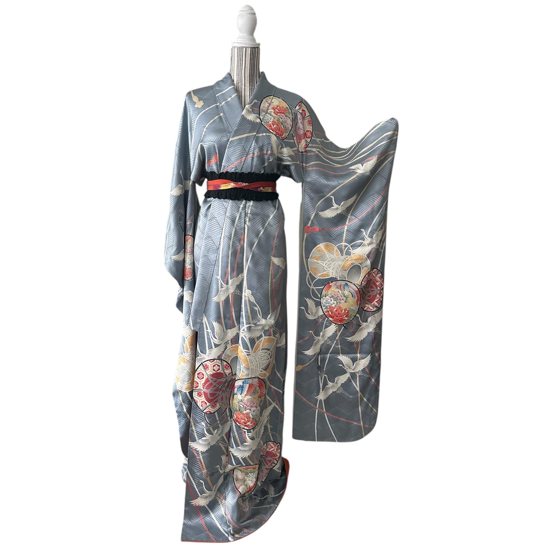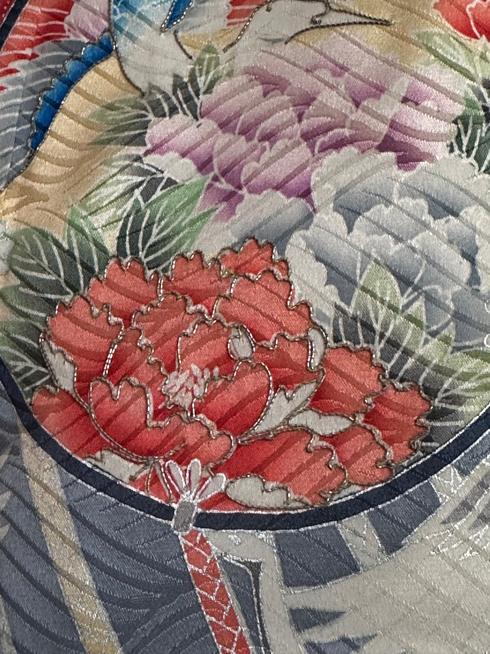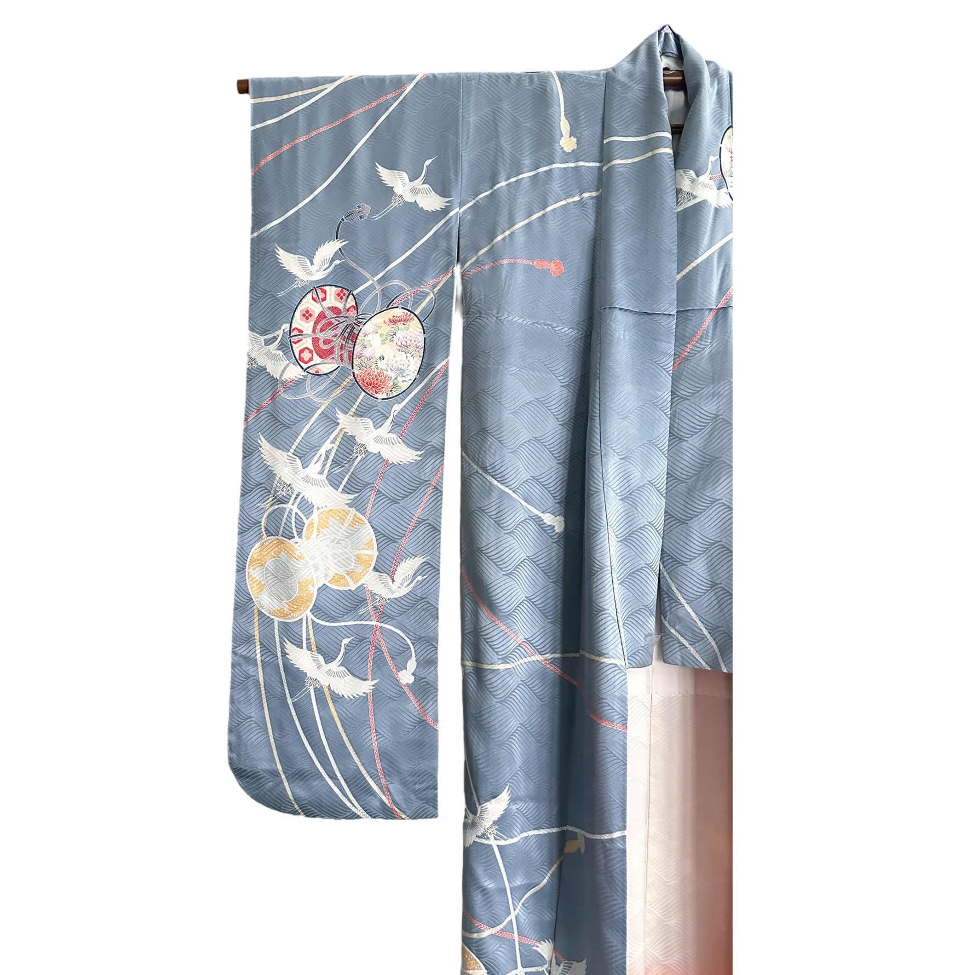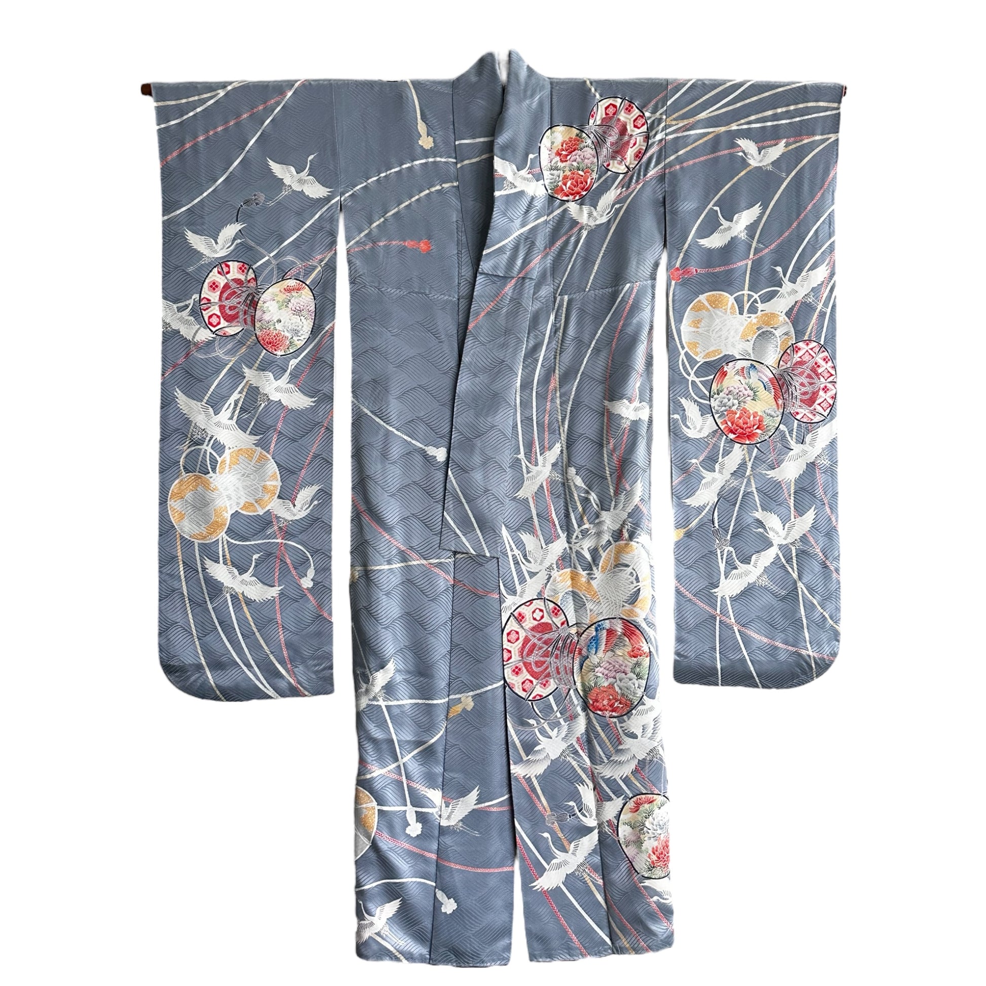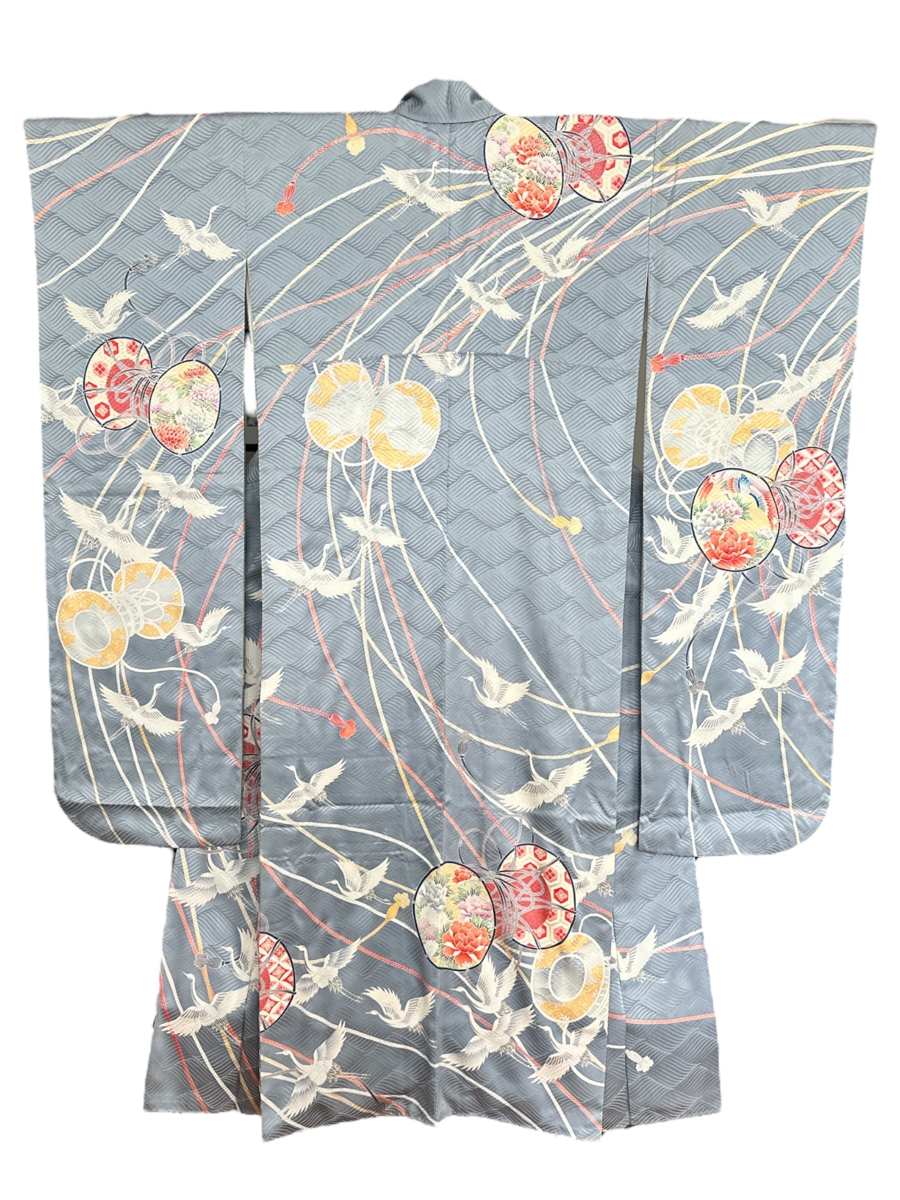 Descriere: Acest chimono furisode deosebit impresionează prin baza din mătase rinzu, într-o nuanță delicată de albastru-argintiu, subtil țesută cu un model sayagata ondulat, care creează o textură bogată și rafinată. Modelul este adus la viață prin motive realizate manual prin tehnica tradițională Yuzen, renumită pentru precizia și intensitatea culorilor. Kimono-ul este decorat cu cocori pictați manual (tsuru), tobe tradiționale japoneze (tsuzumi) legate cu șnururi fine, și bujori vibranți — cunoscuți drept „regele florilor”. Fiecare element poartă o simbolistică aparte: cocorii exprimă urări de noroc și longevitate, tsuzumi-urile sugerează bucuria sărbătorilor, iar bujorii, simbol al bogăției și frumuseții, adaugă o notă regală compoziției. Detaliile fine de broderie accentuează și mai mult ansamblul, oferind profunzime, textură și o eleganță luxoasă întregului chimono.