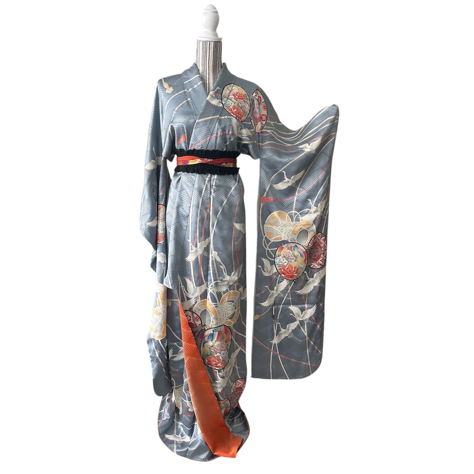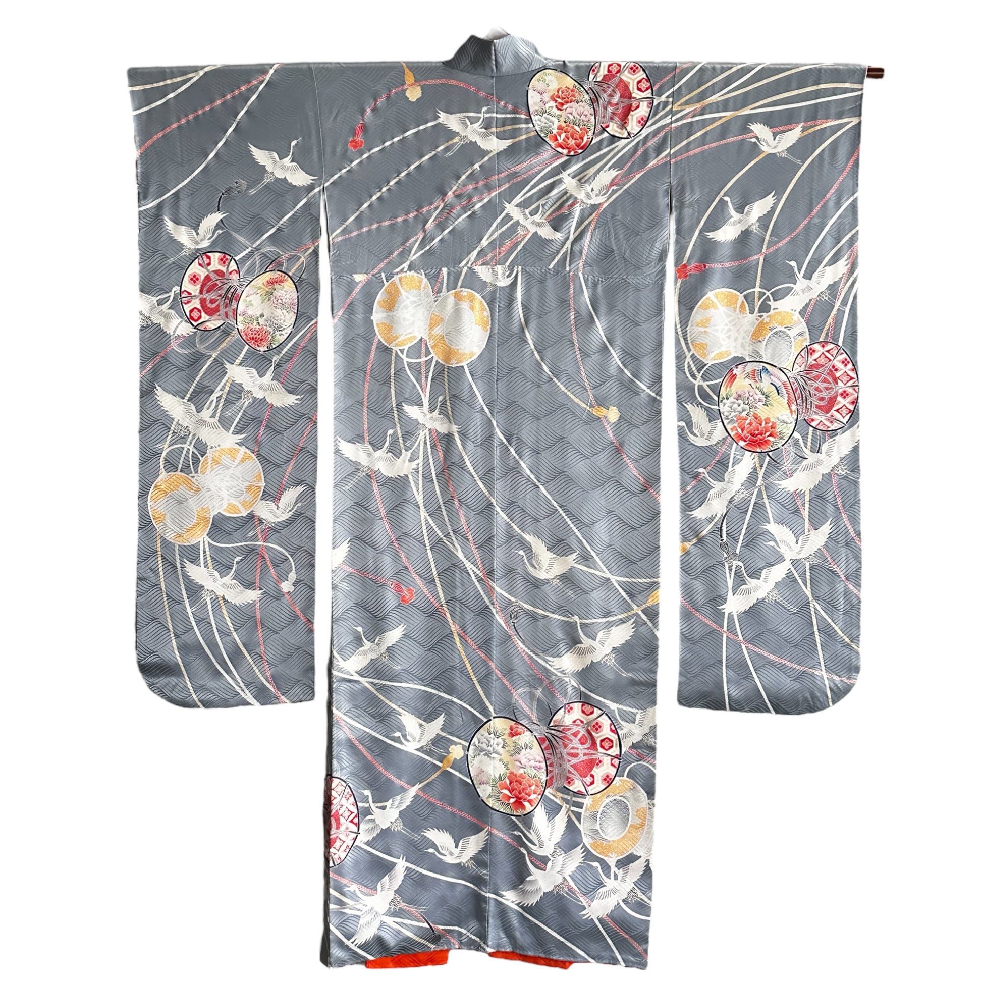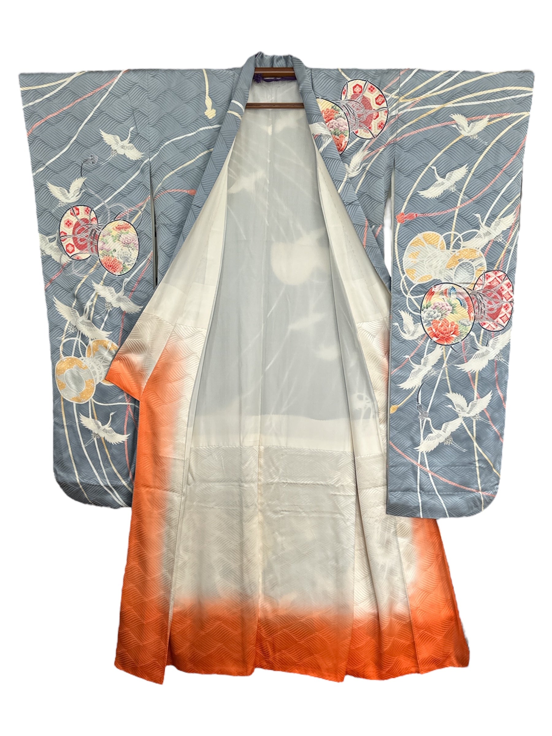 Stare: În stare bună, cu câteva pete mici pe eri (guler) care nu afectează frumusețea generală a piesei. Îmbinarea tehnicii tradiționale de vopsire manuală Yuzen, a broderiilor complexe și a imaginilor simbolice face din acest furisode un chimono remarcabil și bogat cultural, ideal pentru cele mai prețioase sărbători din viață.