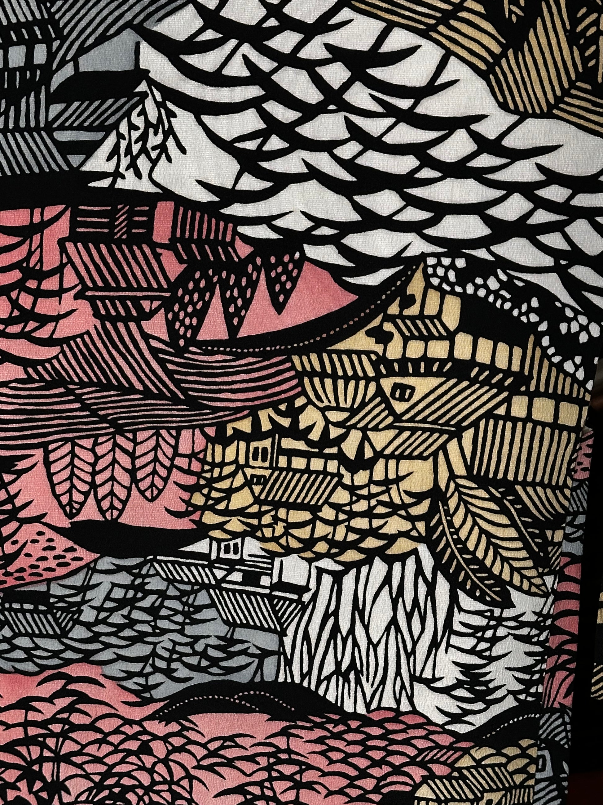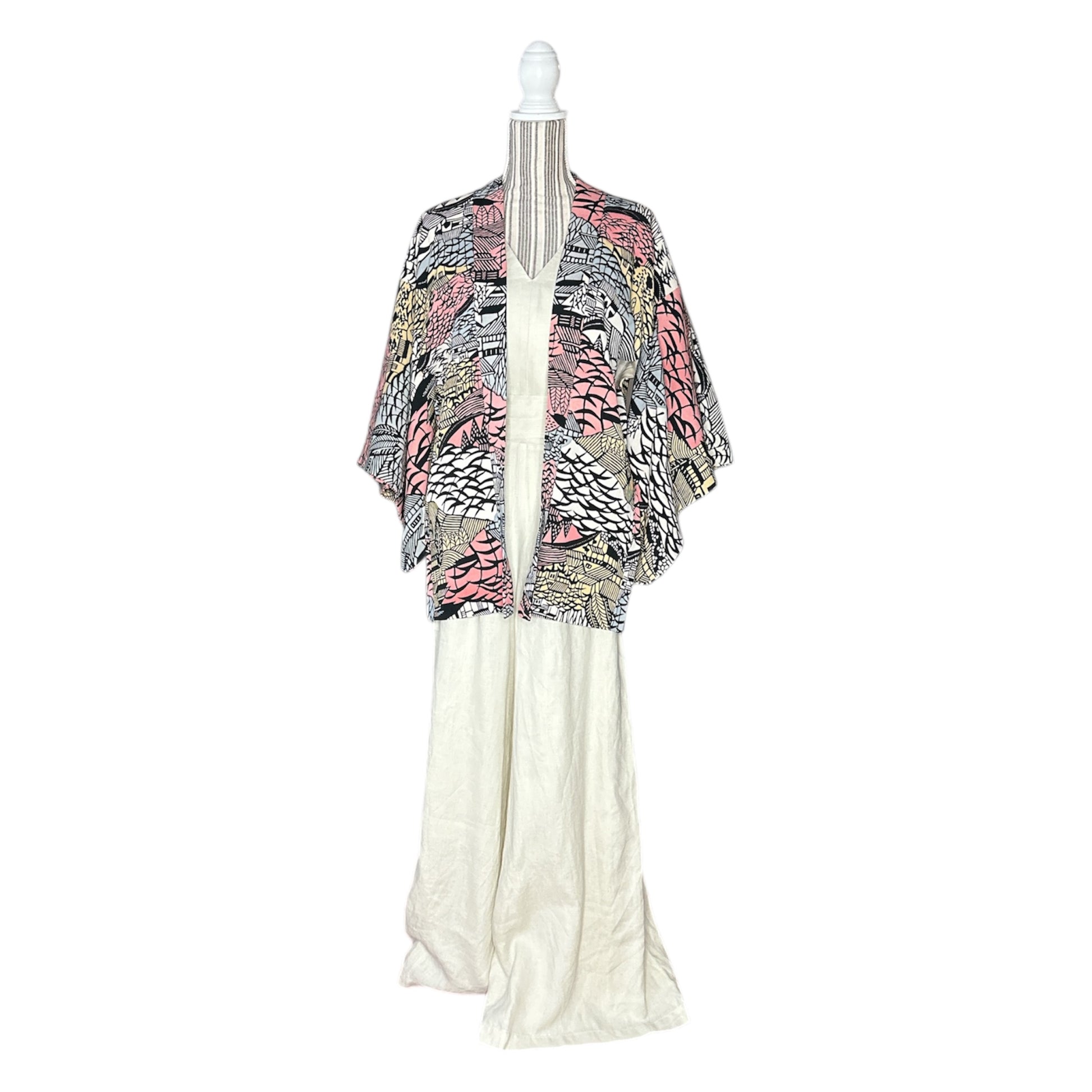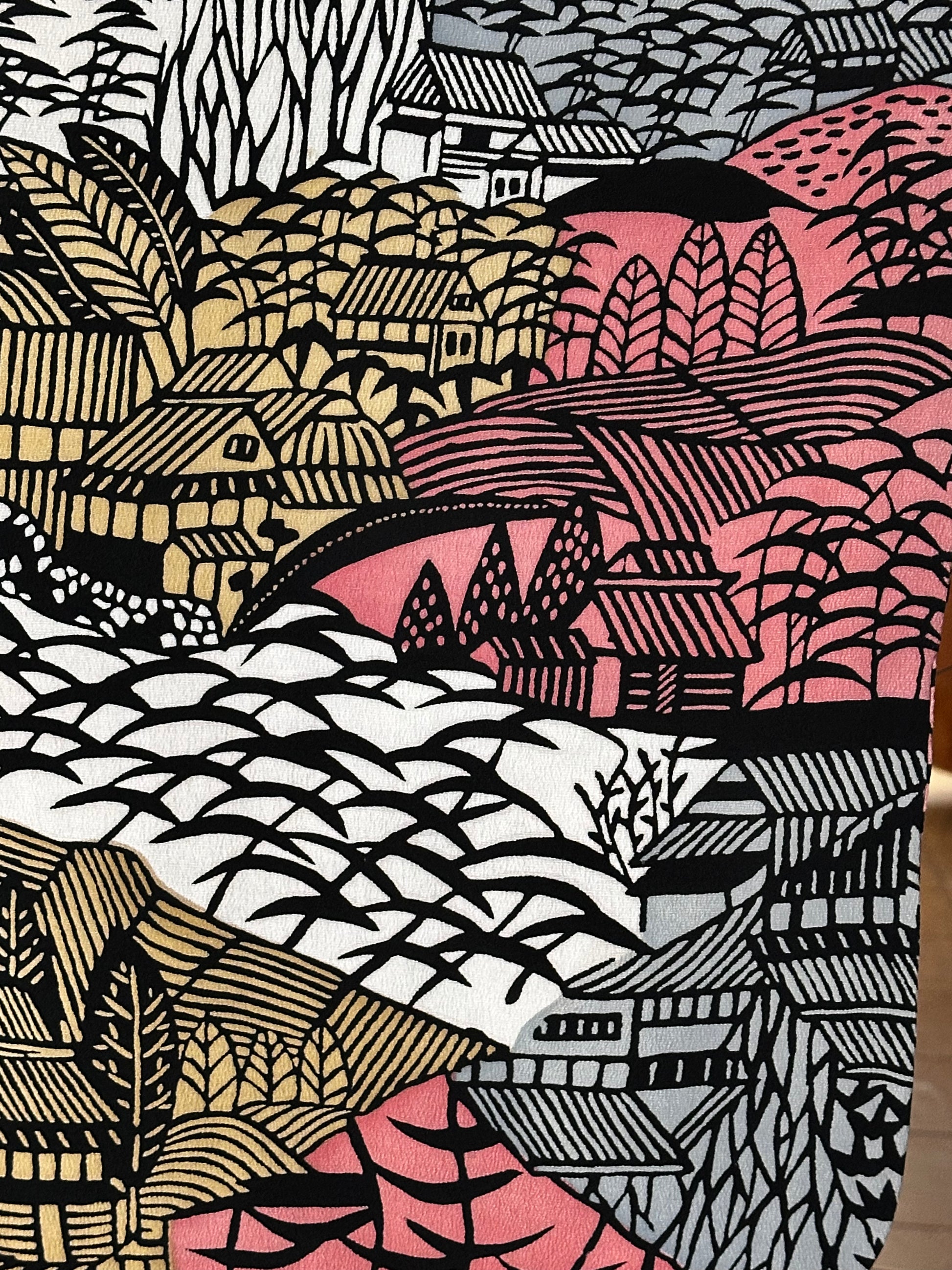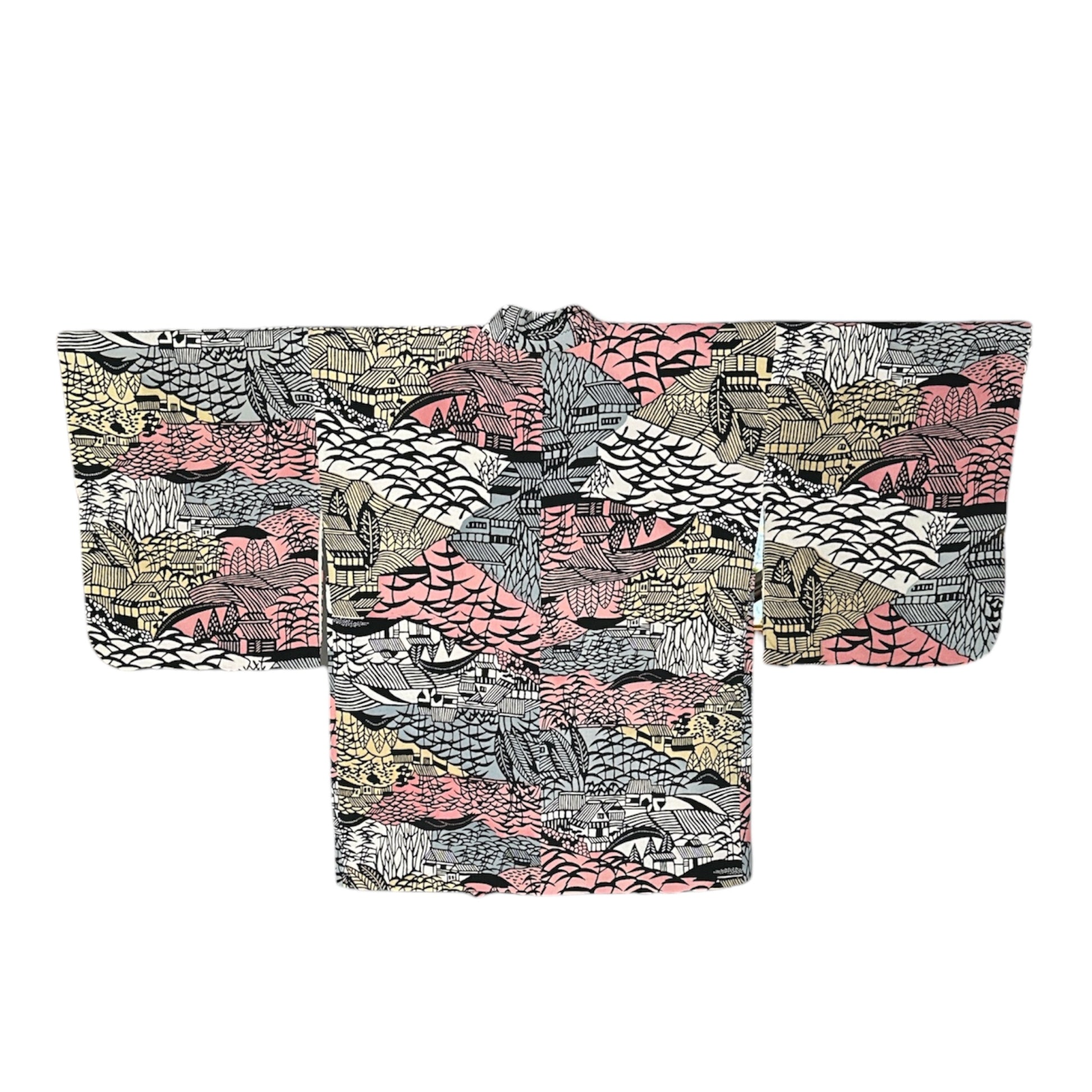 Descriere: Acest haori vintage pentru femei este confecționat din mătase și prezintă un model peisagistic pe toată suprafața. Designul prezintă o compoziție pastorală, combinând elemente naturale și arhitecturale pentru a înfățișa munți, scene sate și peisaje rurale. Paleta de culori este cu contrast puternic și grafică, îmbinând tonuri de fundal delicate cu linii îndrăznețe în prim-plan, oferind peisajului un aspect dinamic și izbitor din punct de vedere vizual, menținând în același timp eleganța.