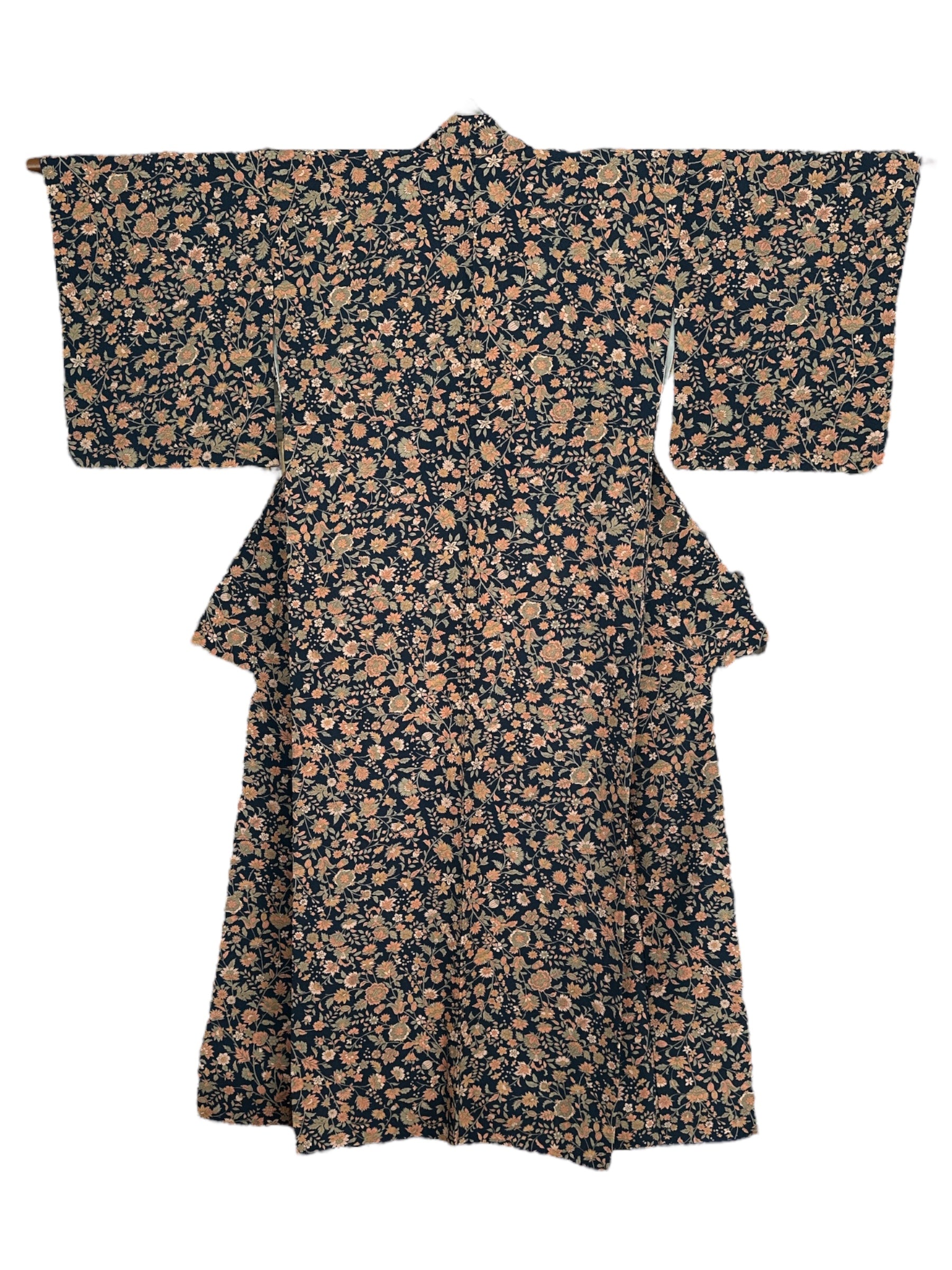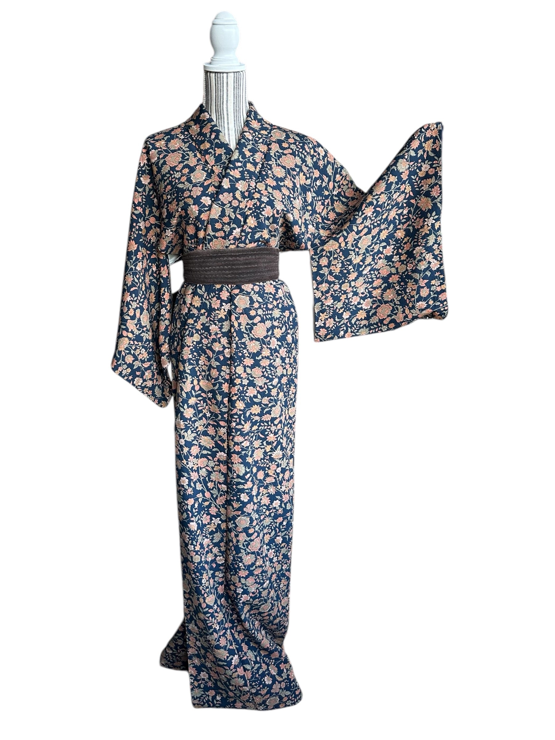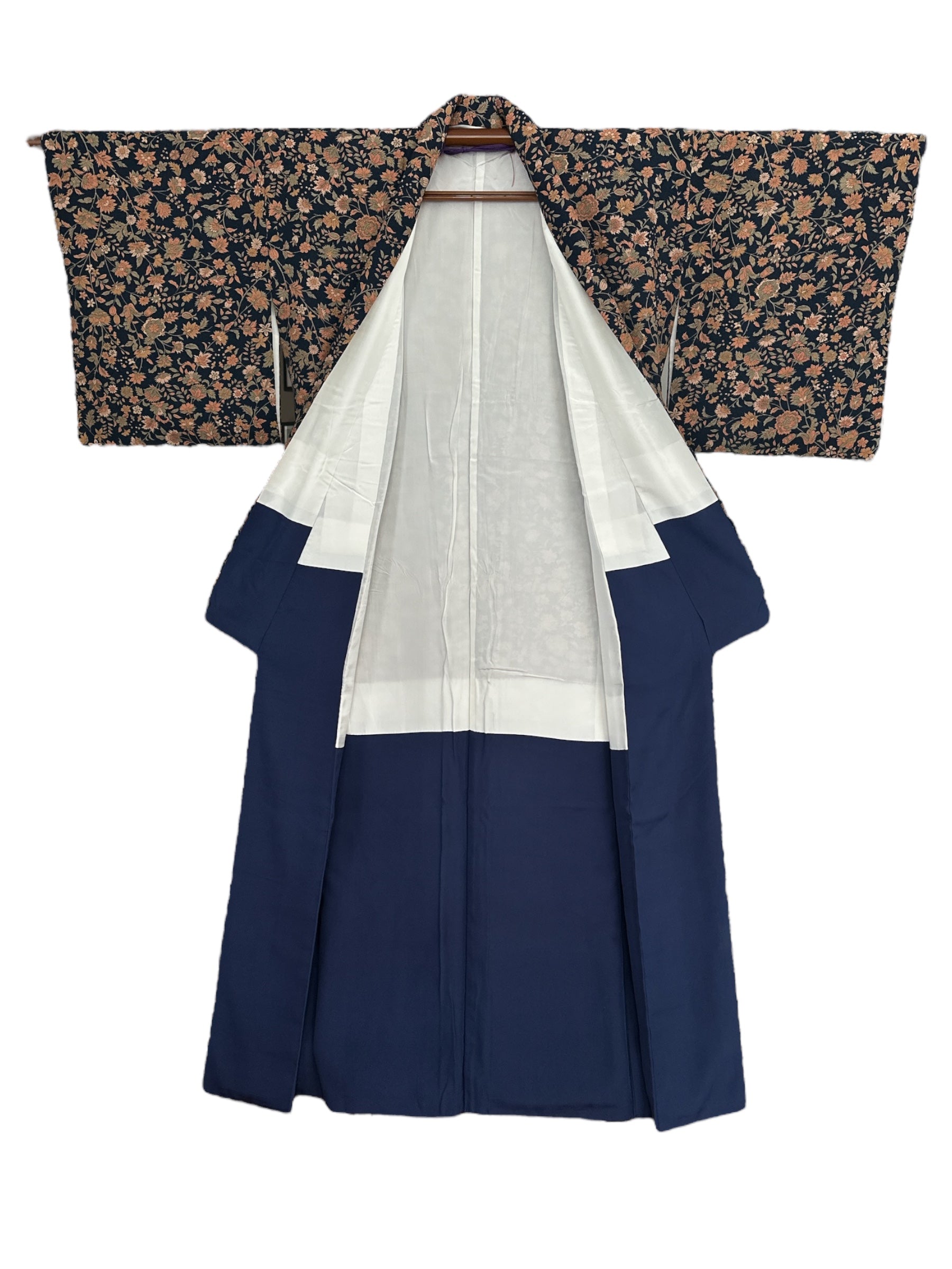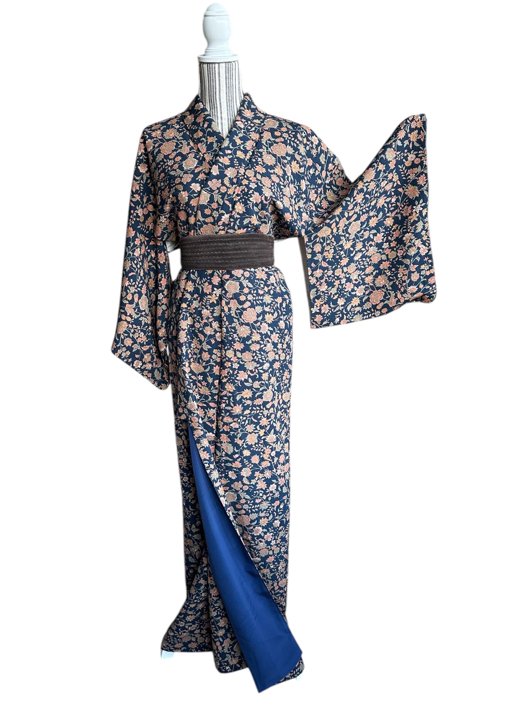 Kimono komon , această piesă este perfectă pentru ocazii casual până la semi-formale. Modelul floral integral îi conferă o estetică relaxată, dar rafinată, făcându-l un plus versatil pentru orice garderobă. Baza de indigo adâncă și florile maro creează o eleganță bogată, subestimată, potrivită pentru o varietate de setări.