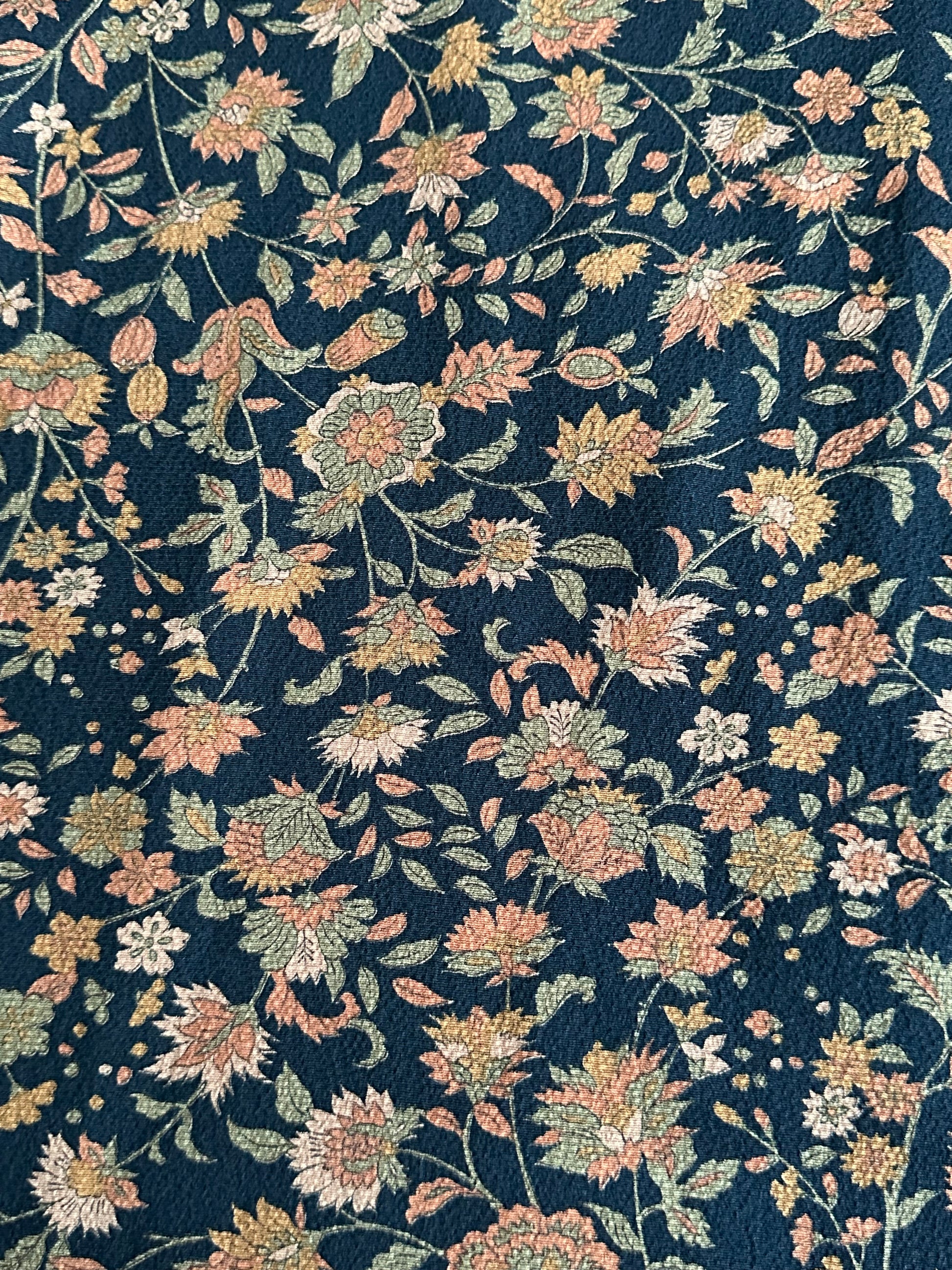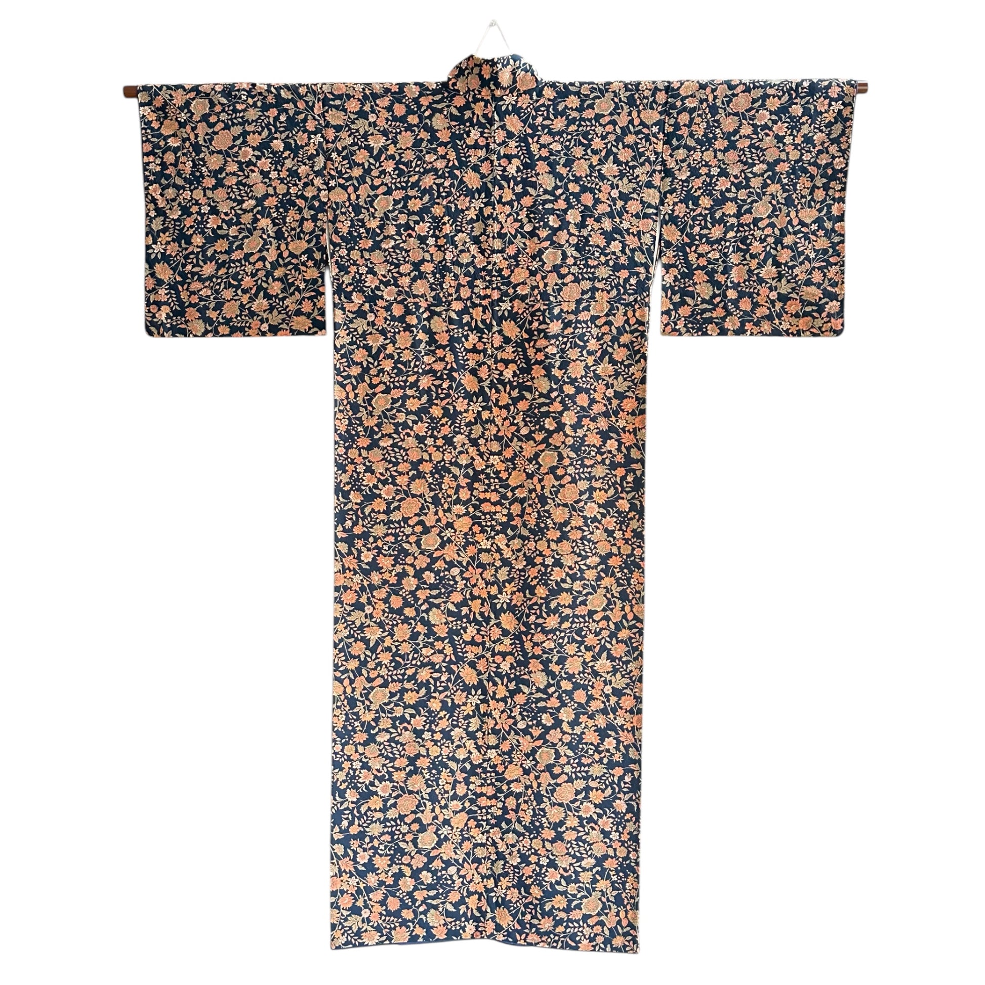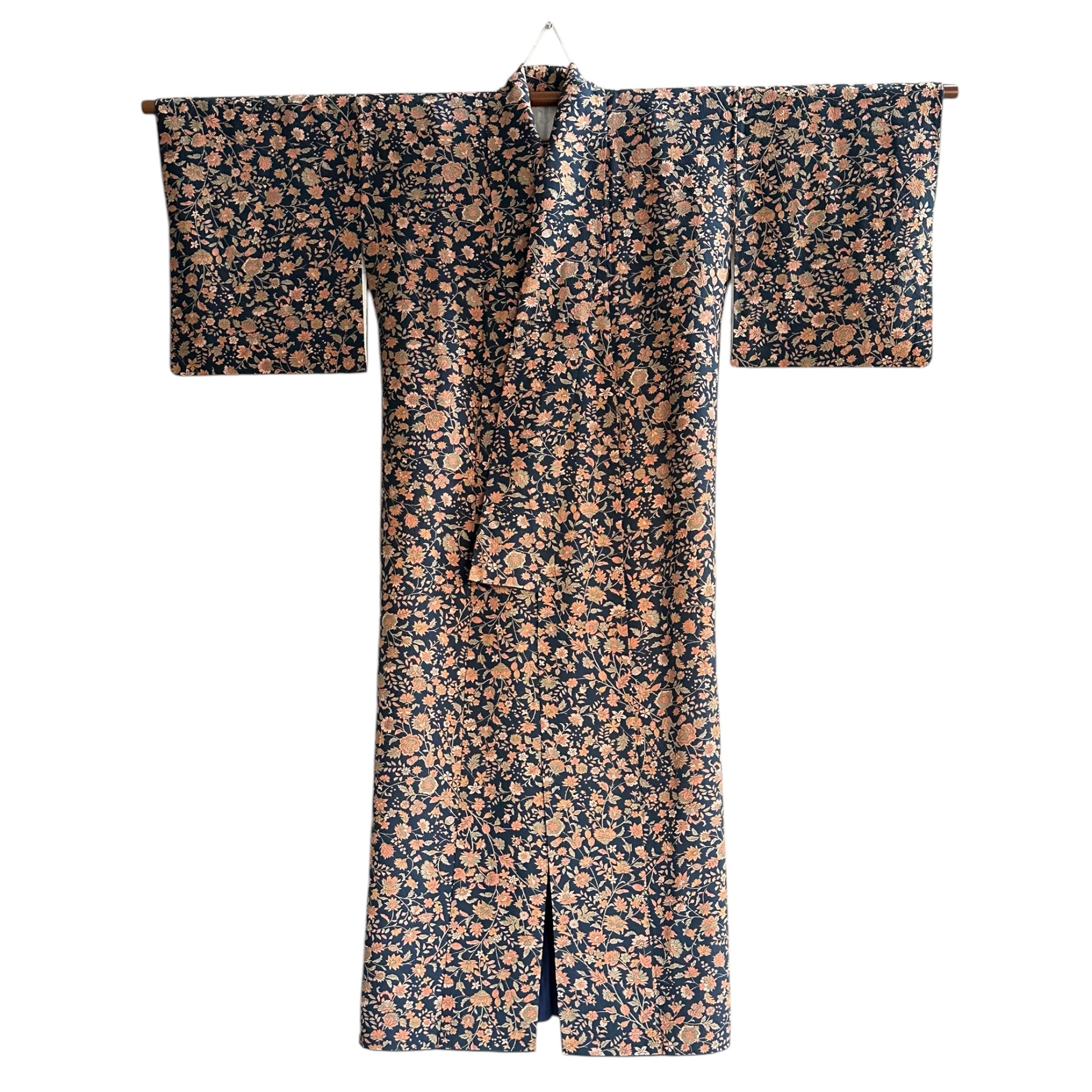 Kimono komon , această piesă este perfectă pentru ocazii casual până la semi-formale. Modelul floral integral îi conferă o estetică relaxată, dar rafinată, făcându-l un plus versatil pentru orice garderobă. Baza de indigo adâncă și florile maro creează o eleganță bogată, subestimată, potrivită pentru o varietate de setări.