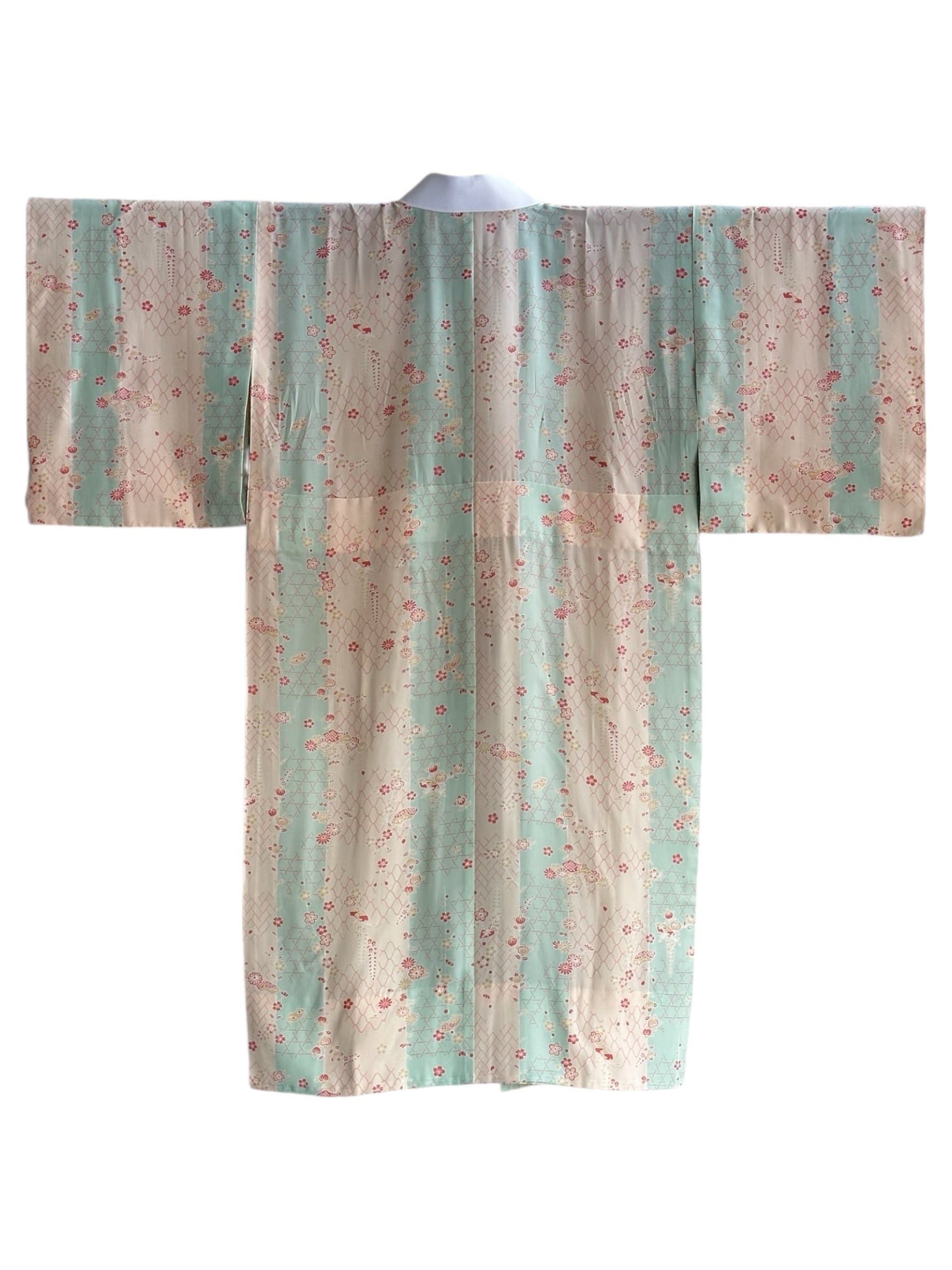 Style: The nagajuban's traditional cut provides a comfortable and functional fit, designed to maintain the shape of the kimono and enhance the layering effect. The soft pastel tones and the refined komon flower pattern make it a versatile piece that can complement a wide range of kimono styles.