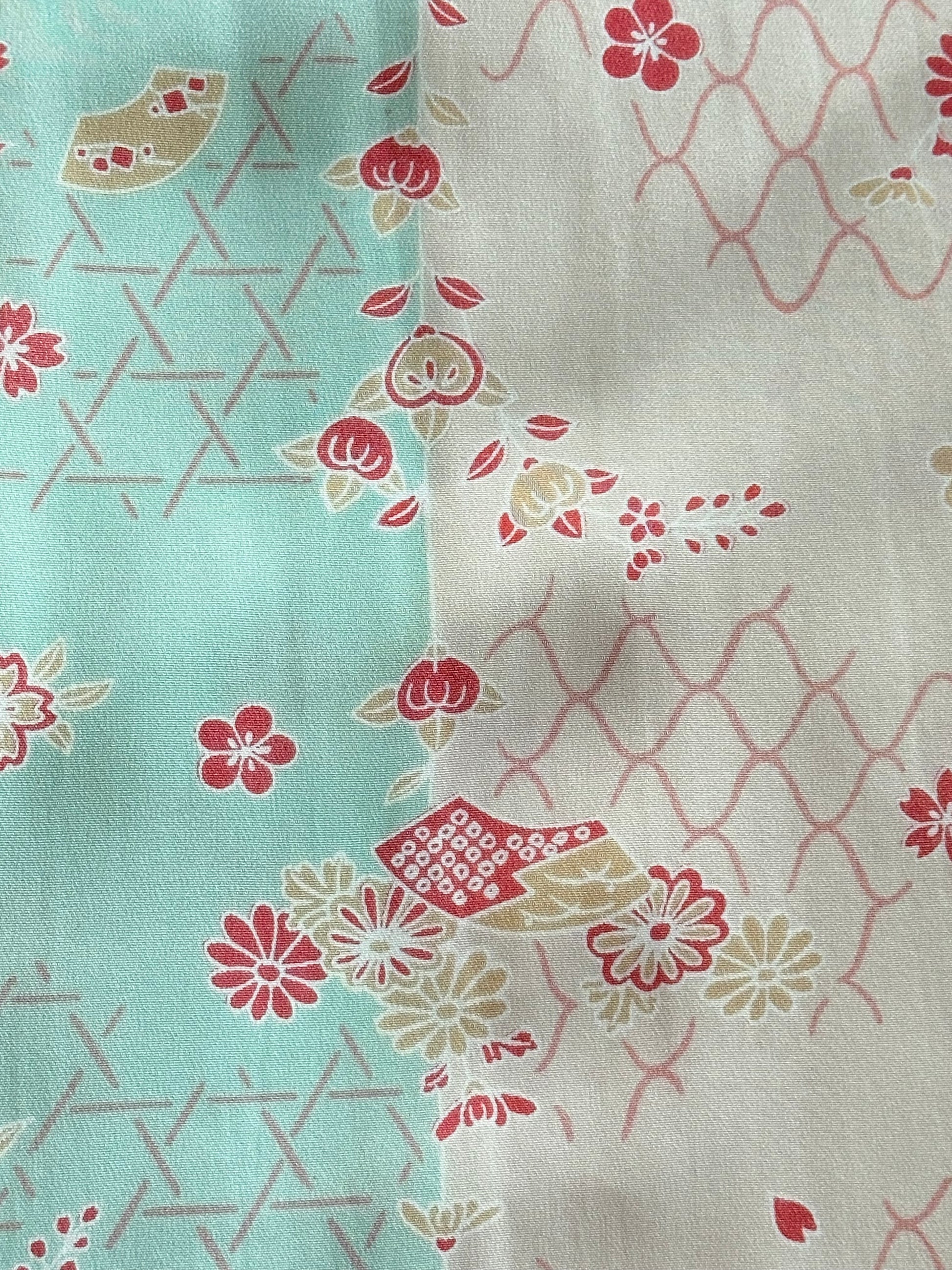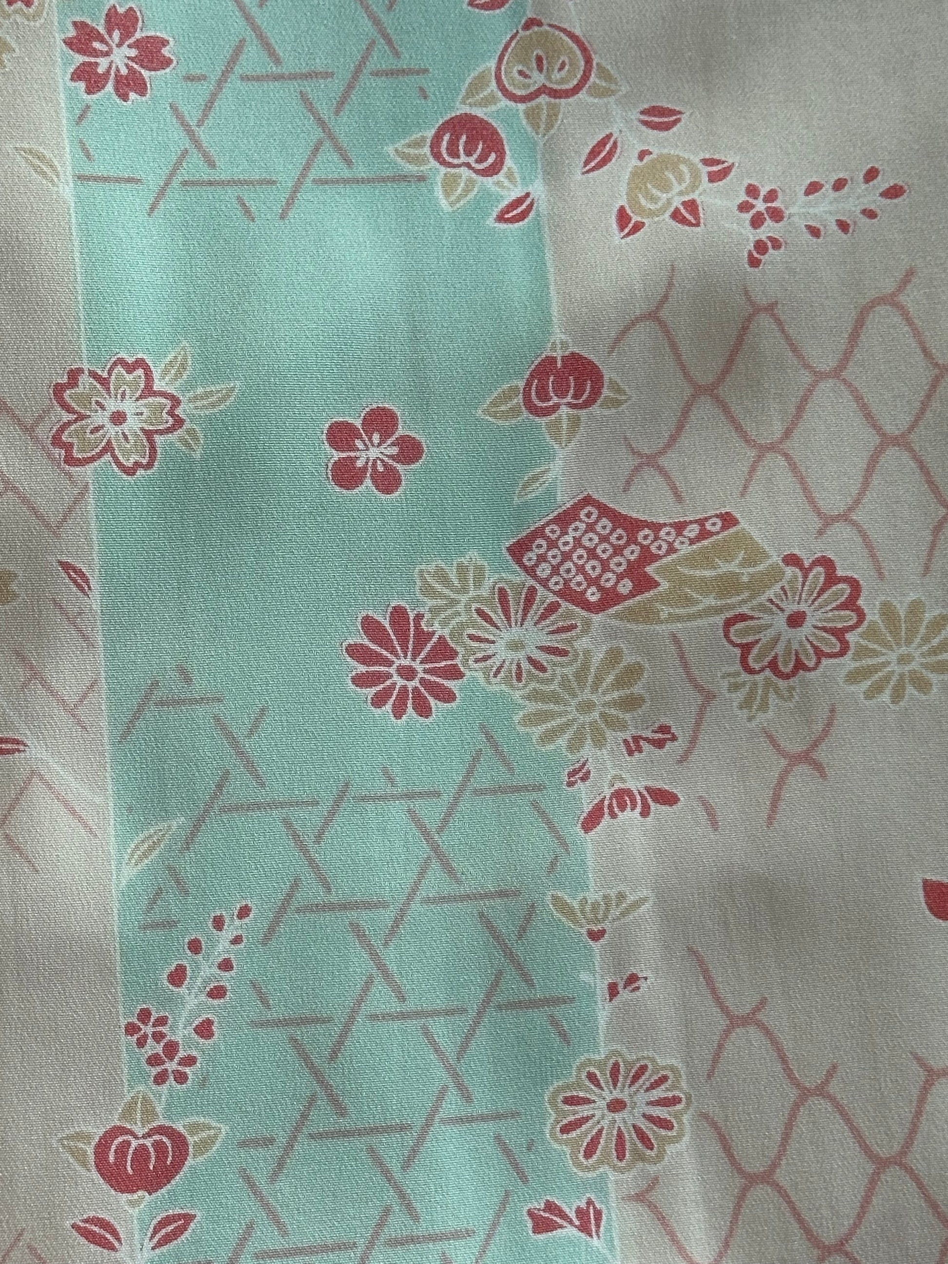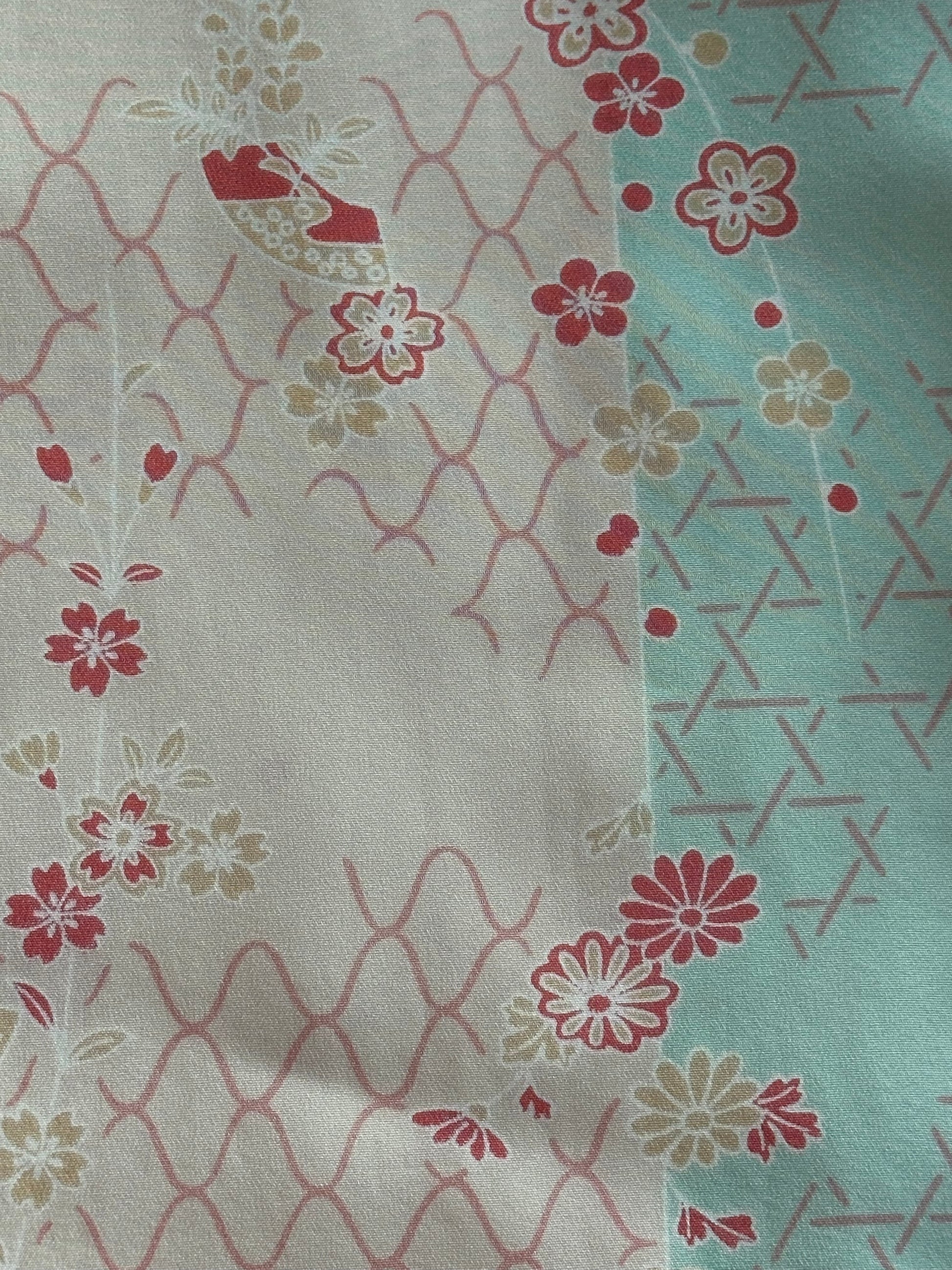 Fabric: Crafted from soft, lightweight fabric, this nagajuban has a smooth texture that feels gentle on the skin. The combination of pastel colors and the delicate floral komon pattern make it an elegant undergarment, ideal for protecting the kimono lining while enhancing the overall appearance.