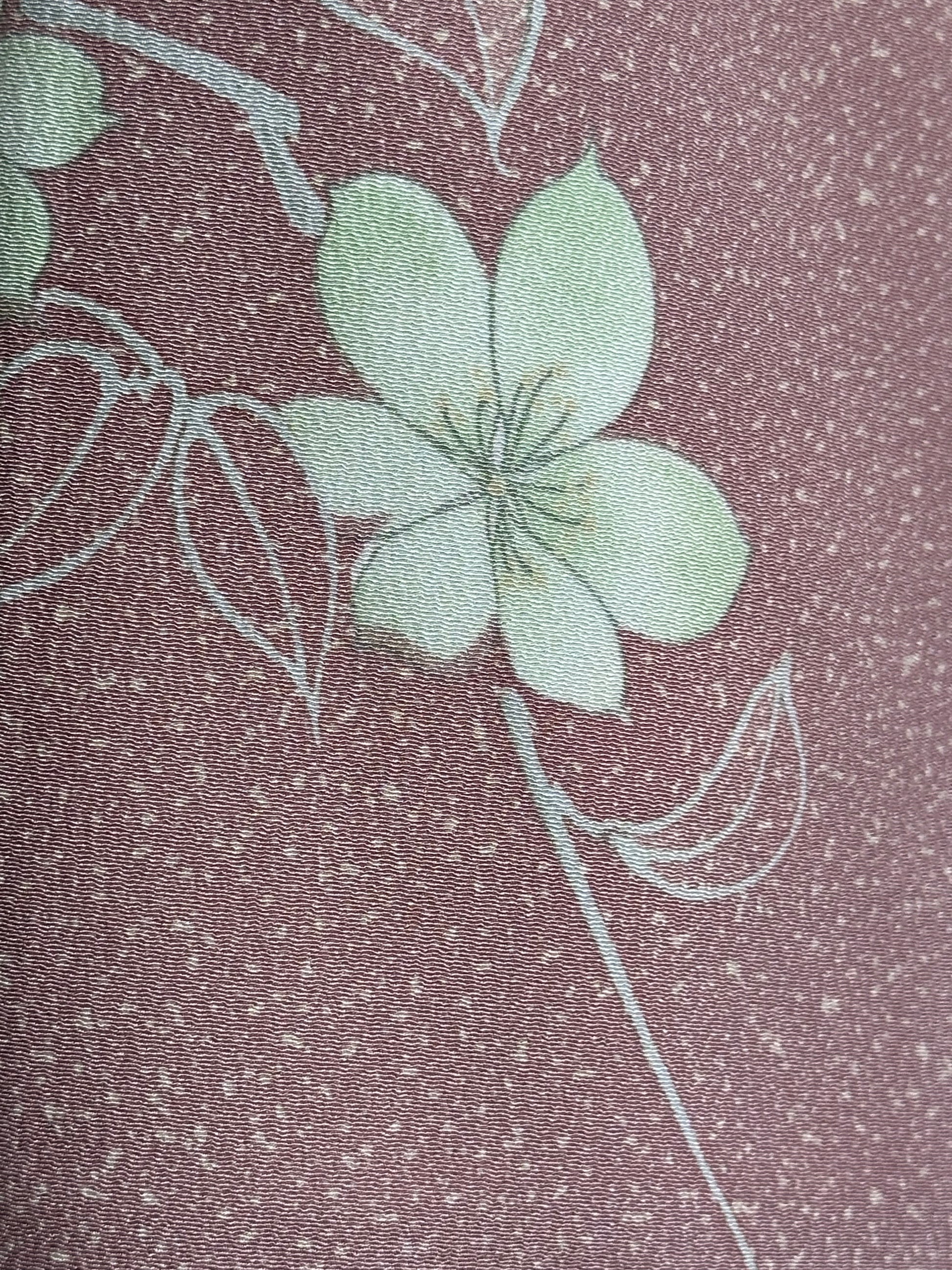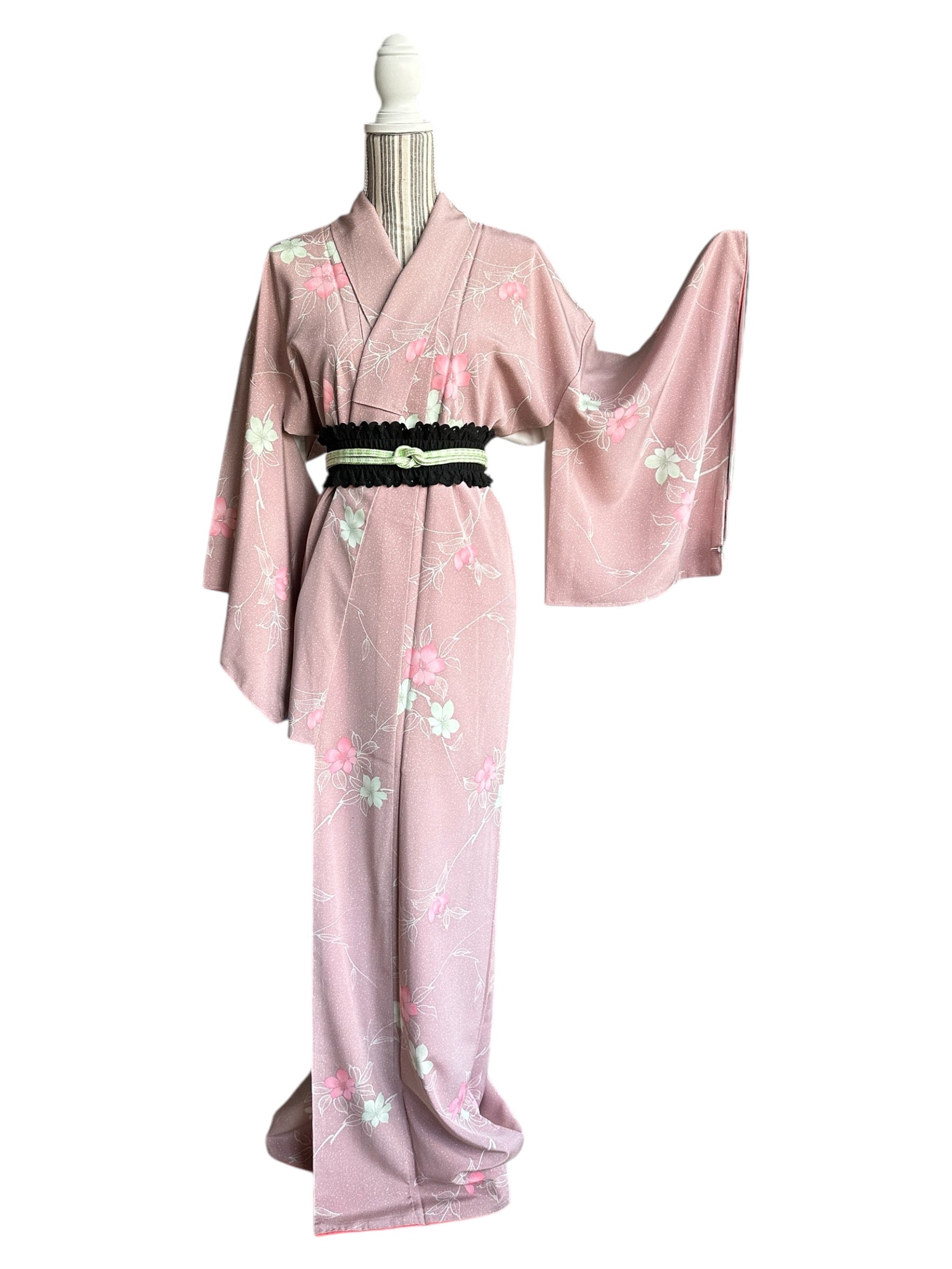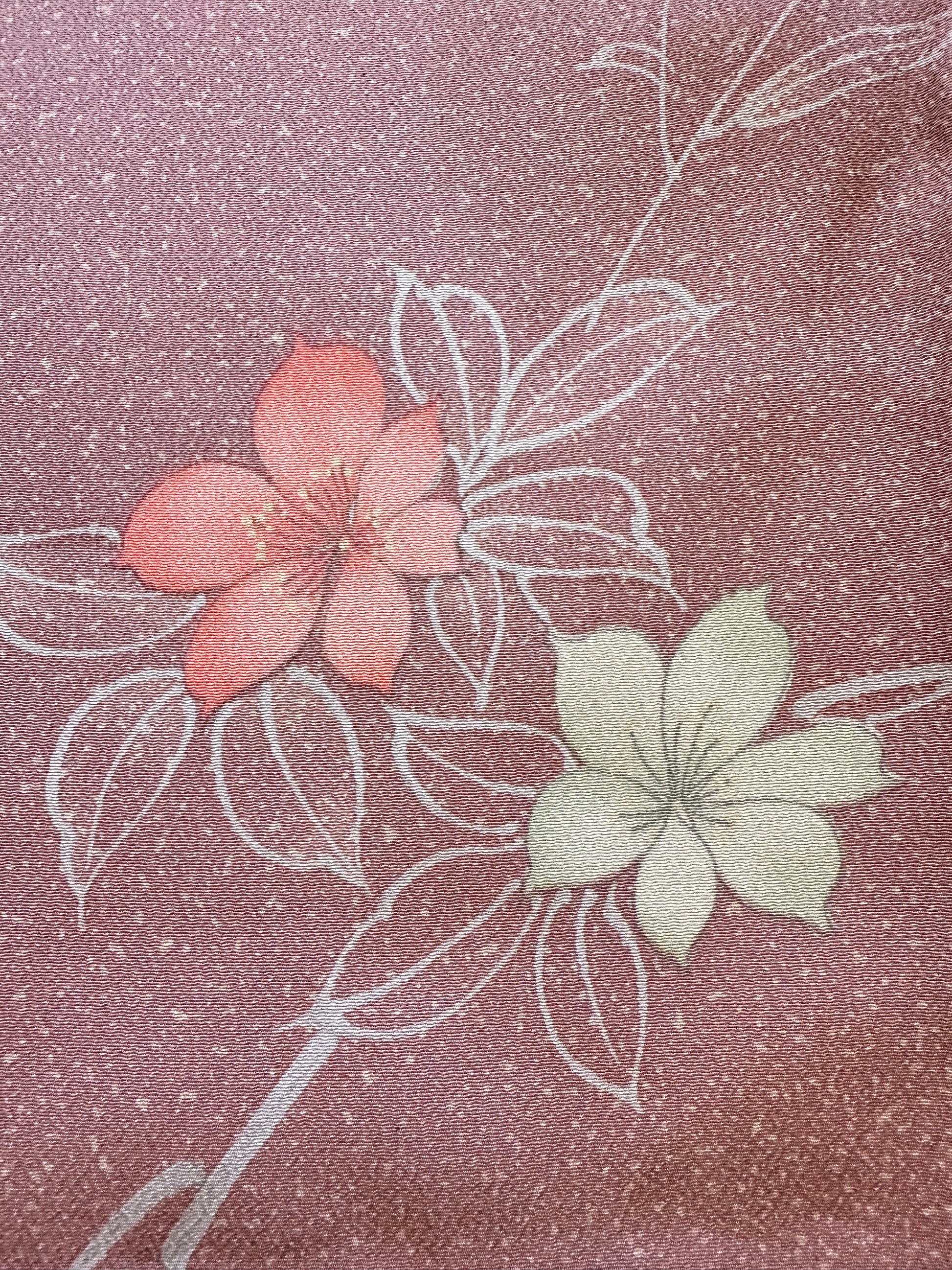 Stil: În conformitate cu stilul tradițional komon , modelul floral acoperă întregul kimono, permițându-i să radieze o sofisticare discretă. Florile pictate aduc un sentiment de frumusețe organică, cu pensulele delicate care adaugă profunzime și un farmec atemporal țesăturii delicate roz pal.