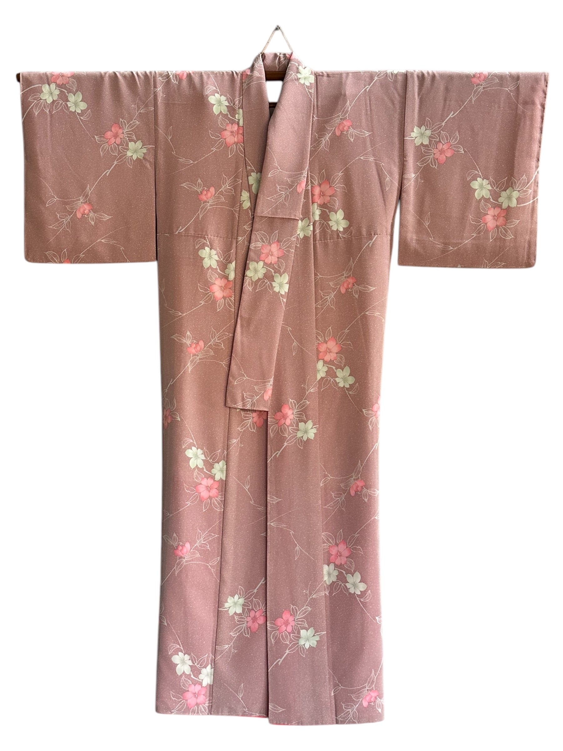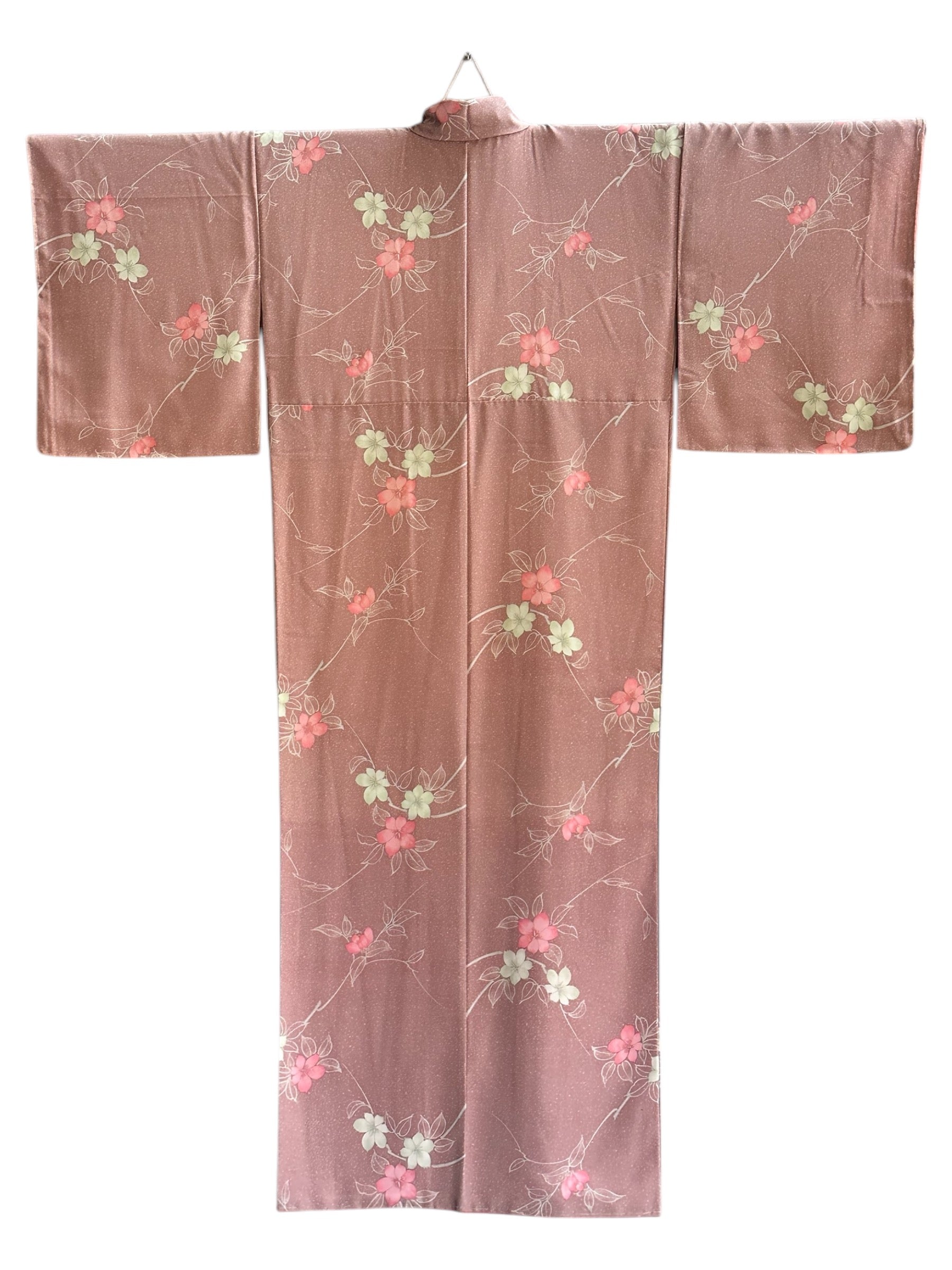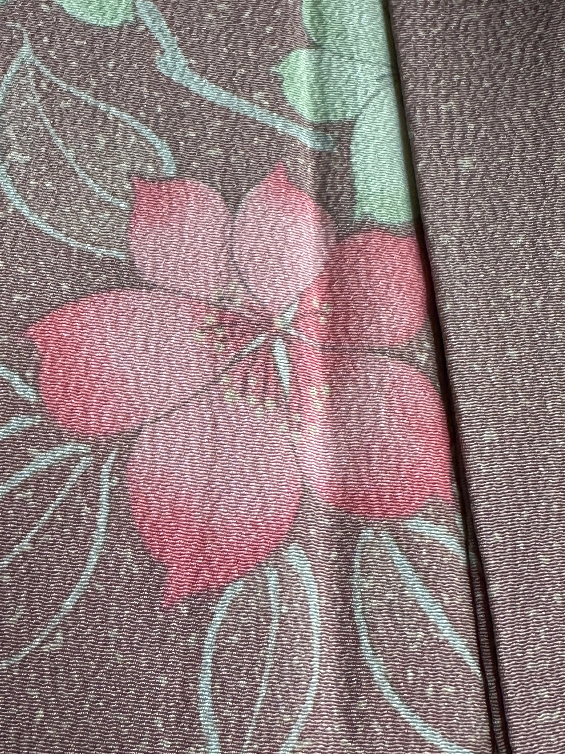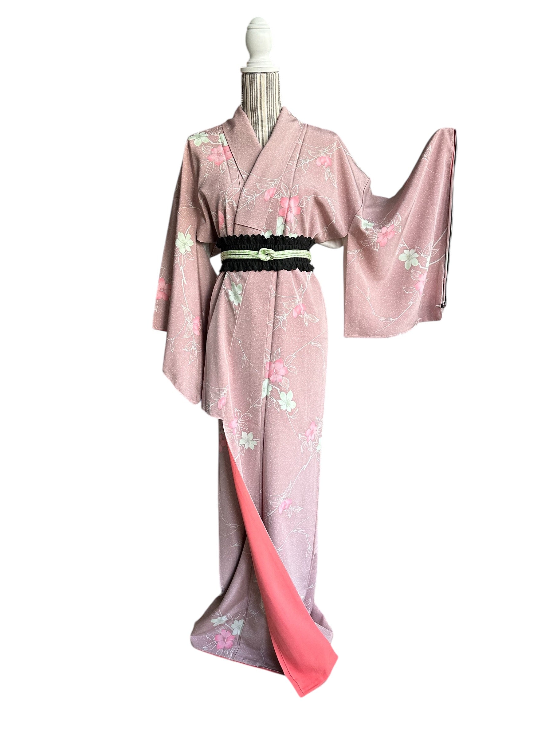 Stil: În conformitate cu stilul tradițional komon , modelul floral acoperă întregul kimono, permițându-i să radieze o sofisticare discretă. Florile pictate aduc un sentiment de frumusețe organică, cu pensulele delicate care adaugă profunzime și un farmec atemporal țesăturii delicate roz pal.