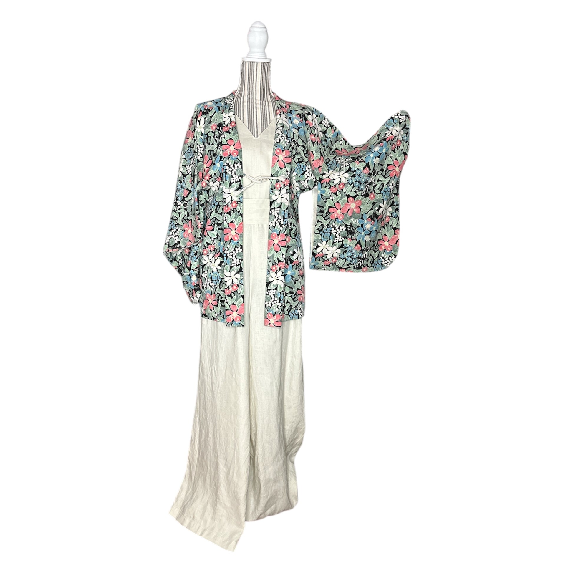 Stare: Vintage în stare bună. Mătasea este bine conservată, culorile rămân clare și echilibrate, iar căptușeala și haori himo sunt intacte, prezentând doar o uzură ușoară, corespunzătoare vârstei.