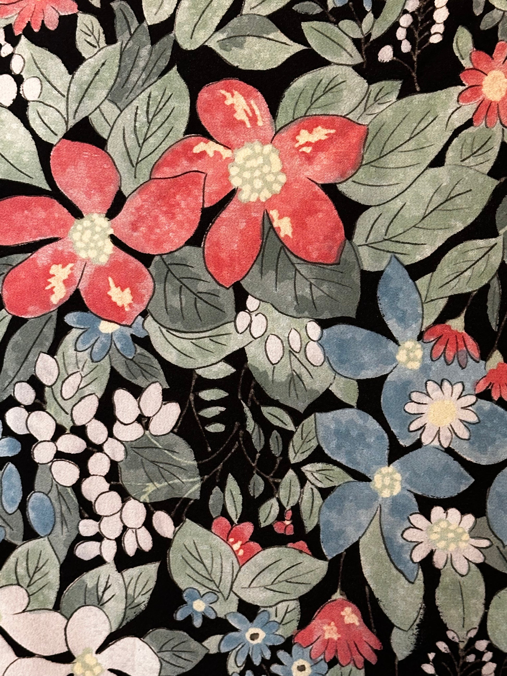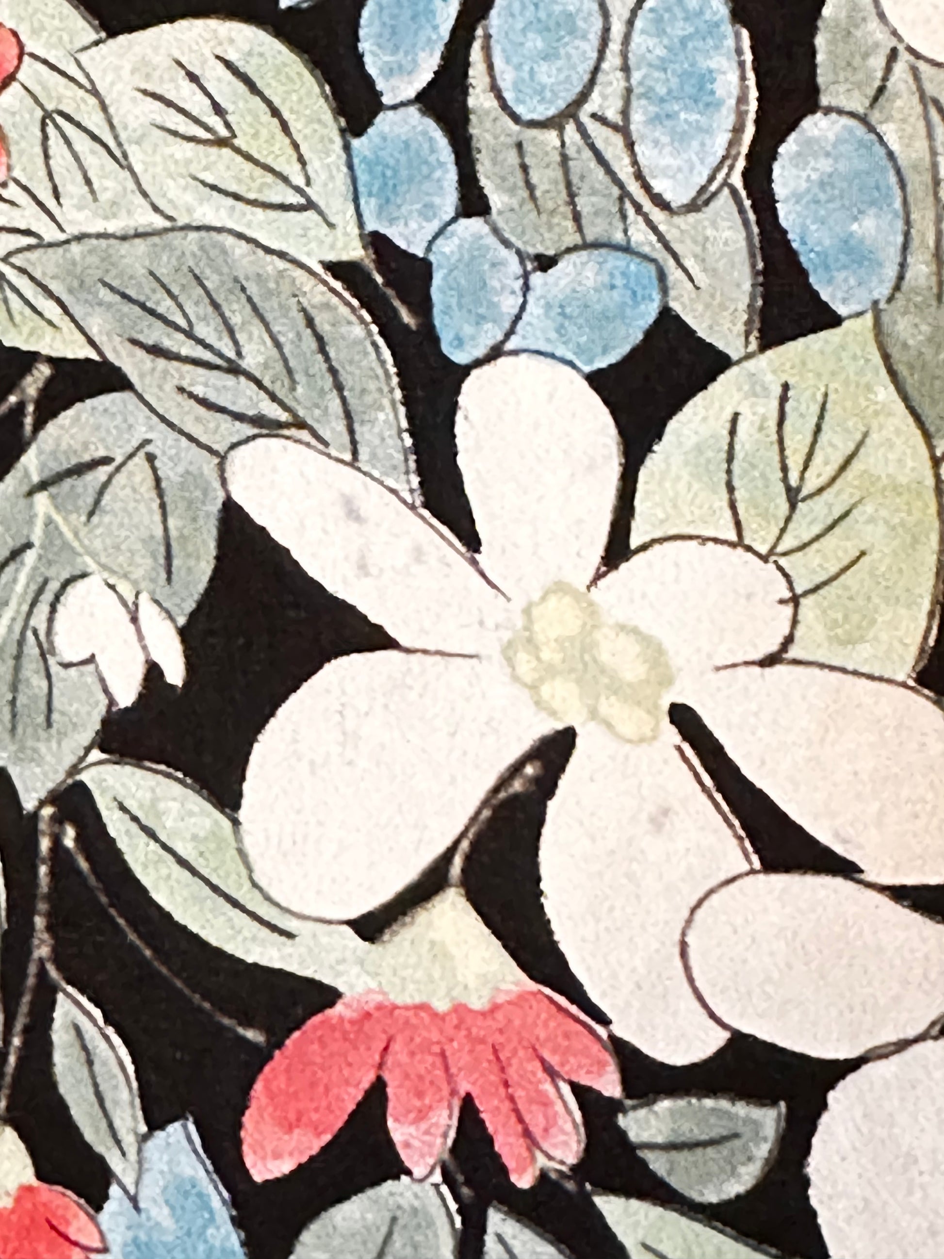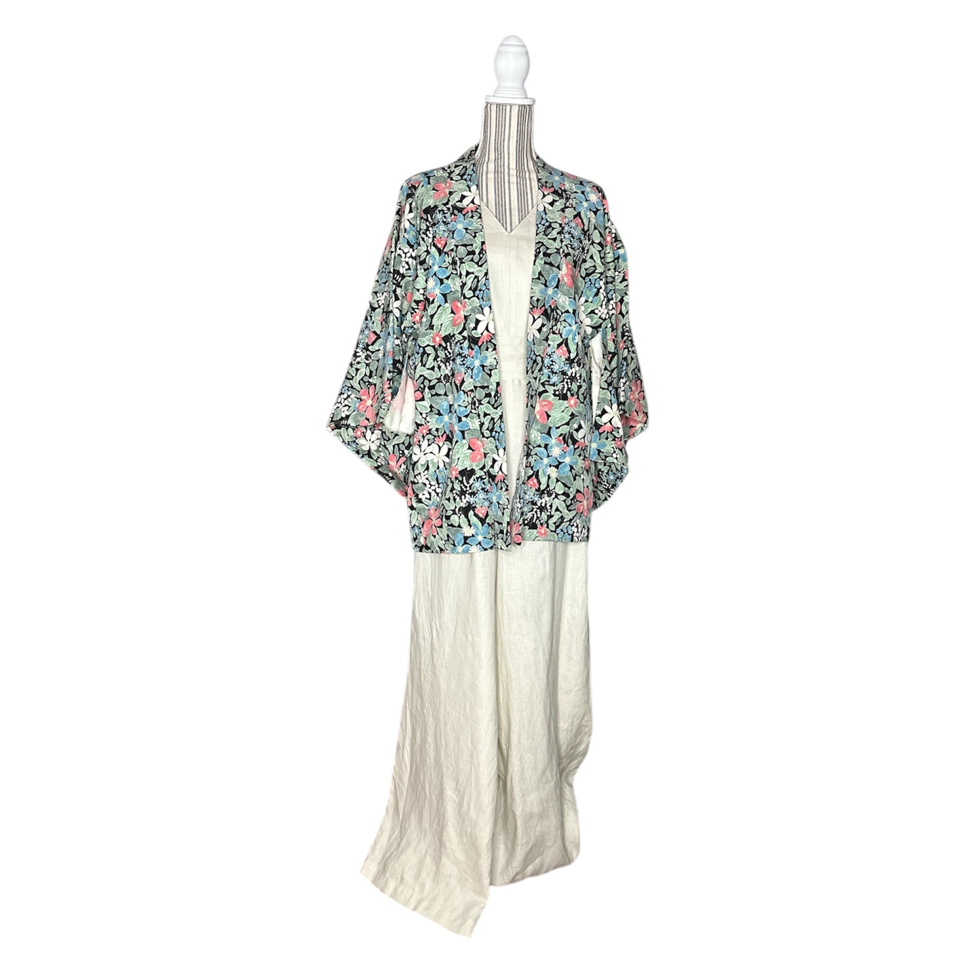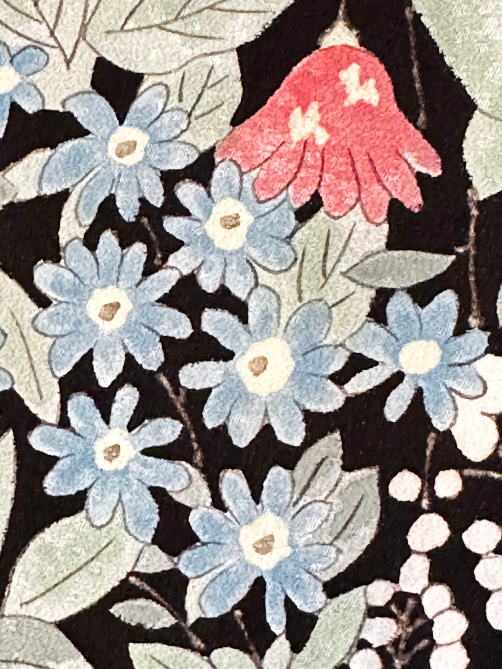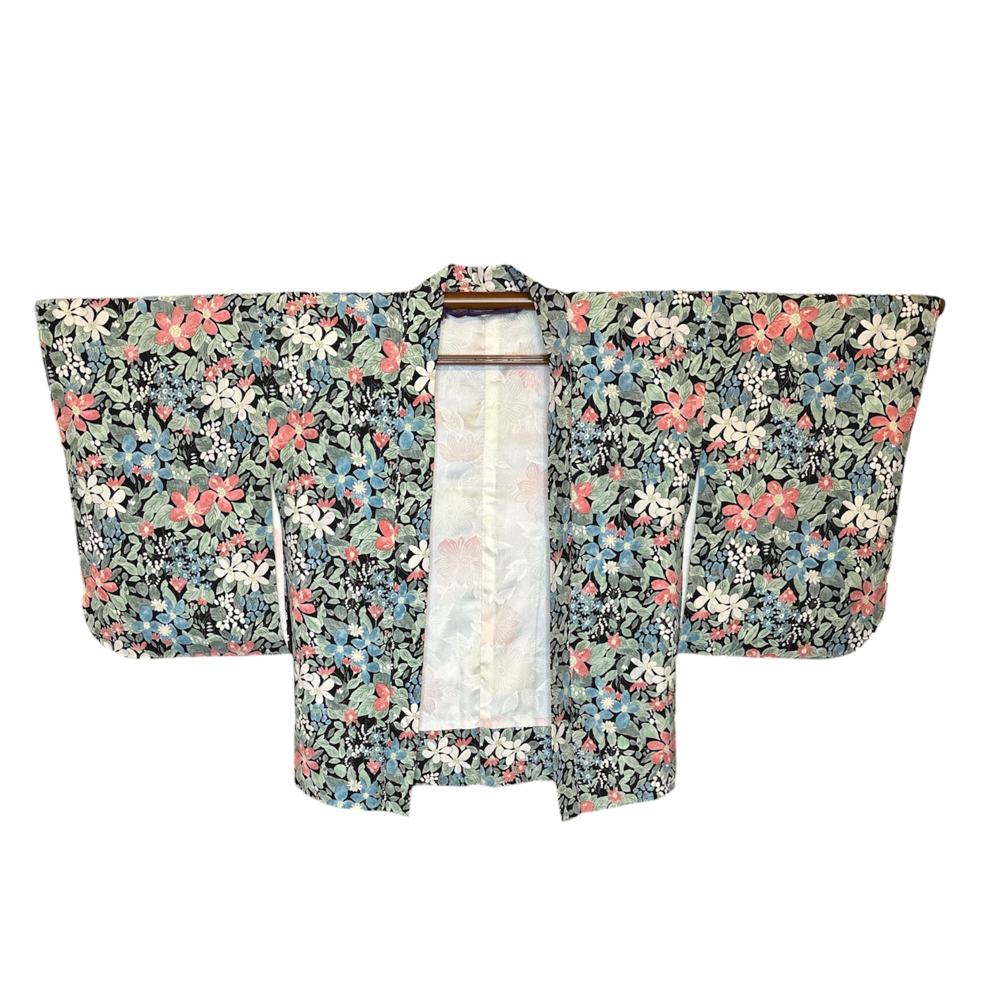 Descriere: Acest haori vintage pentru femei este un exemplu rafinat de eleganță japoneză de zi cu zi, realizat din mătase în stilul clasic komon . Baza neagră este împodobită cu motive pictate manual în tonuri pământii, dar vibrante - albastru deschis, verde, roz-roșu și alb moale, estompat - creând o compoziție armonioasă și artistică. Pictat folosind metode tradiționale, designul are o calitate fluidă, organică, care se simte atât expresiv, cât și echilibrat.